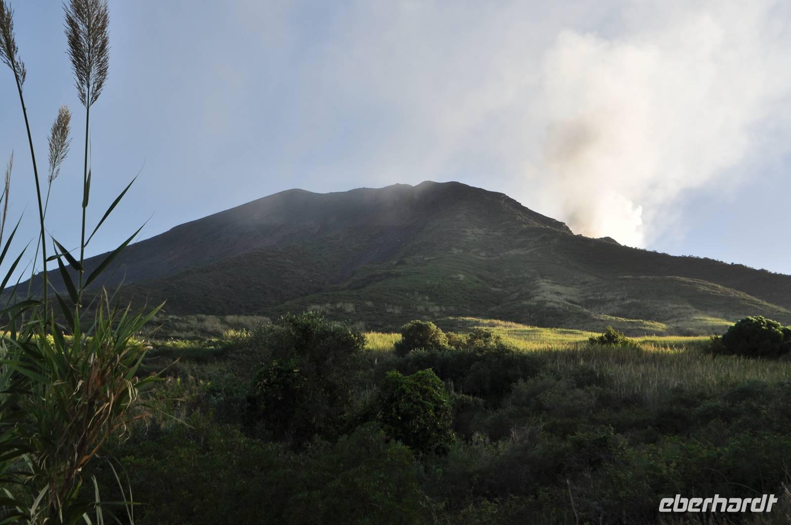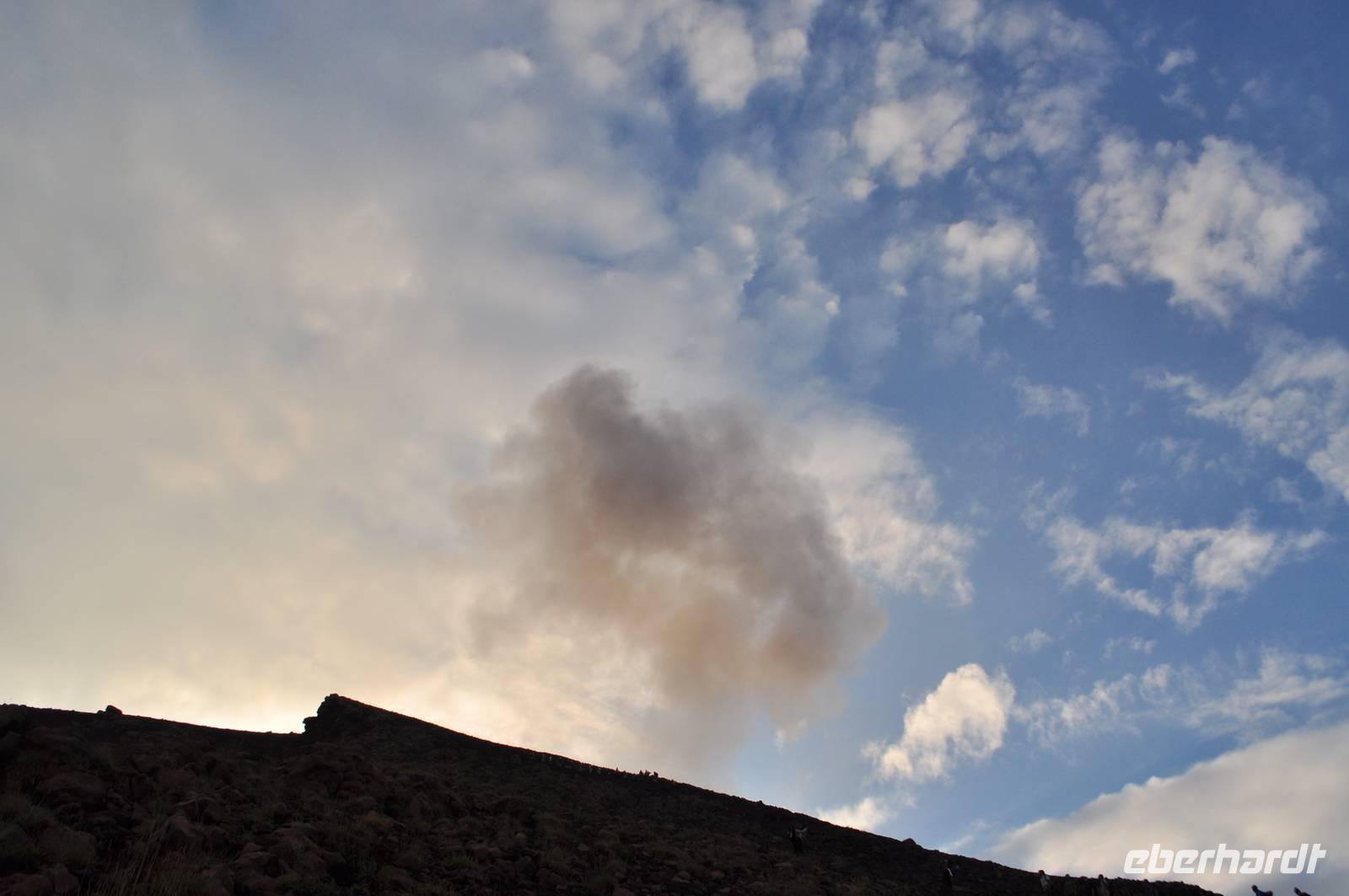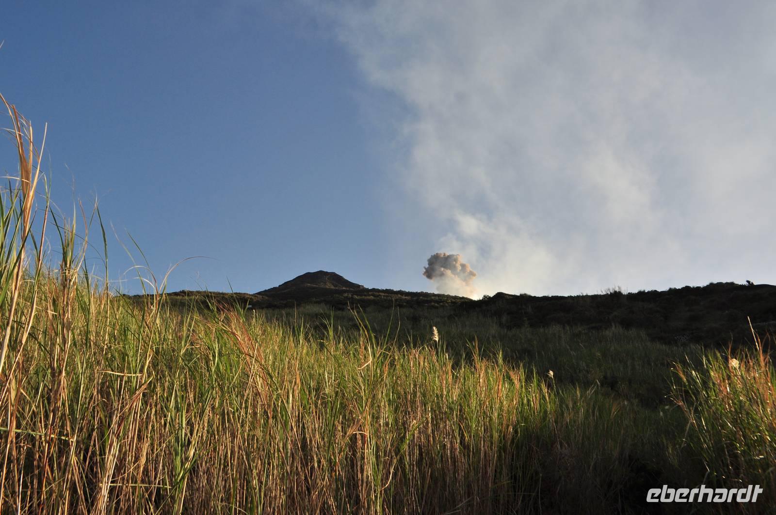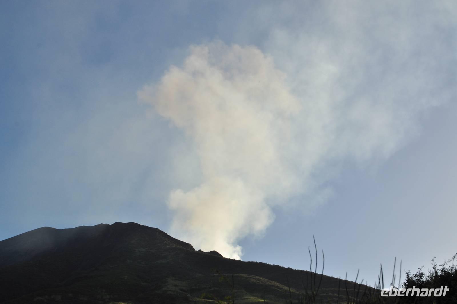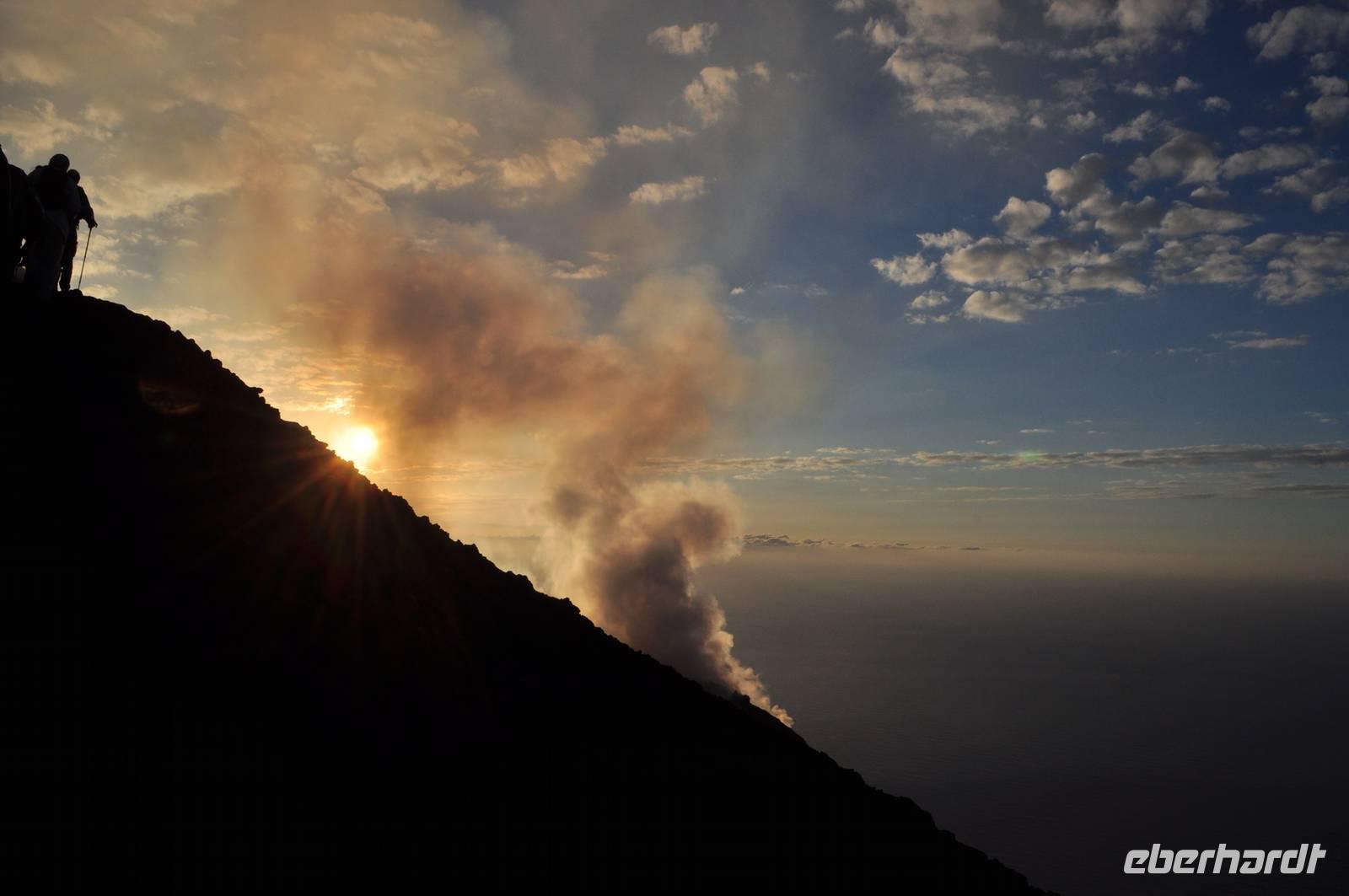 Wir sitzen auf dem Gipfelgrat in ca. 942m Höhe. Die Sonne ist untergegangen. Kurz vor den Eruptionen nehmen wir ein Grollen wahr, dann bricht er aus. Eine Gas- und Tephrawolke wird ausgestoßen. Rotglühendes Material fliegt durch die Luft und lagert sich im Krater ab. Ein beeindruckendes Naturschauspiel.