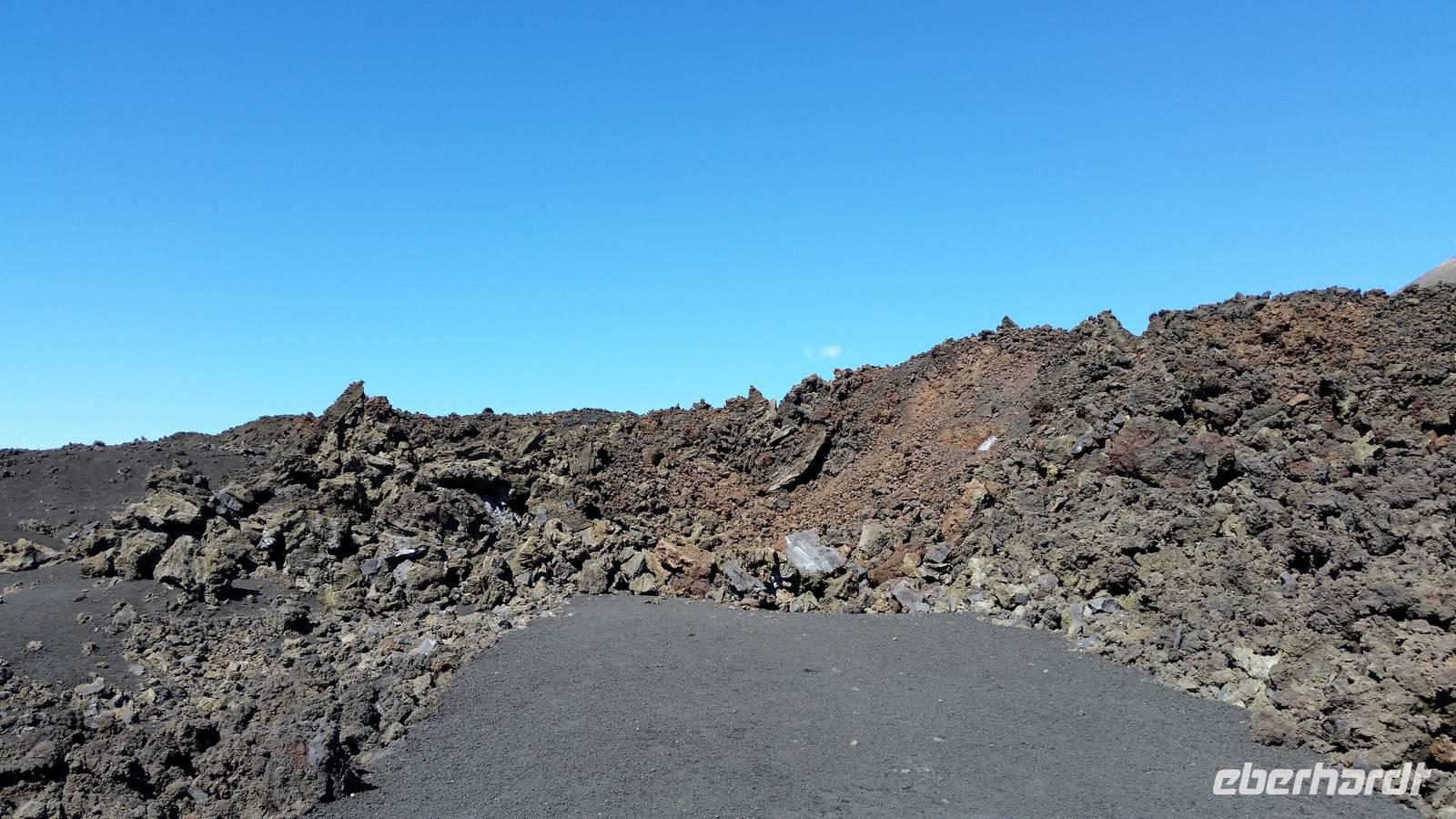 Am Rand des Lavastrom von 2013, am Fuß von Zentralkrater und Bocca Nuova auf der Hochebene Piano del Lago ist finden wir ein ideales sonniges Plätzchen (immer noch auf über 3.000m Höhe) für eine Verpflegungspause. Es ist weit nach 12 Uhr, das ist allen Beteiligten nach dem gerade Erlebten egal.