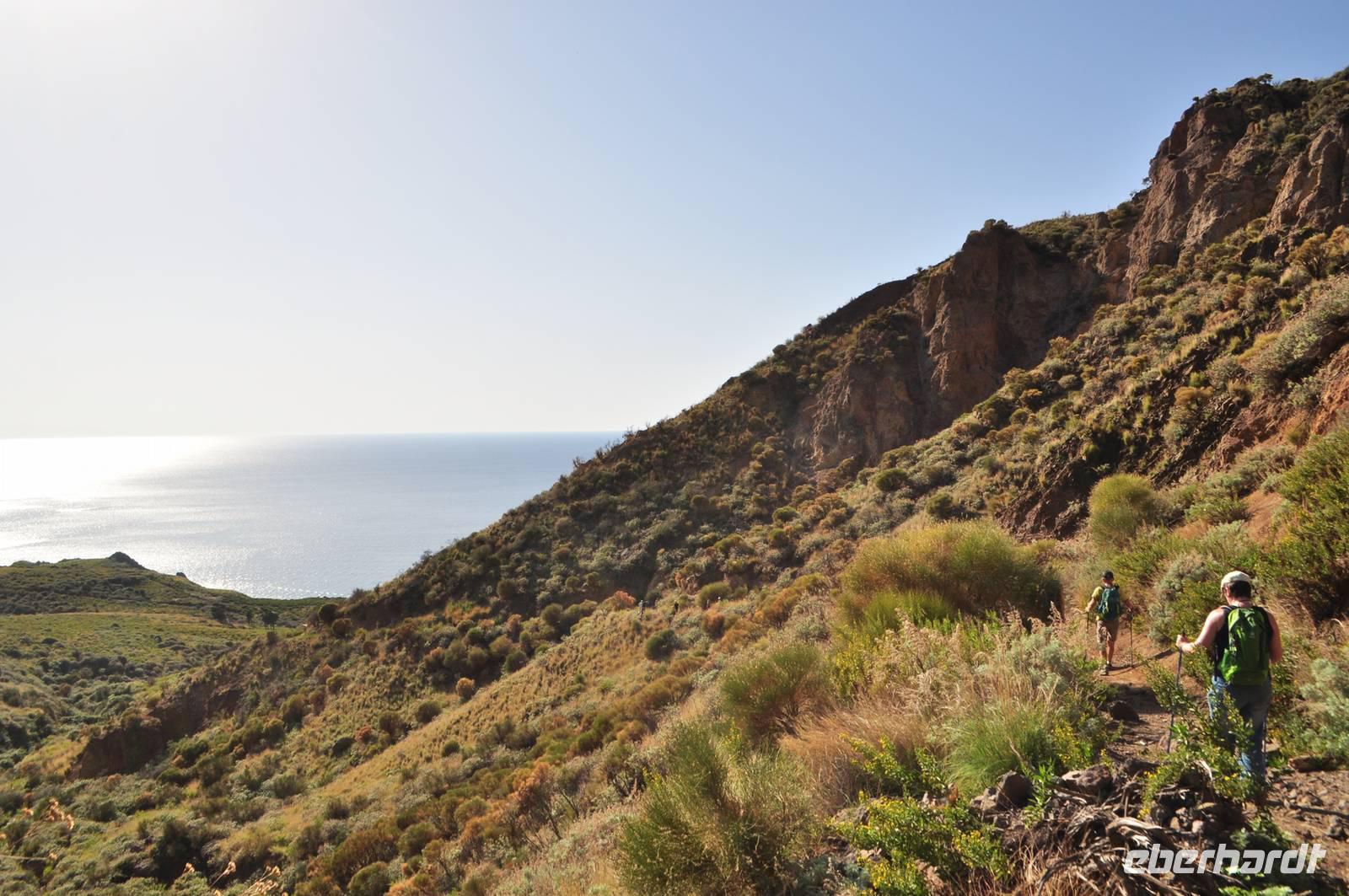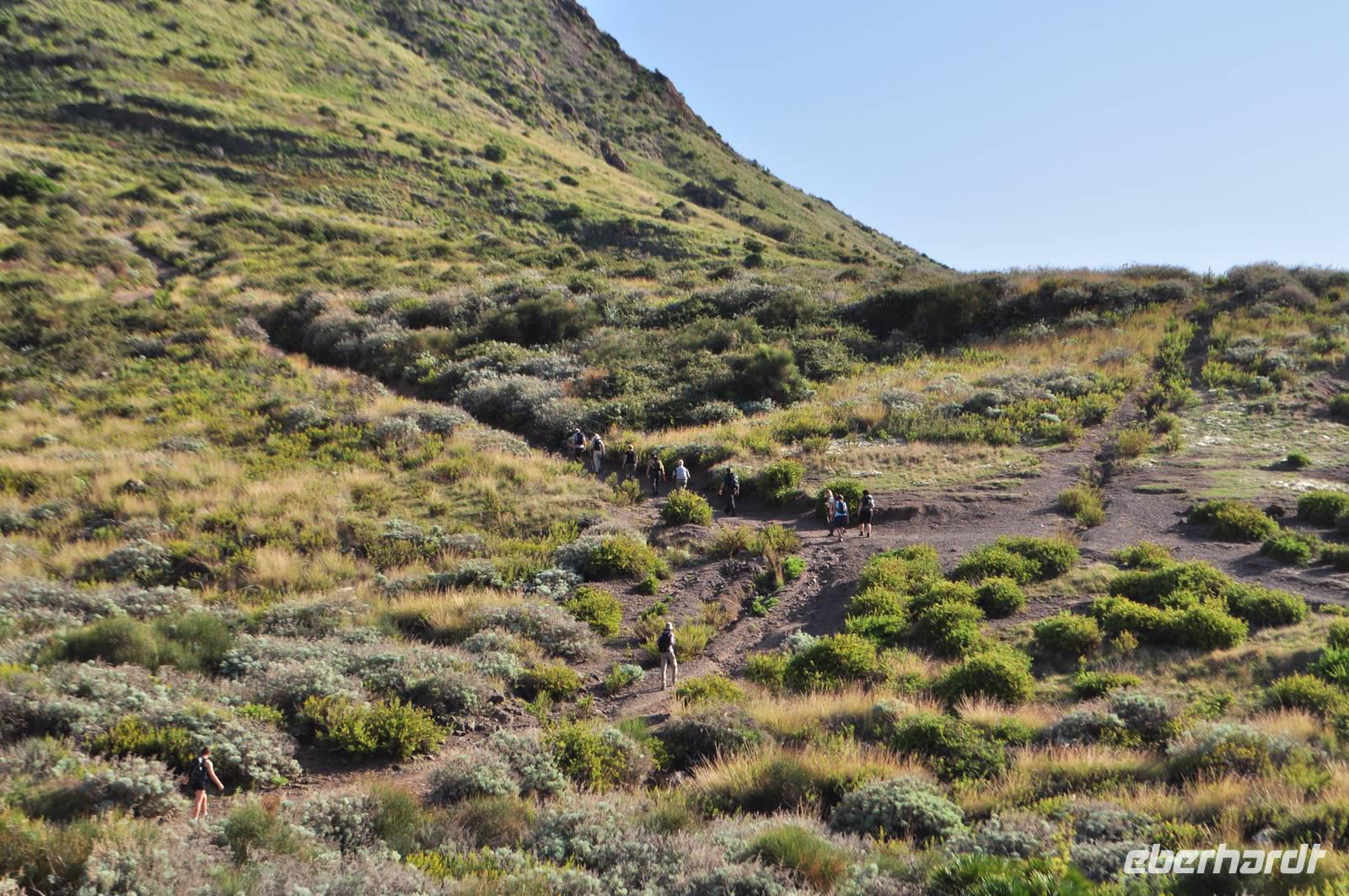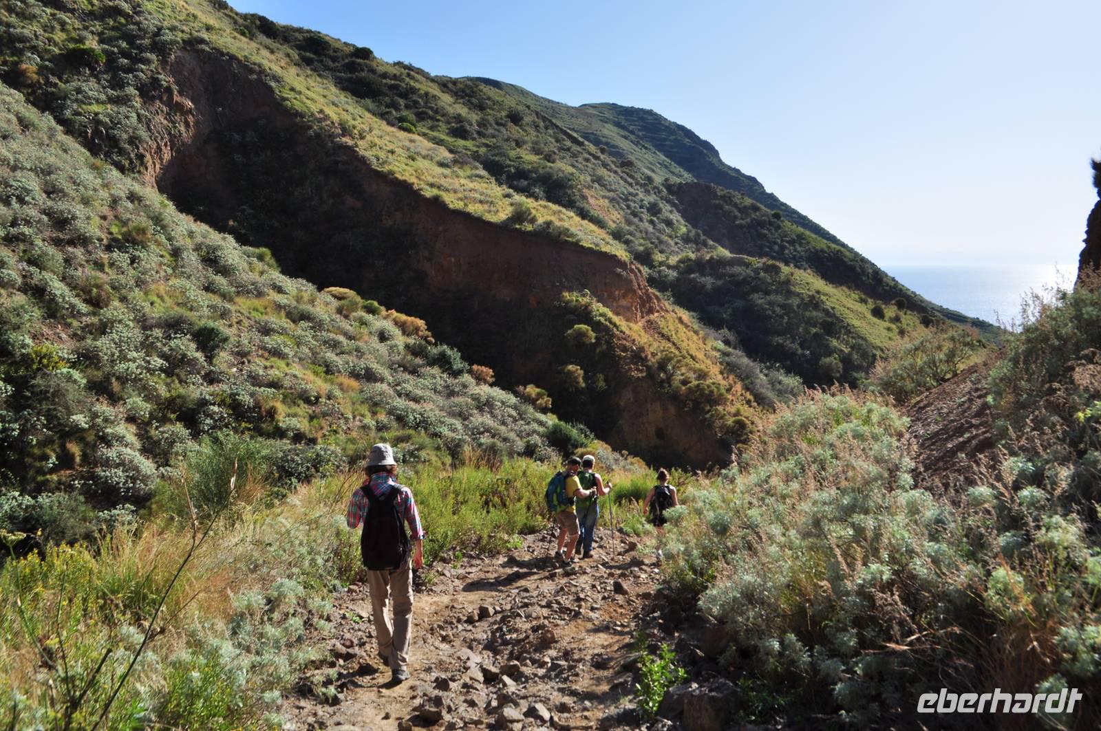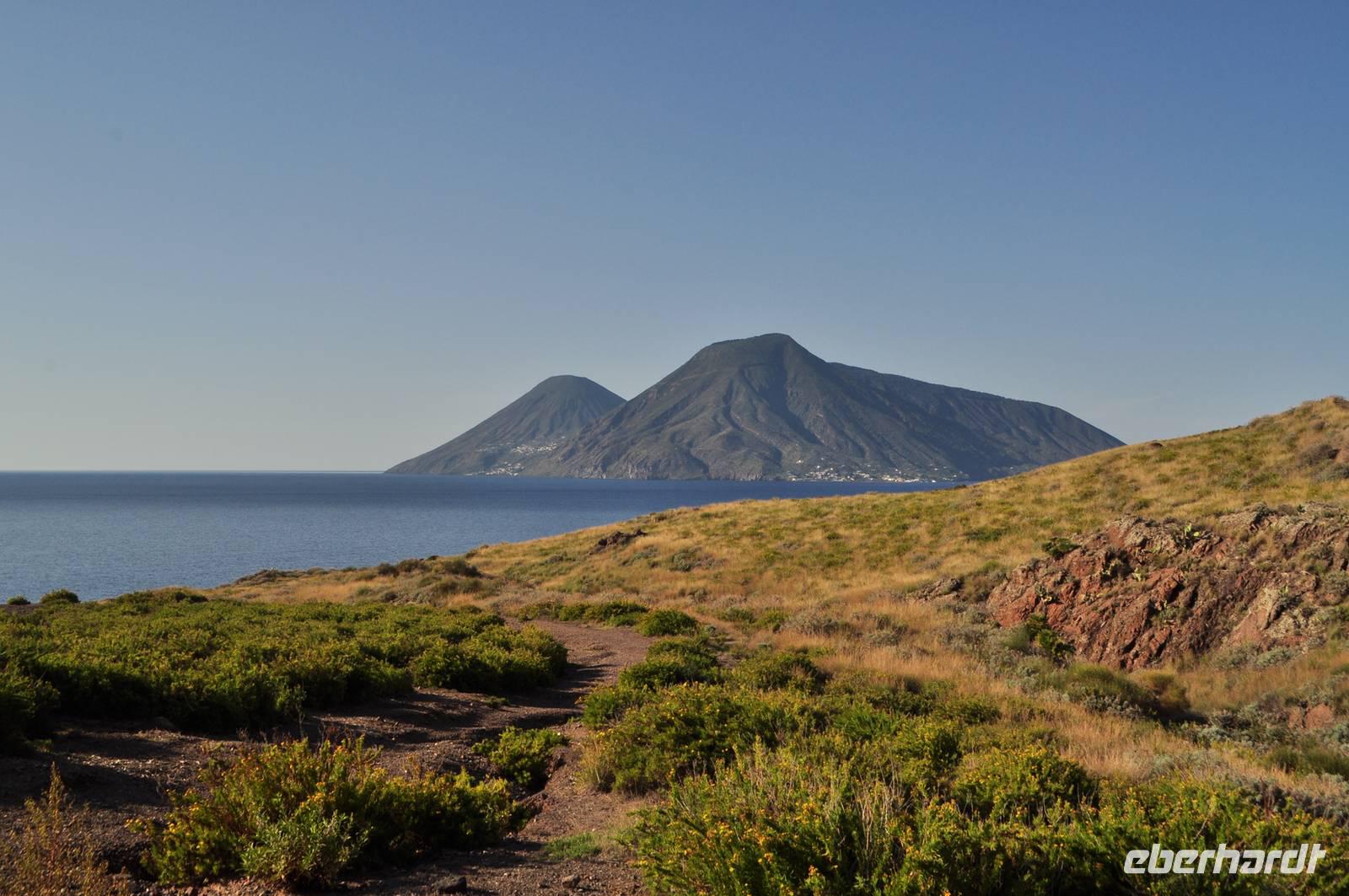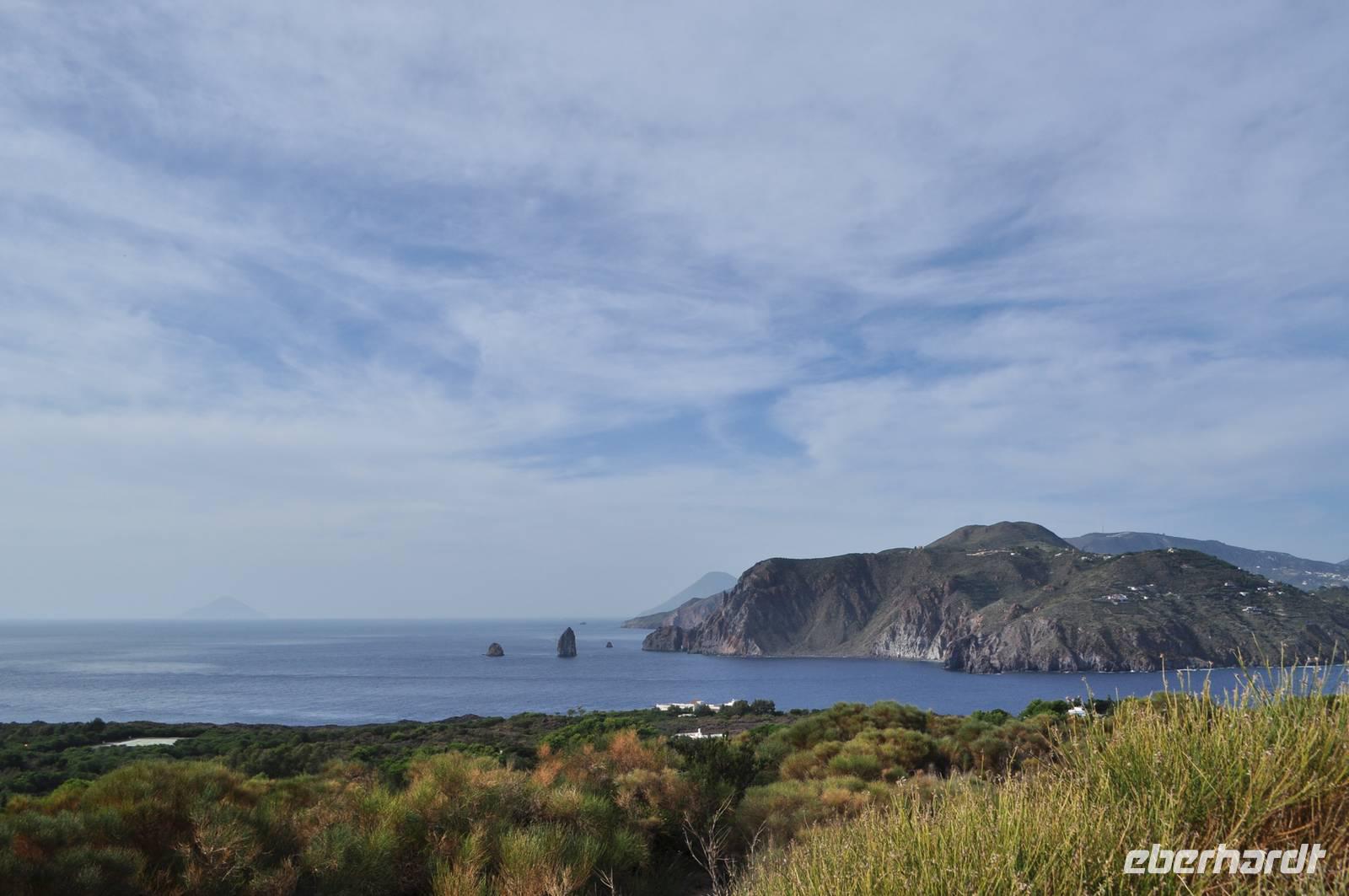 An der Nordspitze kommen wir an einen der beiden schönsten Aussichtspunkte der Insel. In der Nähe der Ortschaft Quattropani bietet sich ein phantastischer Blick auf die nordwestlichen Äolischen Inseln. Unmittelbar gegenüber liegt Salina, die höchste aller Inseln. Weiter westlich erheben sich Filicudi und Alicudi. Mit dem Bus geht es noch ein Stück weiter, bevor unsere Wanderung beginnt.