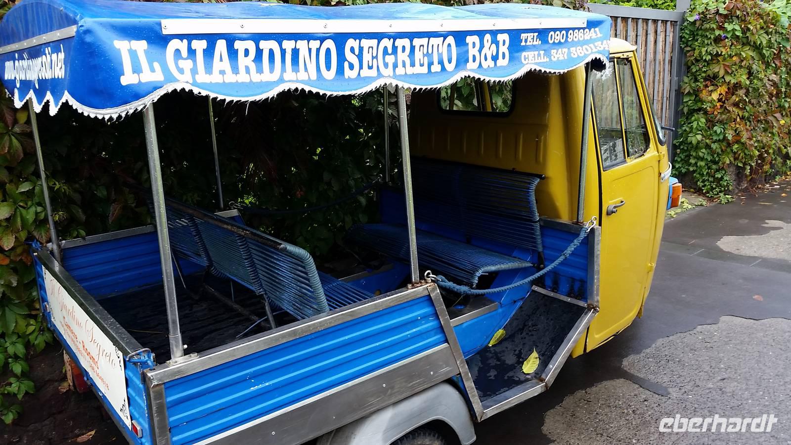 Während unseres Stopps klart es auf, der Regen lässt schließlich nach. Wir gehen zum Hotel und beziehen unsere Zimmer. Auf Stromboli sind keine Autos erlaubt, für den Transport von Gepäck und Waren, im Zweifel auch Gästen werden nur Ape benutzt, die bekannten italienischen Dreiräder, übersetzt Biene. Im Gegensatz zur Vespa der Wespe.