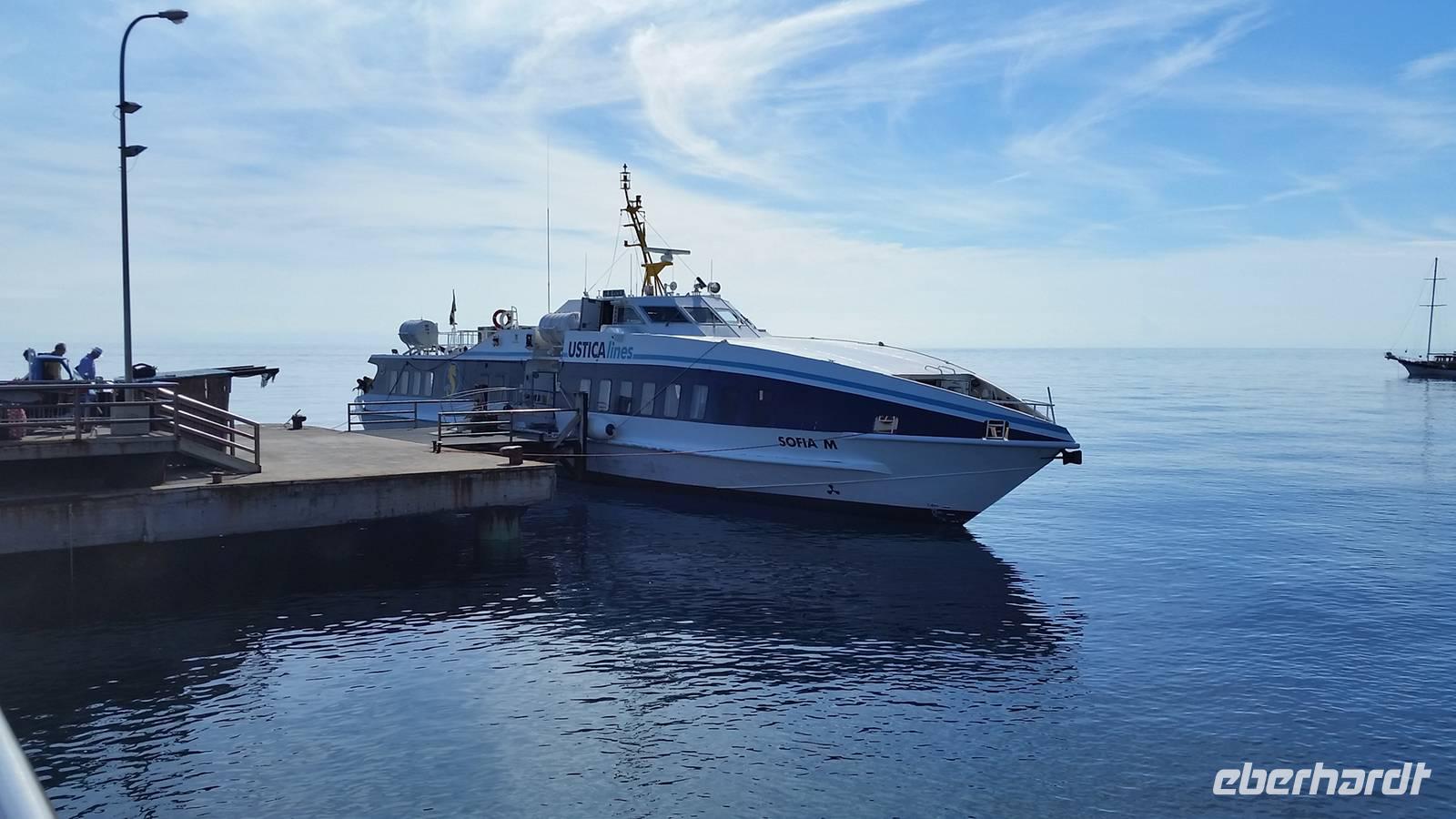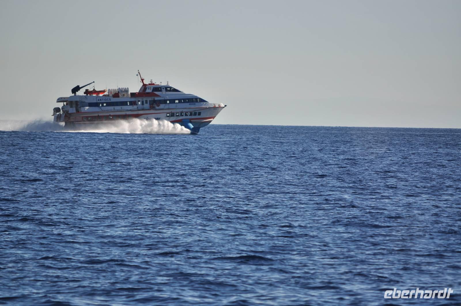 Für den heutigen Tag ist Scirocco, der Wüstenwind aus Südost gemeldet. Er bringt meist eine schlechte Wetterlage. Die Schiffe haben dann keine Möglichkeit mehr anzulegen. Ustica Lines will sich daher am Vortag nicht auf den Abfahrtstermin festlegen. Wir würden um 09.00 Uhr Bescheid bekommen. Der Scirocco verschont uns, so dass wir wie geplant gegen Mittag zurück nach Milazzo starten können. Das Tragflügelboot, ital. Aliscafi bringt uns in gut drei Stunden zurück nach Sizilien. Unterwegs stoppt das Schiff fahrplanmäßig in Panarea, Salina, Lipari und Vulcano.