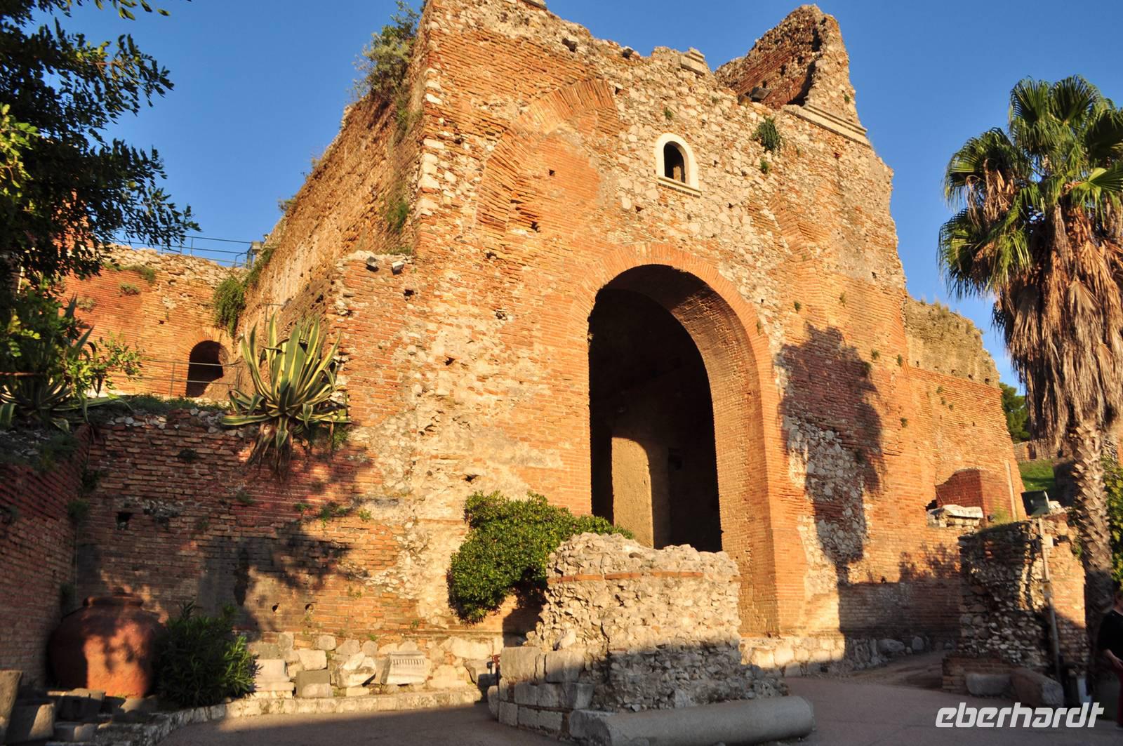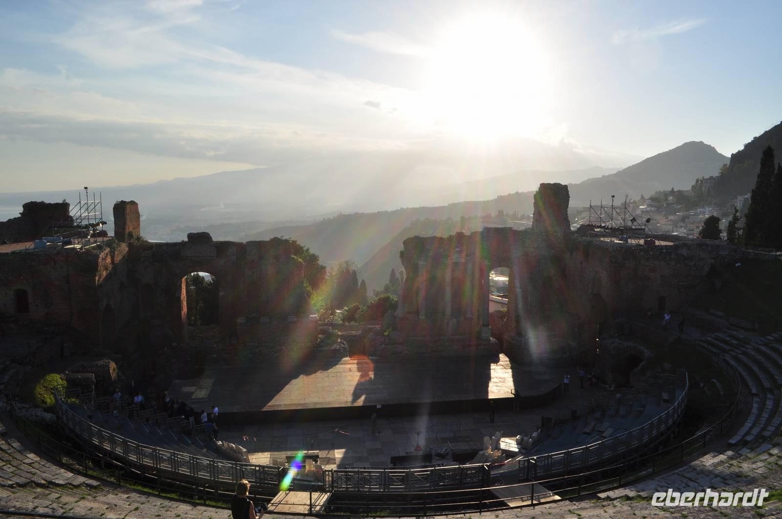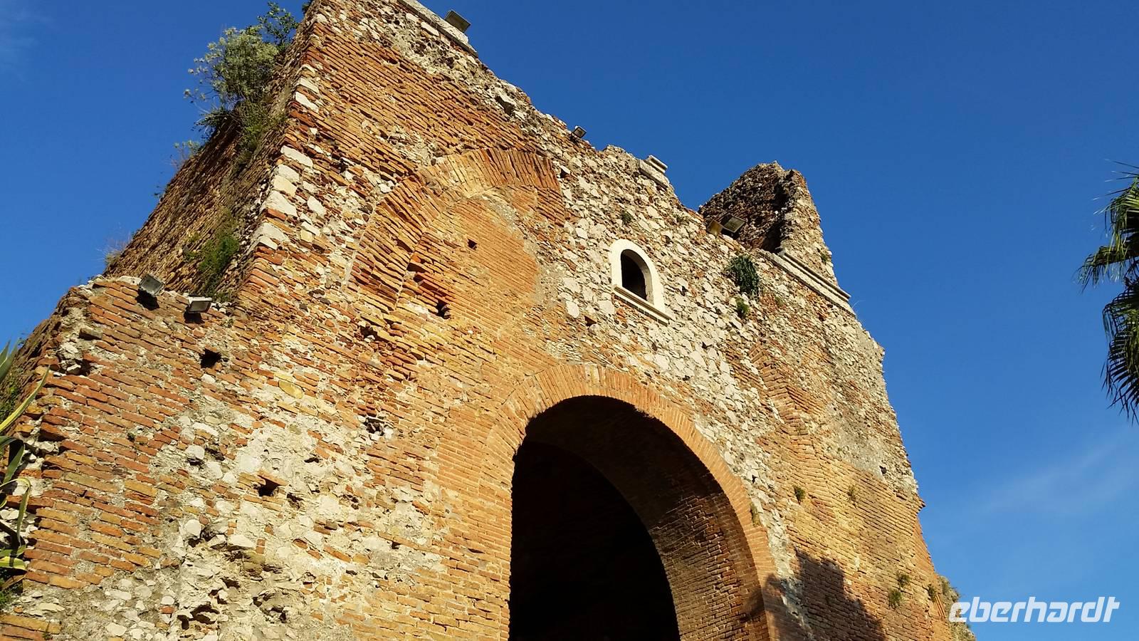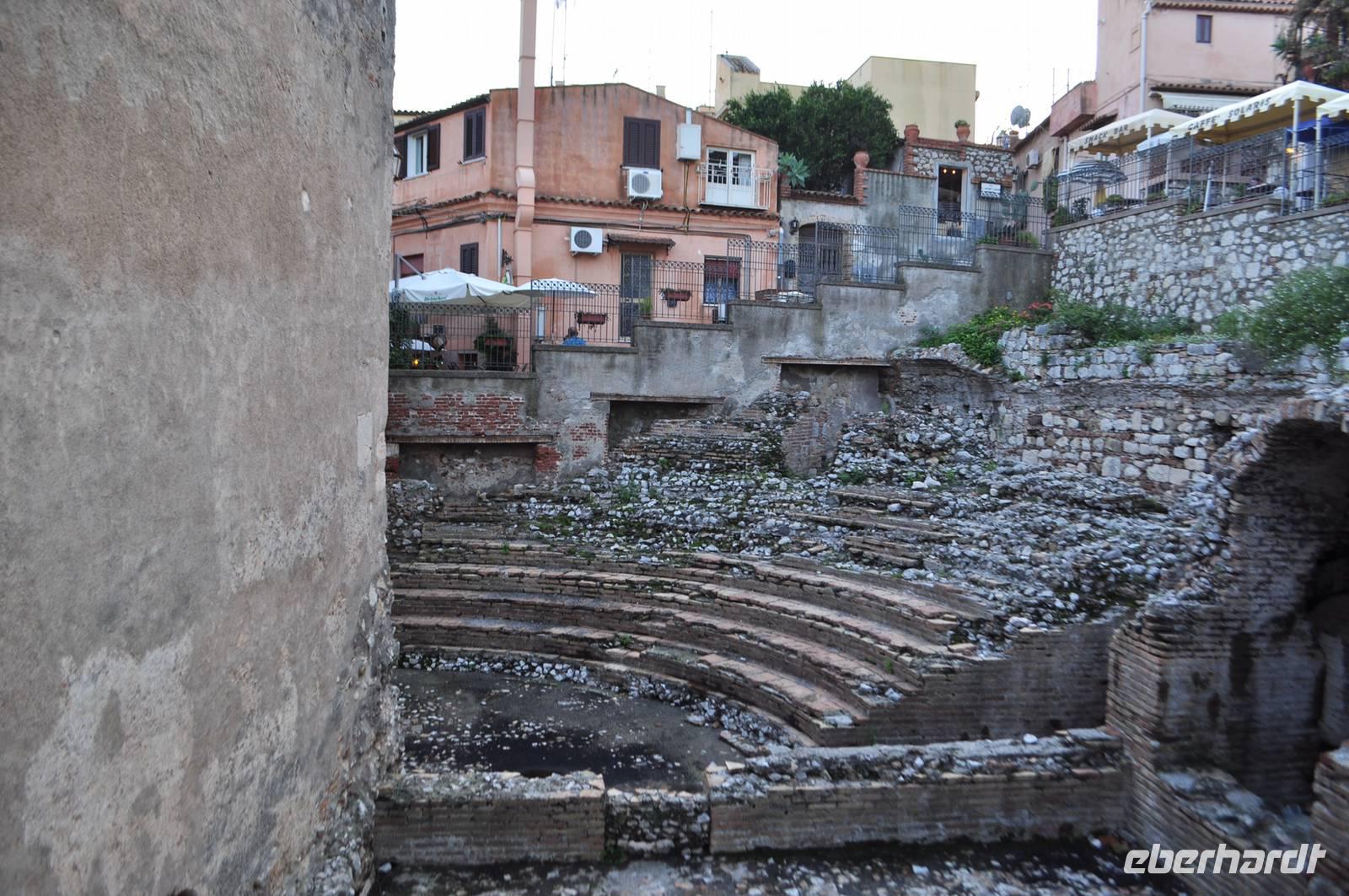 Mit dem Bus geht es nach Taormina, dem Jet-Set Ort im Nordosten Siziliens. Hoch oben auf einem Felssattel gelegen hat man einen schönen Blick auf die Bucht von Giardini-Naxos und mit etwas Glück auch auf den Ätna. Man betritt die Stadt über die Porta di Messina. Unweit liegt eine kleine Kirche, auf deren Rückseite liegt das von Touristen wenig beachtete römische Odeon. Die meisten treibt es direkt zum Teatro Greco. Dem griechisch-römischen antiken Theater mit dem weltbekannten Blick auf den Ätna.
