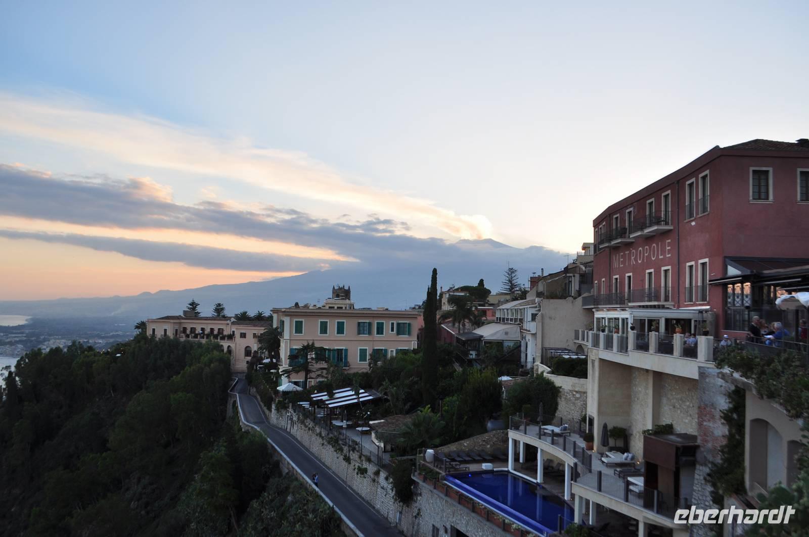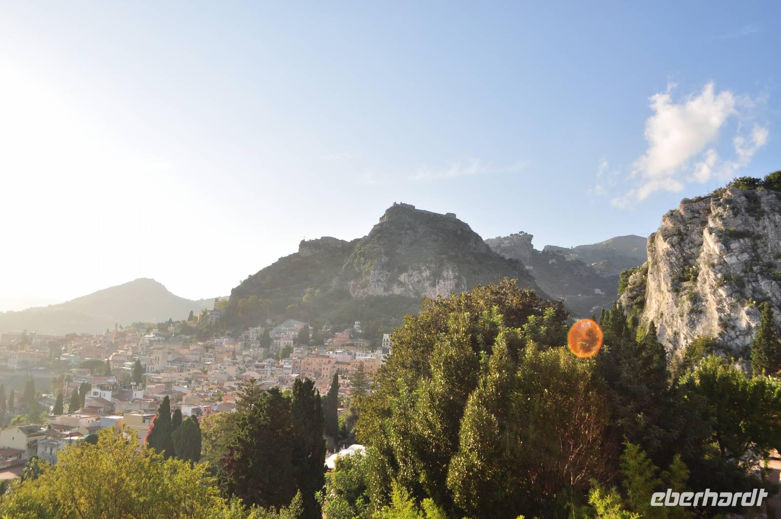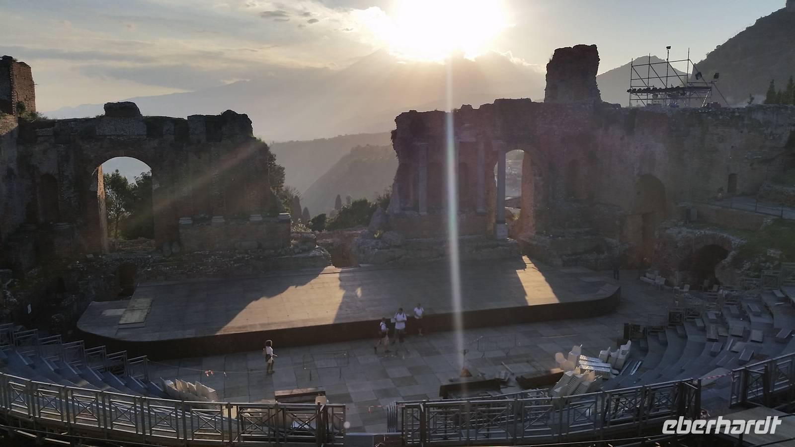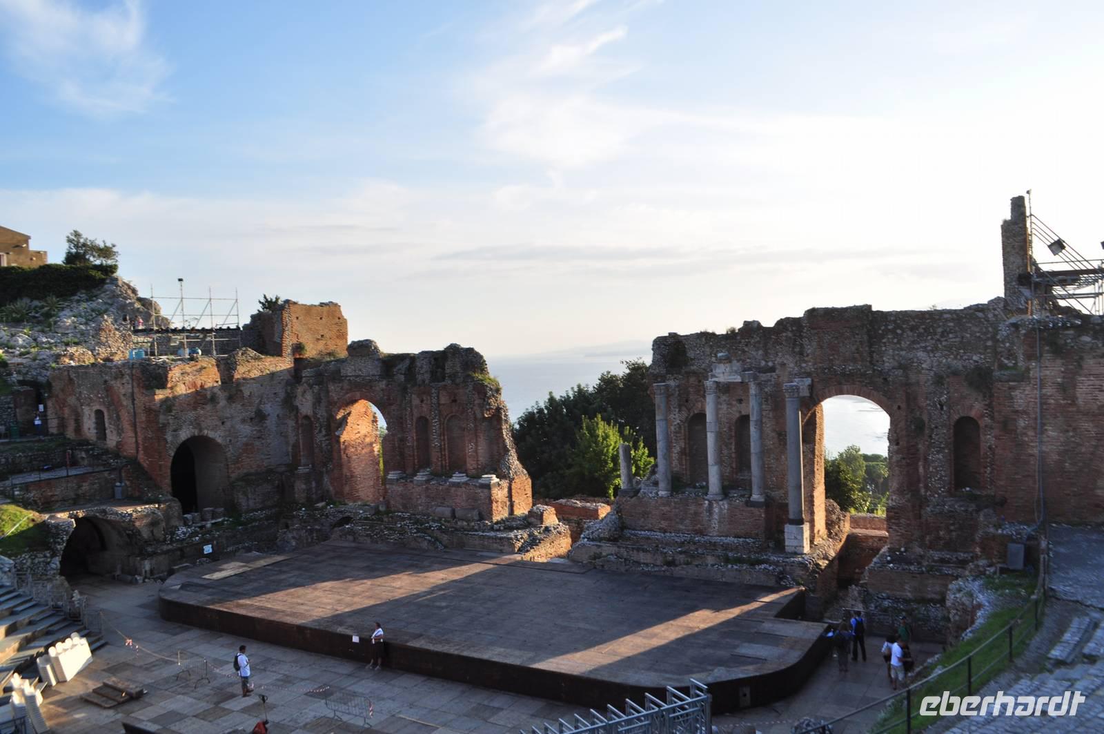 Mit dem Bus geht es nach Taormina, dem Jet-Set Ort im Nordosten Siziliens. Hoch oben auf einem Felssattel gelegen hat man einen schönen Blick auf die Bucht von Giardini-Naxos und mit etwas Glück auch auf den Ätna. Man betritt die Stadt über die Porta di Messina. Unweit liegt eine kleine Kirche, auf deren Rückseite liegt das von Touristen wenig beachtete römische Odeon. Die meisten treibt es direkt zum Teatro Greco. Dem griechisch-römischen antiken Theater mit dem weltbekannten Blick auf den Ätna.