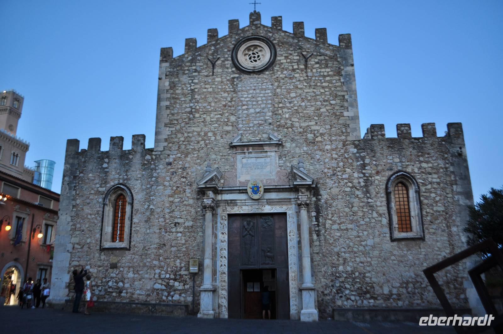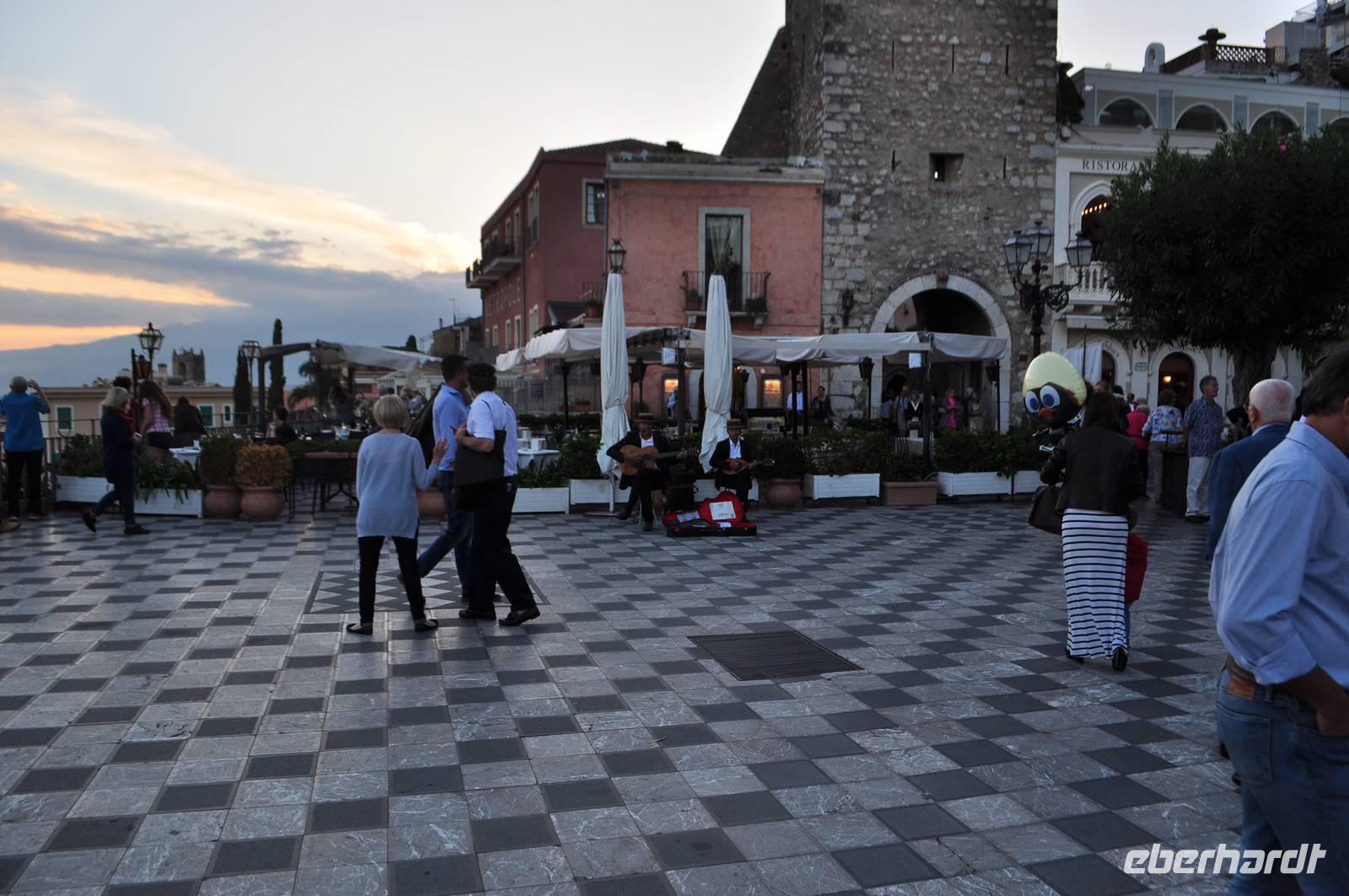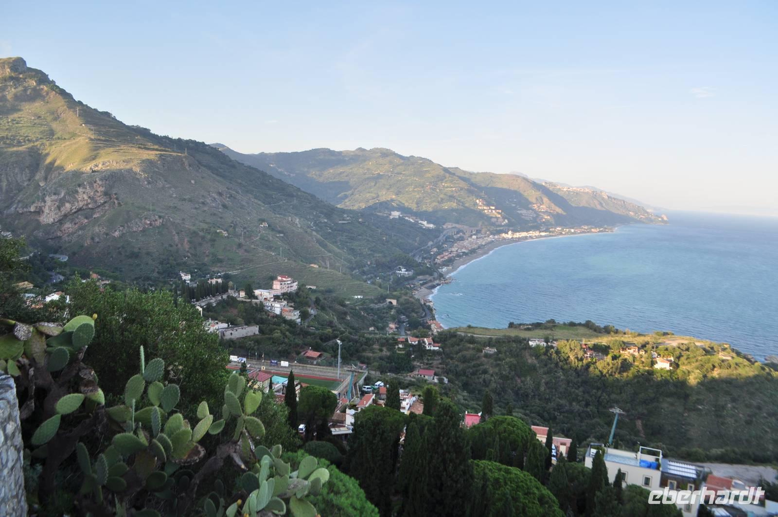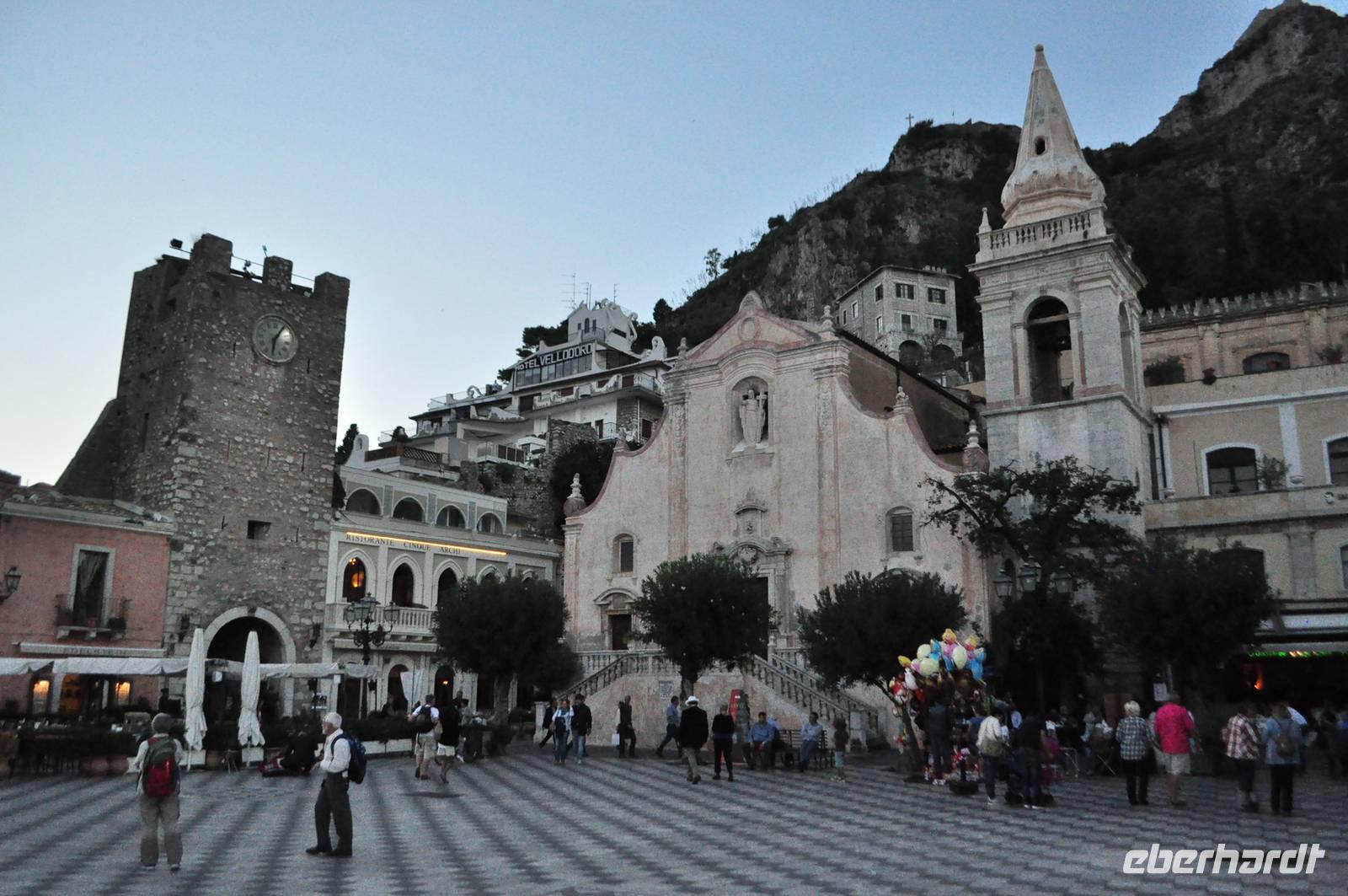 Mit dem Bus geht es nach Taormina, dem Jet-Set Ort im Nordosten Siziliens. Hoch oben auf einem Felssattel gelegen hat man einen schönen Blick auf die Bucht von Giardini-Naxos und mit etwas Glück auch auf den Ätna. Man betritt die Stadt über die Porta di Messina. Unweit liegt eine kleine Kirche, auf deren Rückseite liegt das von Touristen wenig beachtete römische Odeon. Die meisten treibt es direkt zum Teatro Greco. Dem griechisch-römischen antiken Theater mit dem weltbekannten Blick auf den Ätna.