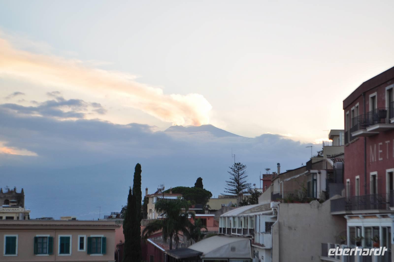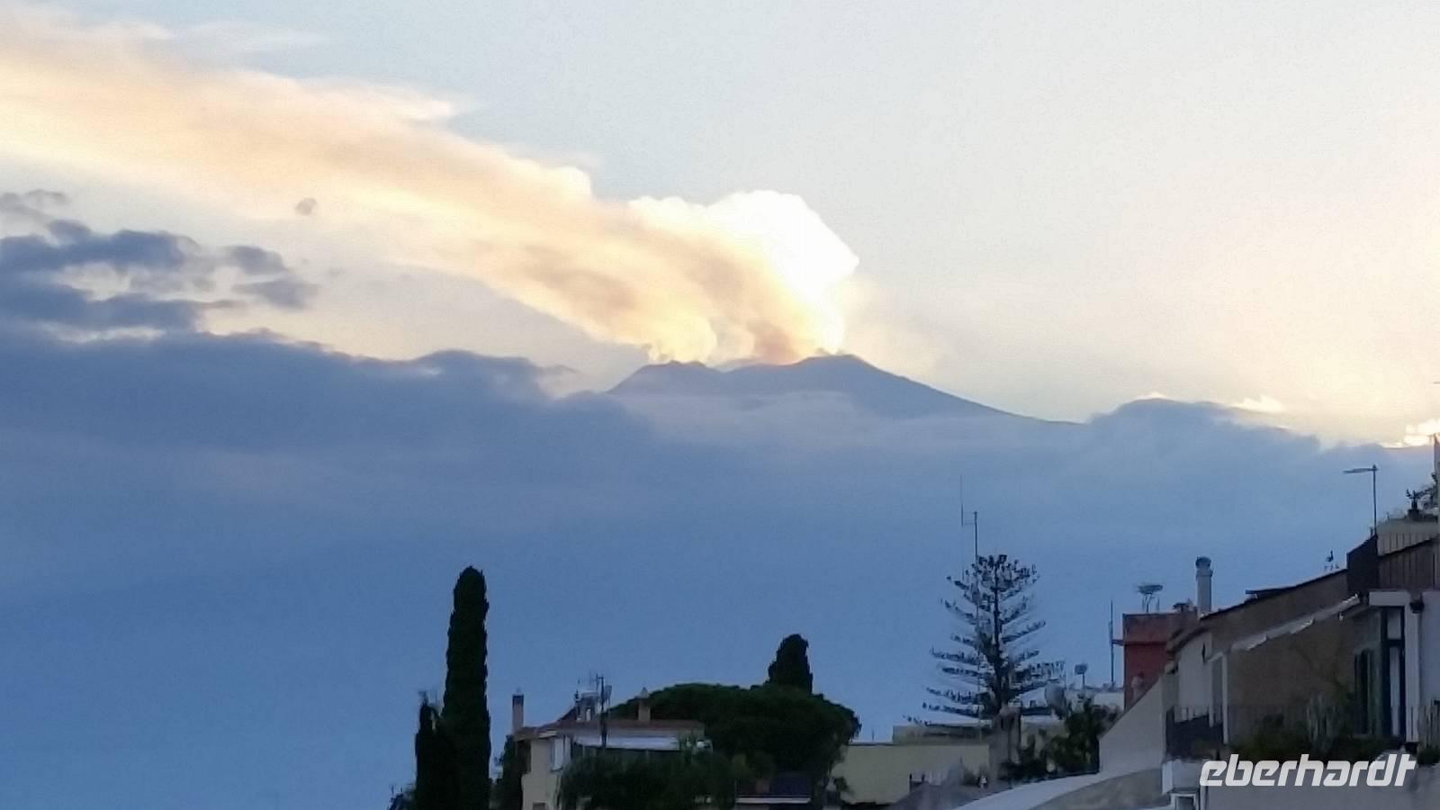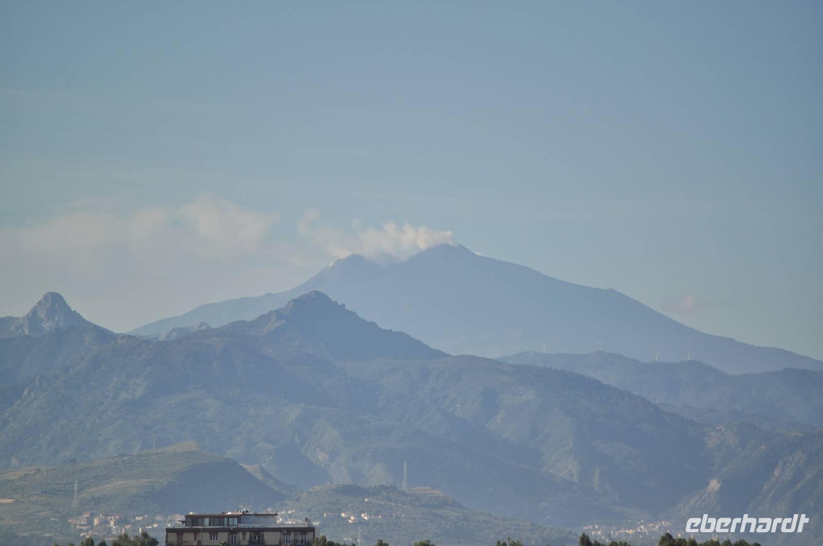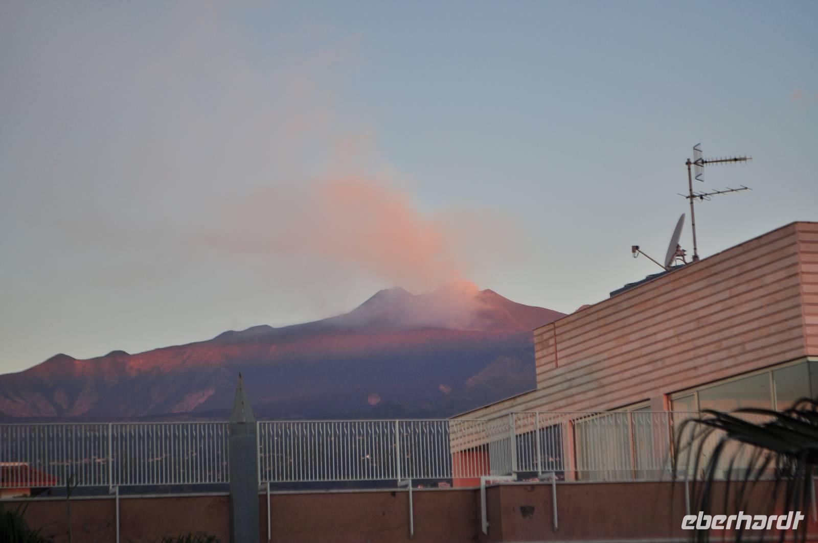 Nach dem Aufstehen, sofort ein Blick zum Ätna. Er ist frei! Blauer Himmel und keine Wolke!