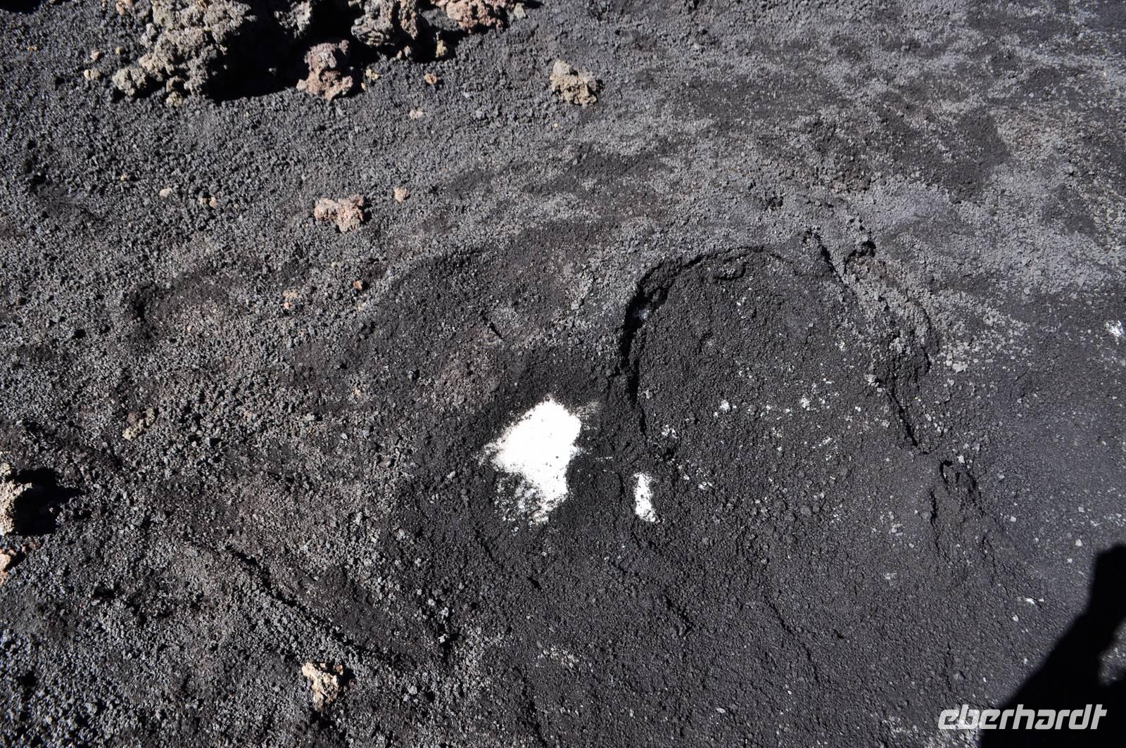 An der Bergstation angekommen geht es mit den Unimog-Allradbussen auf 2.900m. Da wir ein Permit für den Gipfel haben, müssen wir sowohl bei der Seilbahn als auch bei den Allradbussen nicht anstehen, sondern dürfen bevorzugt zusteigen. Am Torre del Filosofo einer ehemaligen Schutzhütte und einem nahegelegenen Nebenkrater ist für die meisten Touristengruppen Schluss. Für uns geht es jetzt erst los. Wir folgen dem Weg noch ein kurzes Stück. Dann treffen wir auf eine relativ frische Lavazunge. Der Weg ist unterbrochen. Von nun an müssen wir durch das Lava Feld, spitzkantig scharf und schroff. Wer lernen erste Überraschungen kennen, die der Ätna für seine Besucher bereithält. Unter einer dünnen schwarzen Ascheschicht findet sich ein Schneefeld, nicht etwa frisch gefallen, sondern konserviert vom letzten Jahr. Eine dünne schwarze Ascheschicht reicht aus so zu isolieren, dass der Schnee sich halten kann und das bei langanhaltenden Lufttemperaturen im Sommer um die 25-30°C auch in dieser Höhe.