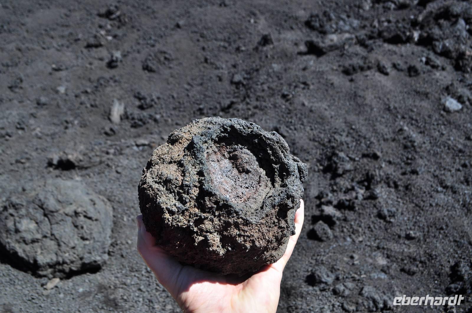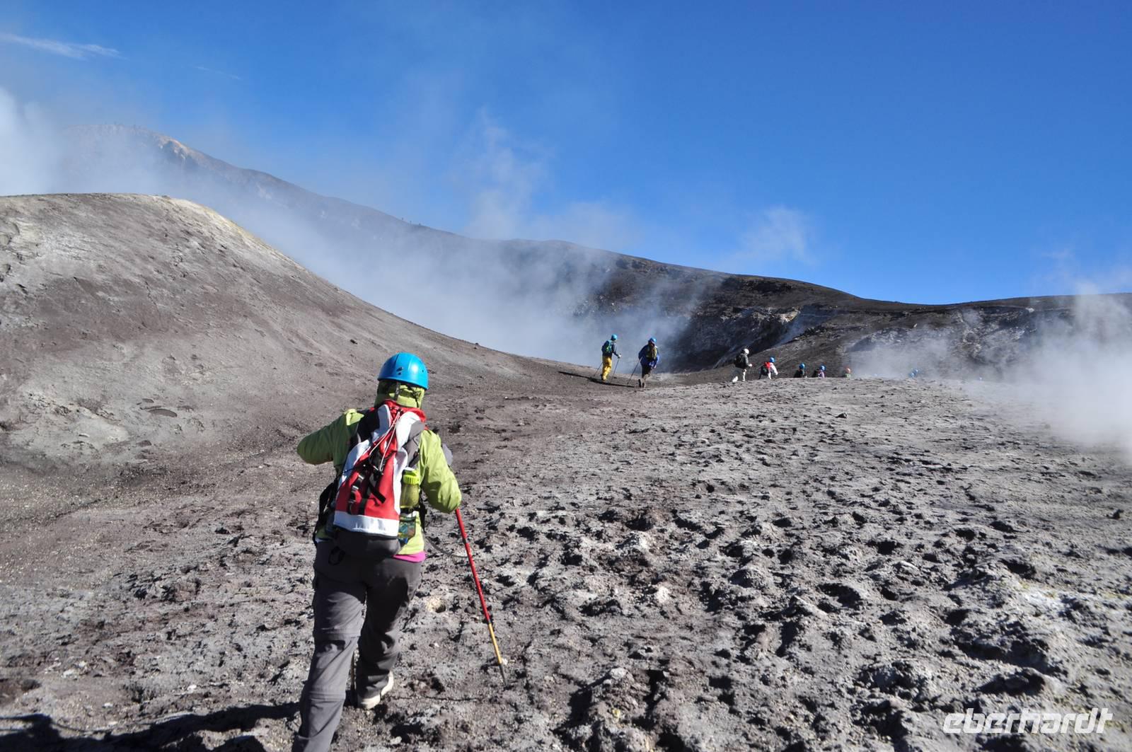 Als wir das Lava Feld von 2013/14 hinter uns ließen erreichten wir großflächige Aschefelder. Vulkanbomben liegen herum. Die Einschlagskrater in der Asche beweisen, dass sie erst vor kurzem hier eingeschlagen sind. Viele von ihnen haben mindestens Handballgröße. Von nun an gilt Helmpflicht für alle. Winterliche Bekleidung wird angezogen. Ohne Mütze, Schal und Handschuhe geht heute eigentlich nichts. Auch die Gruppe wird nun über die aktuelle Aktivitätsphase informiert. Er sagt aber auch, er würde nicht mit uns aufsteigen, wenn er Zweifel an einem sicheren Aufstieg hätte. Er steht in ständigem Funkkontakt mit den Vulkanologen des INGV. Dennoch ermahnt er uns aufmerksam und vorsichtig zu sein.