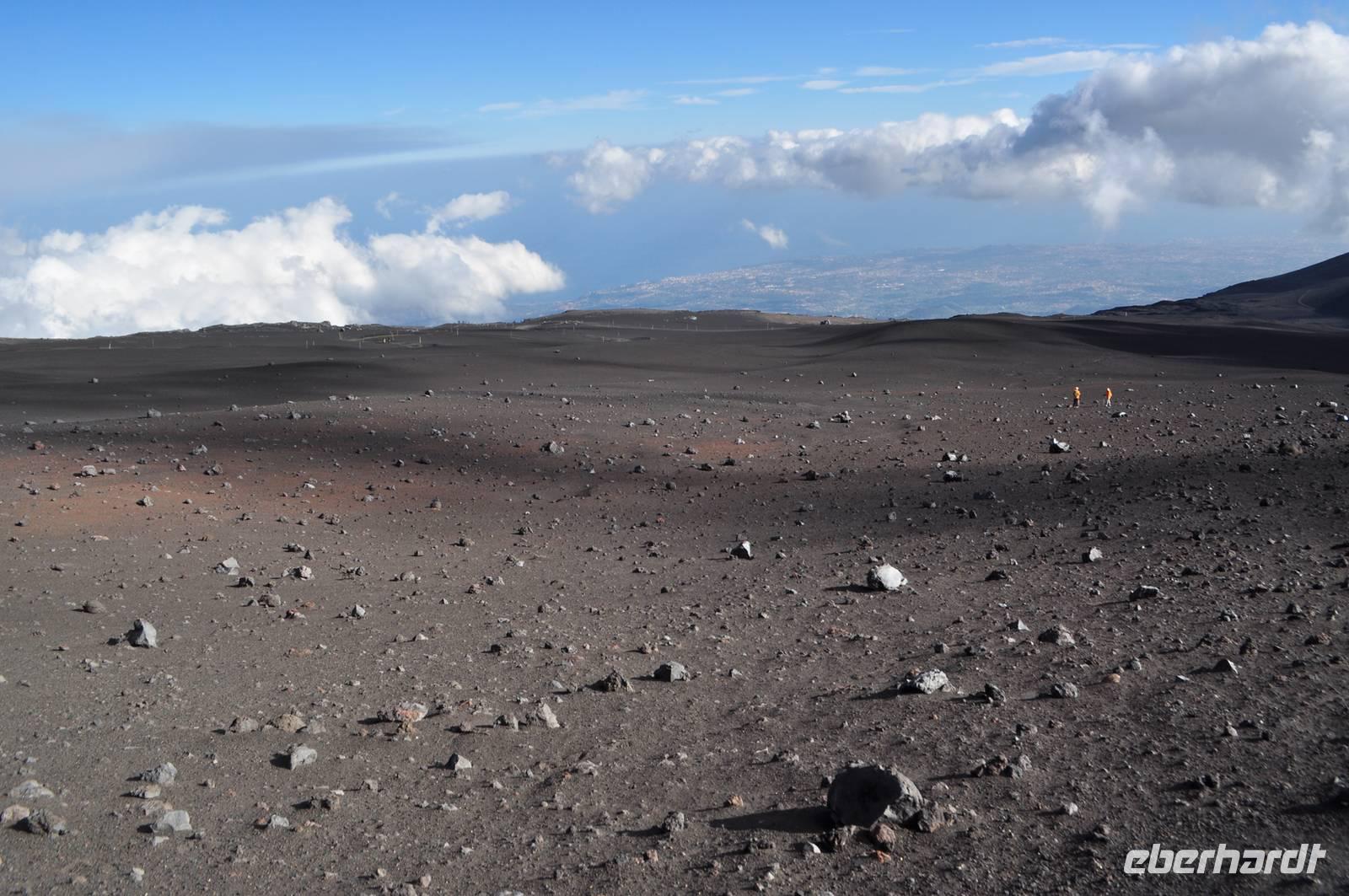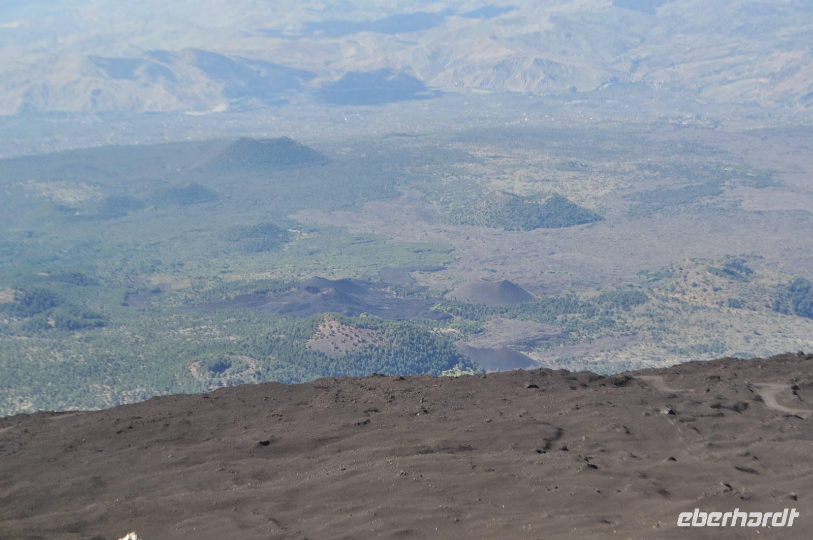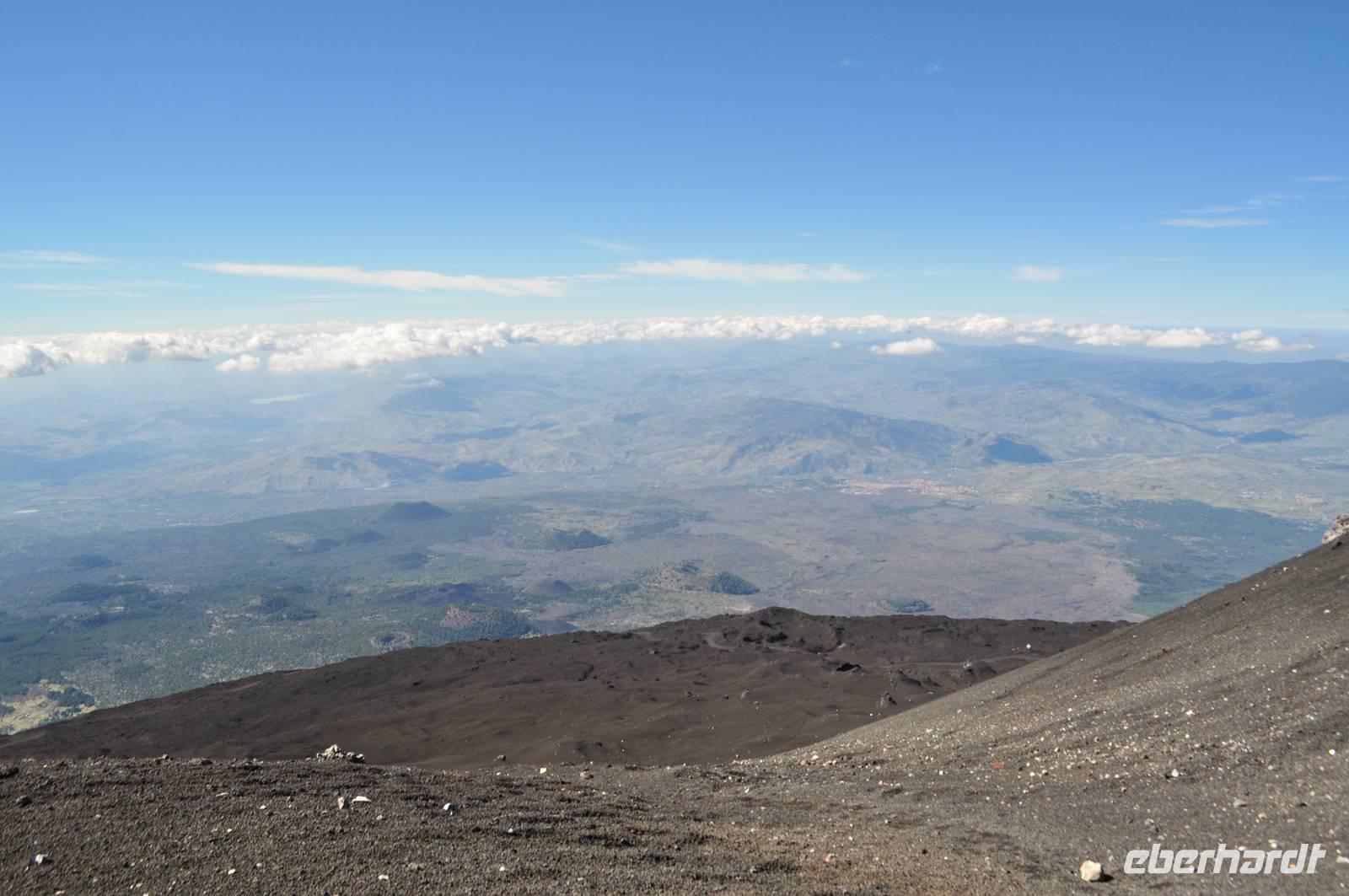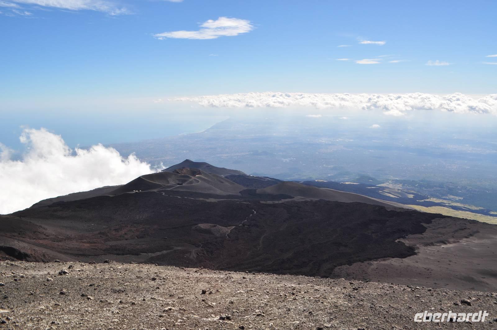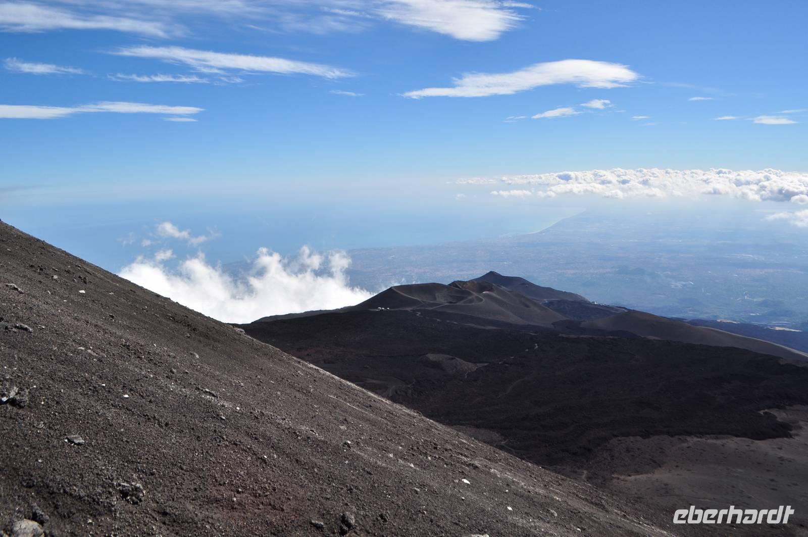 Die Dimensionen sind einfach gigantisch und respekteinflößend. Während wir in einen tiefen Schlund hinein blicken war dieser Bereich noch in den 1990er Jahren mit viel Material verfüllt. Es ist unglaublich in welcher Dimension hier Landschaften verändert werden. Aber nicht nur der Ätna ist fantastisch, auch das Wetter. Wir haben Fernsicht bis Syrakus und sogar an die Südspitze Siziliens. Selbst die übliche Wetterverschlechterung in der zweiten Tageshälfte bleibt heute aus.