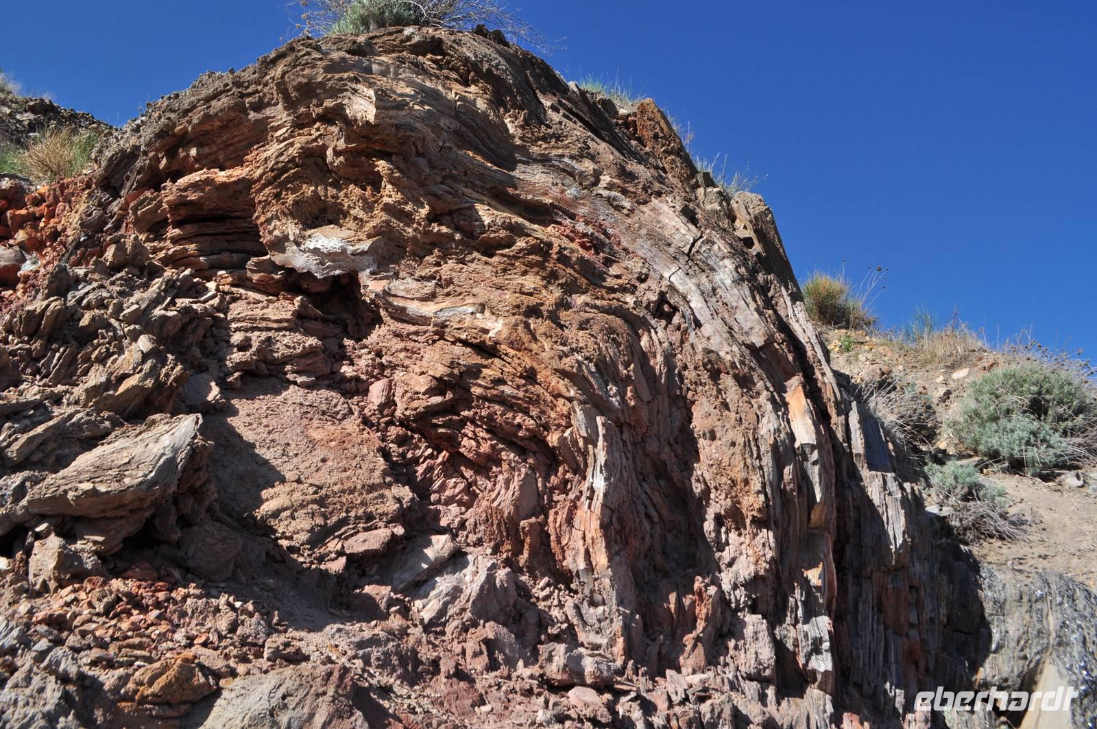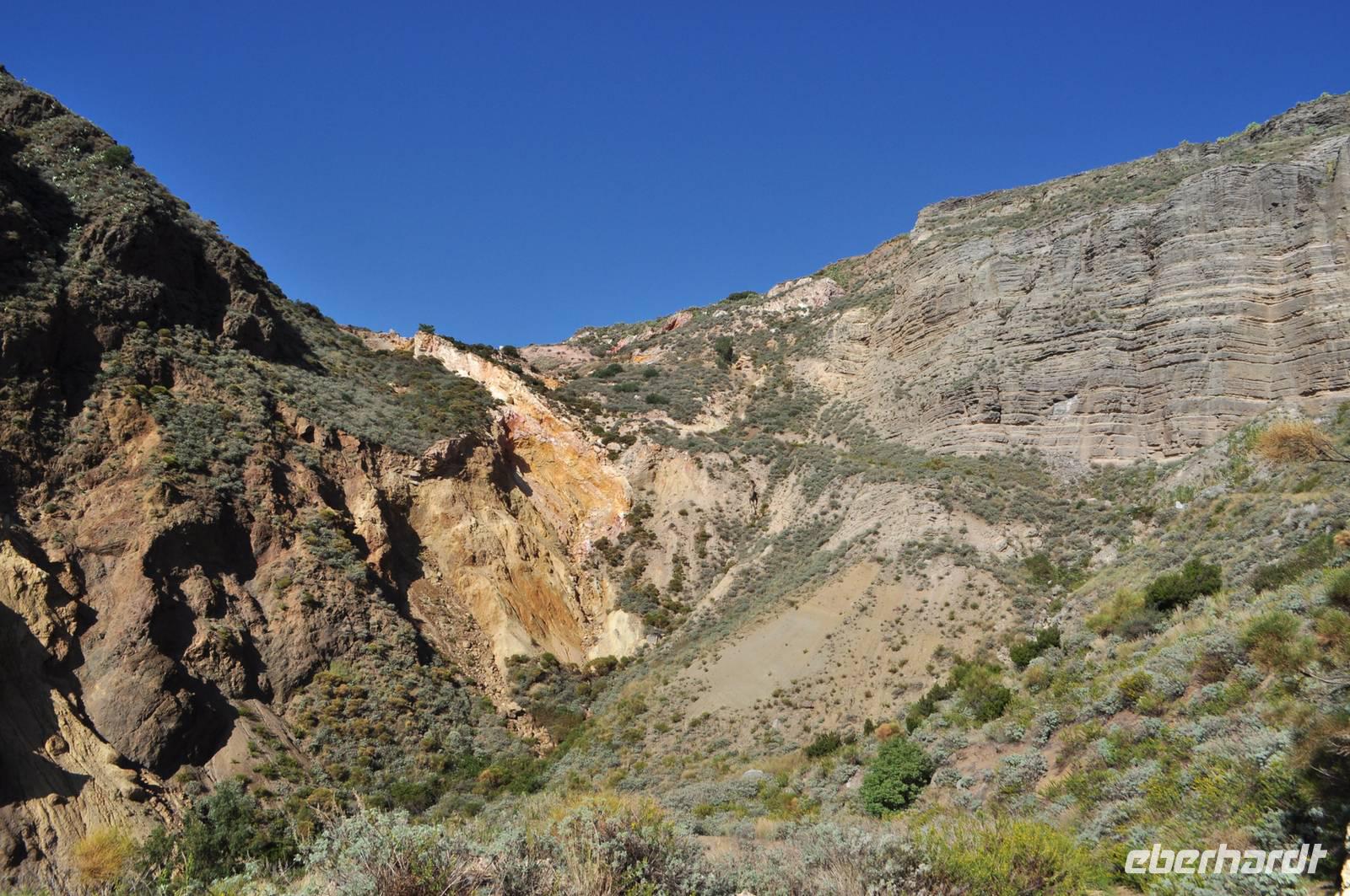Wir beginnen mit einem recht steilen Abstieg durch ein felsiges Tal. Um uns herum liegen Minerale in allen Farben. Ein beeindruckendes Farbspektrum direkt nebeneinander.