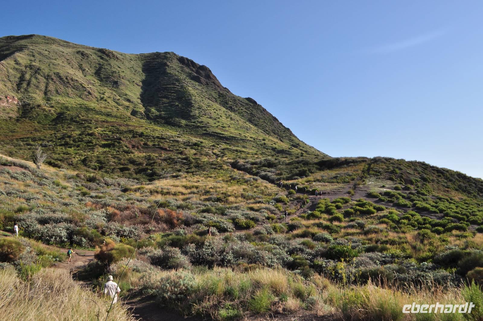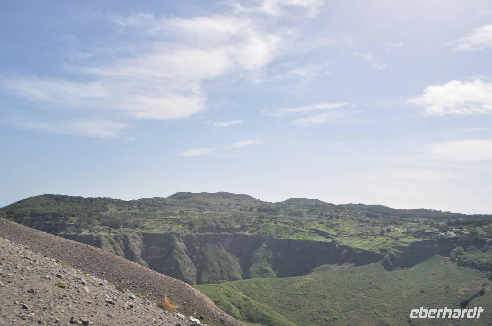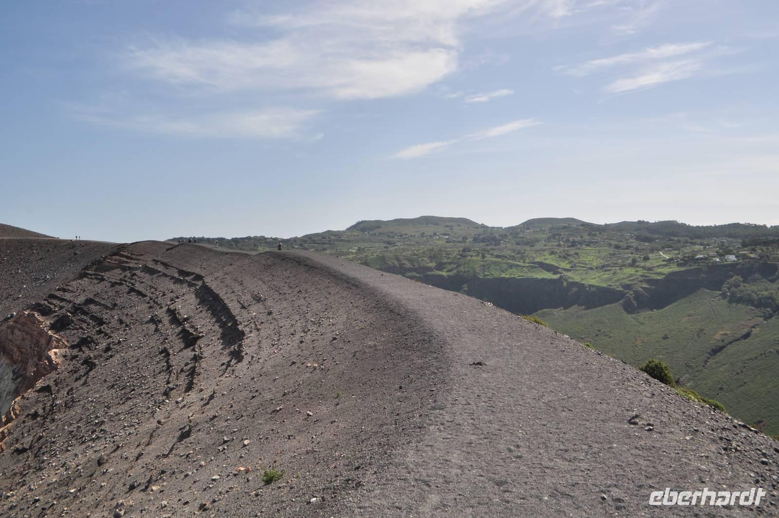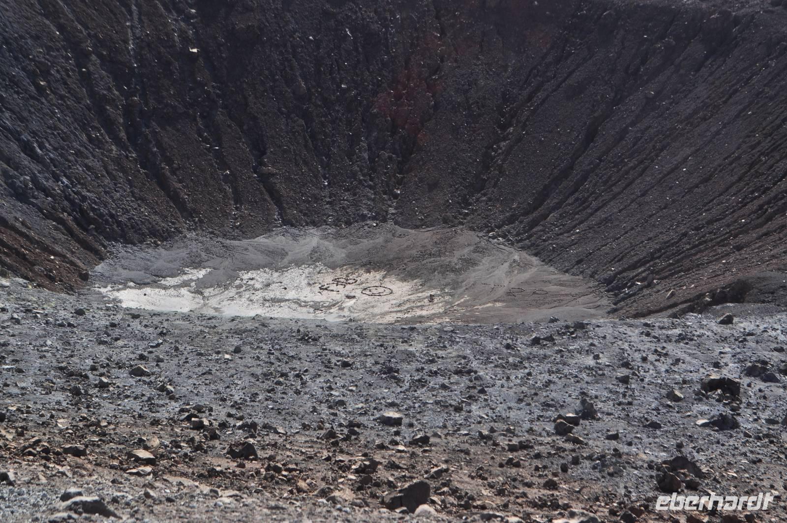 Einige beginnen mit der Umrundung des Kraters. In 45-60 Minuten lässt er sich bequem umrunden. Die höchste Stelle liegt bei 394 m. Wenn es die Wetterlage und die vulkanische Aktivität (geringe Fumarolentätigkeit) zulässt, ist eine Umrundung, dann unterhalb des Schwefelfeldes unmöglich, selbstverständlich an der Krateraußenseite.