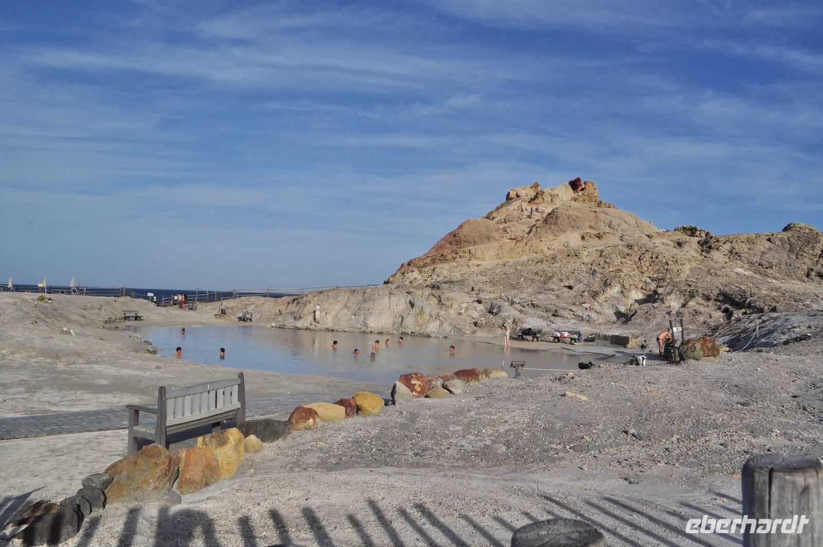Nach dem Essen geht es zum Entspannen. Nachdem sämtlicher Schmuck abgelegt und sicher verstaut wurde, wartet das Verjüngungsbad in Form eines natürlichen Schwefel-Schlamm-Tümpels. Man sagt 1 Minute im Bad bringt 1 Lebensjahr zurück. Jochen und ich haben ernsthaft Sorge nach dem Baden unsere Gruppe nicht mehr wiederzuerkennen.
