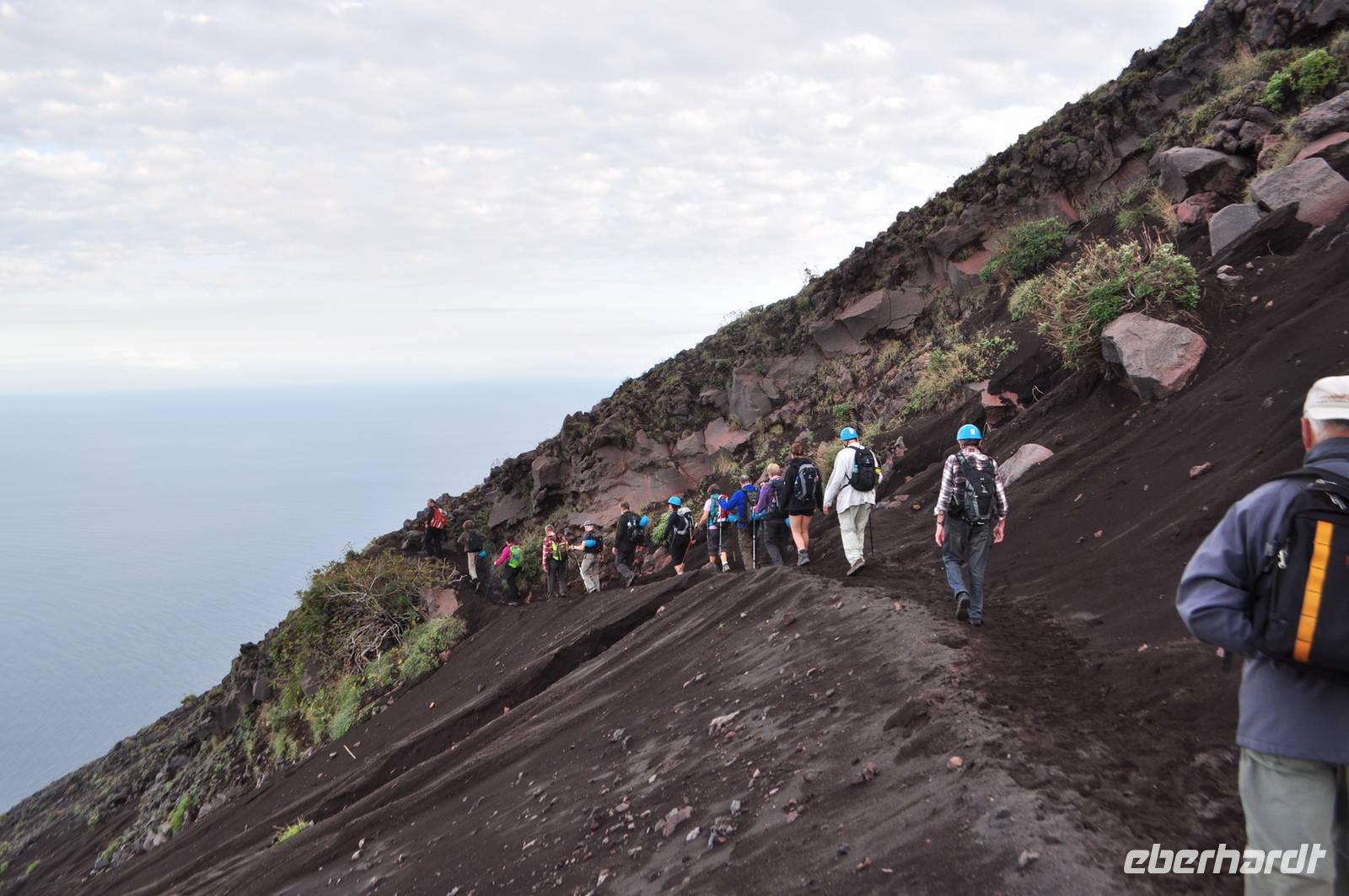Nach ca. 1,5 Stunden Aufenthalt steigen wir durch die Nacht ab. Etwa 400 Höhenmeter steigen wir im Aschefeld ab. Der Guide gibt das Tempo vor, die Technik ist die gleiche wie am Ätna. Trekkingstöcke sind sehr von Vorteil, dies ist aber nur möglich, wenn man eine Stirnlampe hat. Diese sind auf der Reise dringend empfohlen!!!