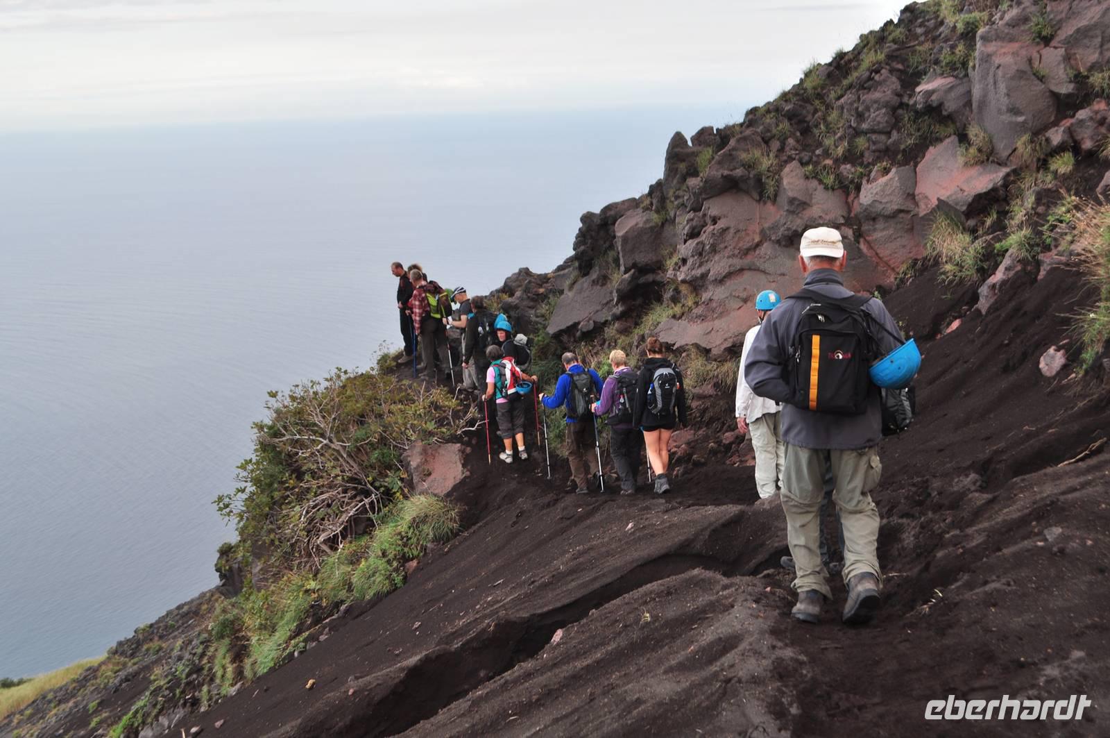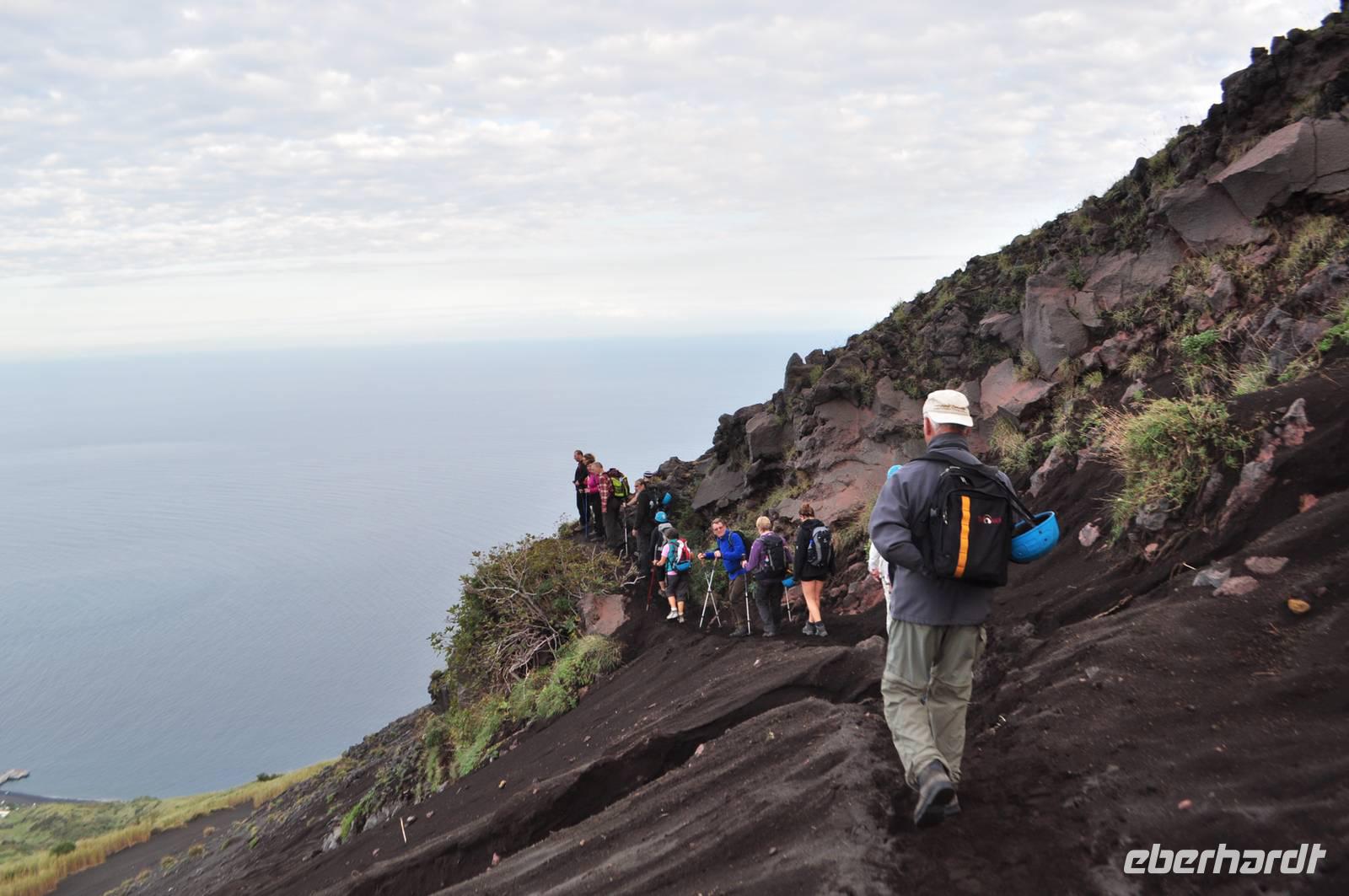 Am späten Nachmittag starten wir zu unserer Wanderung zum alten Observatorium und zur Sciara del fuoco, der Straße des Feuers. Bei diesem Weg handelt es sich um die alte Aufstiegsroute zum Gipfel. Aufgrund einer starken Aktivitätsphase im Jahr 2002 wurde Weg dauerhaft gesperrt, ein Aufstieg ist nun nur noch bis zu einer Höhe von 400m erlaubt. Genau dorthin werden wir aufsteigen. Man hat eine gute Sicht auf die aktiven Krater. Bei den strombolianischen Eruptionen wird heißes Material nach Nordosten in Richtung Sciara del Fuoco ausgestoßen. Die glühenden Brocken rollen und springen dann über diese Zone hinab, mitunter bis zum Meer.