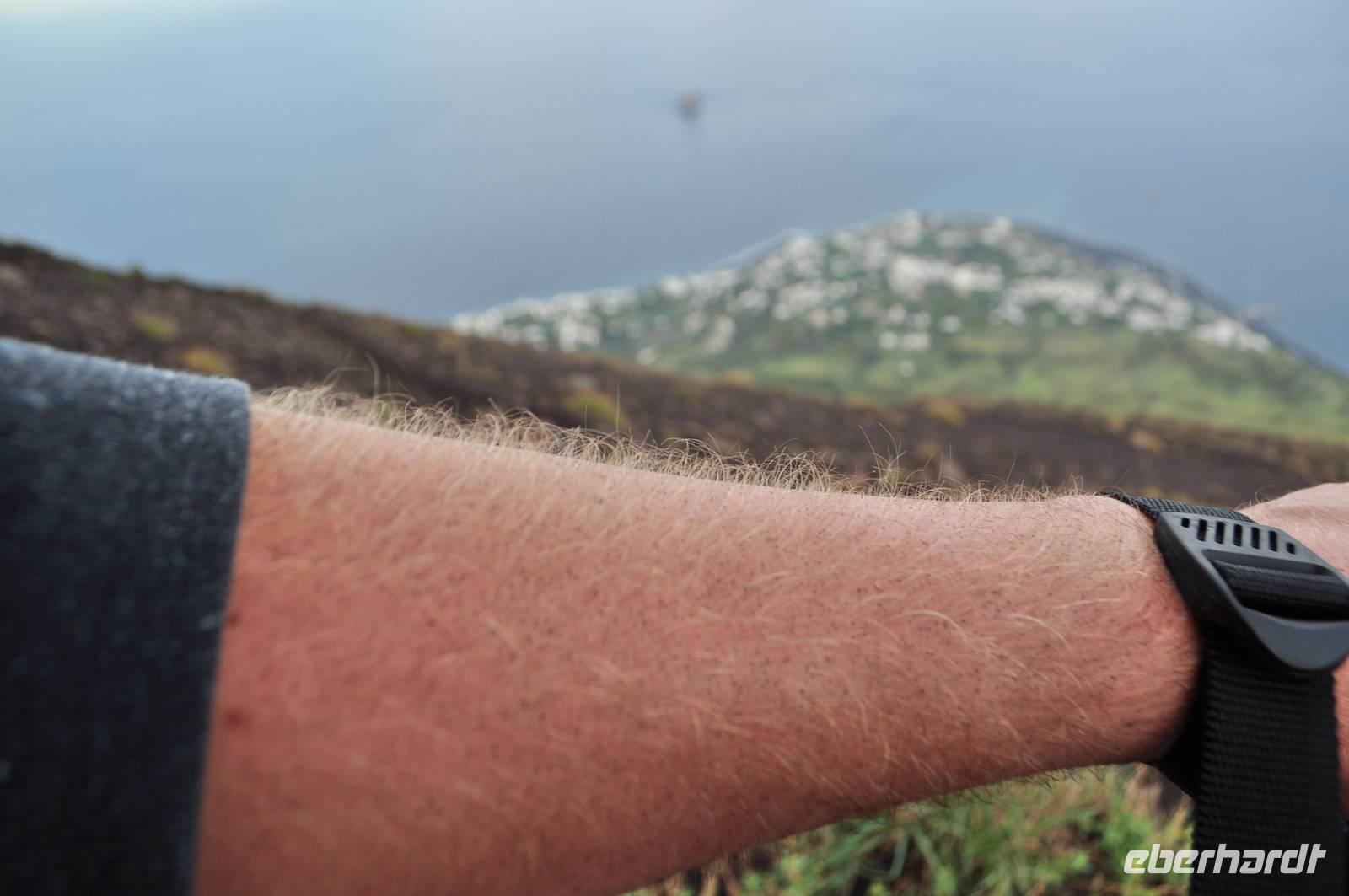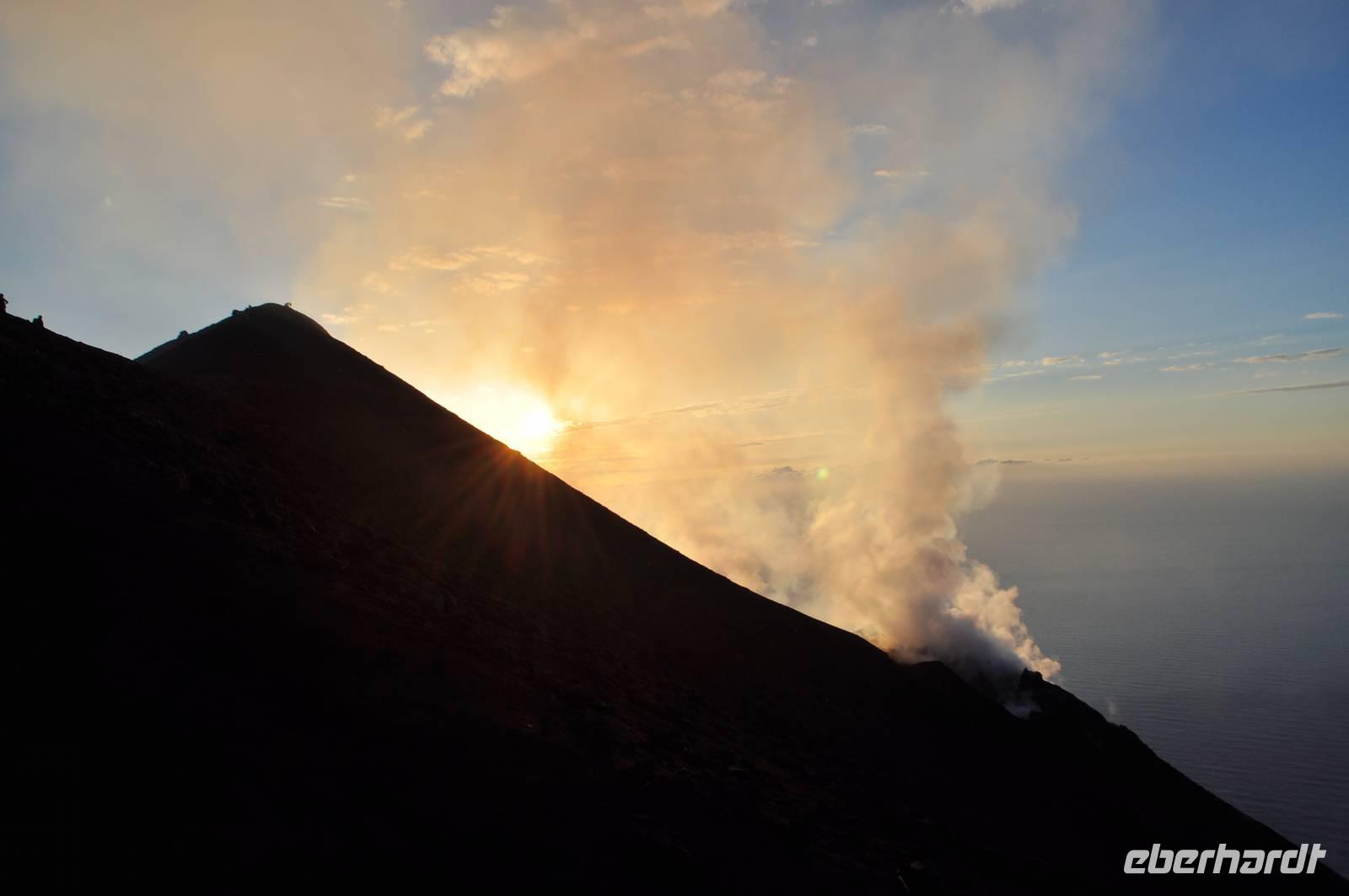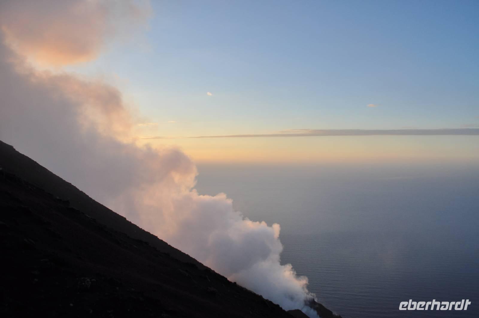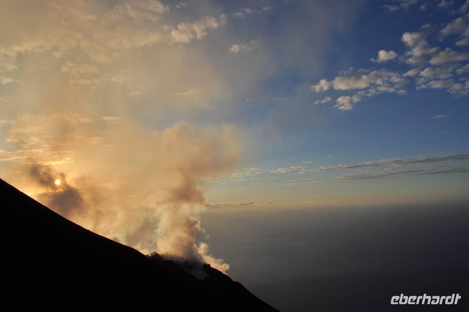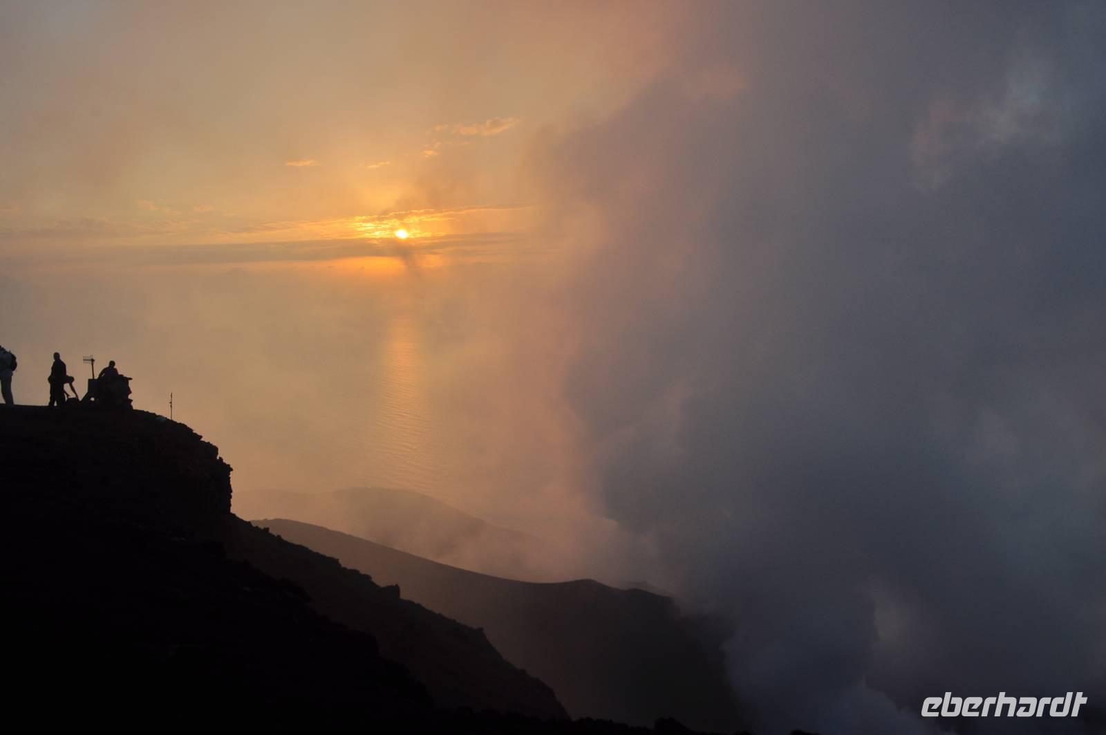 Wir erreichen den Gipfelgrat gegen 18 Uhr kurz vor Sonnenuntergang. Der Stromboli gast heute stark und permanent aus, für den Stromboli völlig ungewöhnlich. Ständig geht ein latenter Ascheregen nieder, der sich auf alles legt (Gliedmaßen, Ausrüstung etc.).Auch schwefelhaltige Dämpfe sind heute wahrnehmbar, ebenfalls ungewöhnlich.