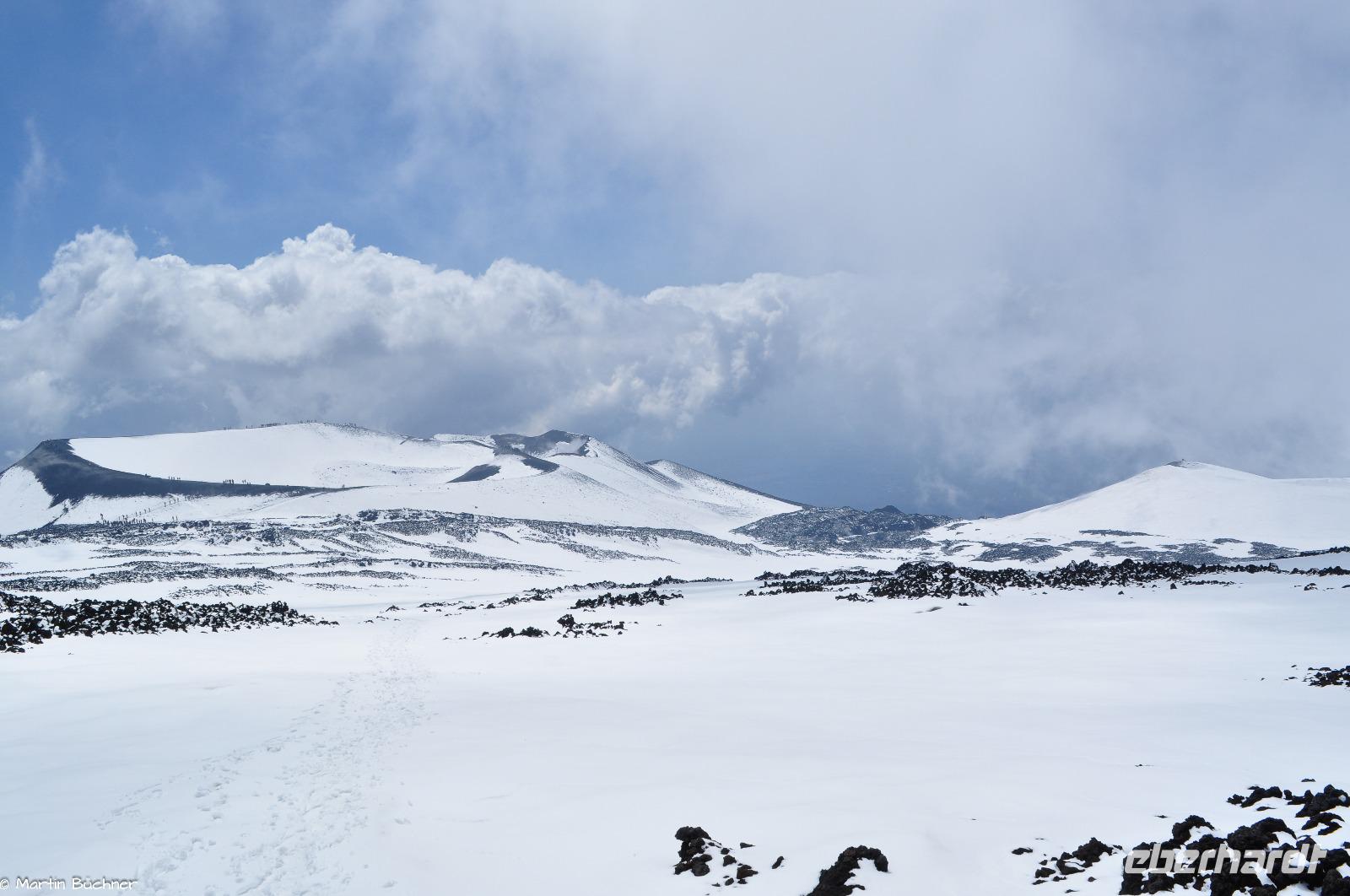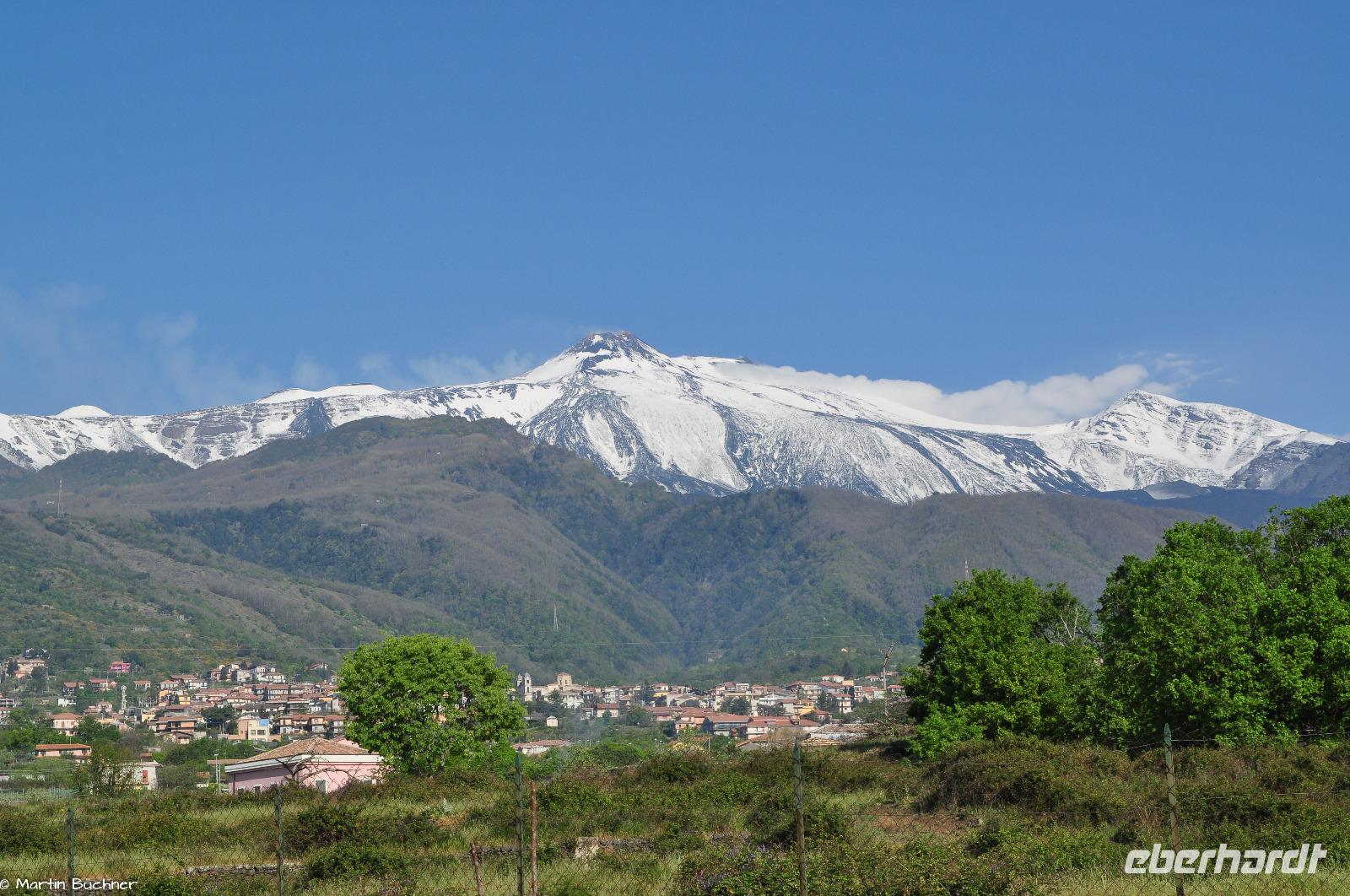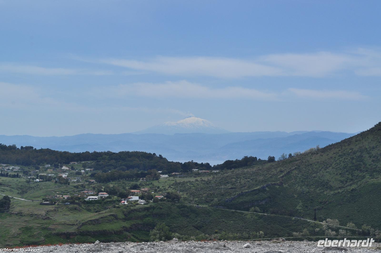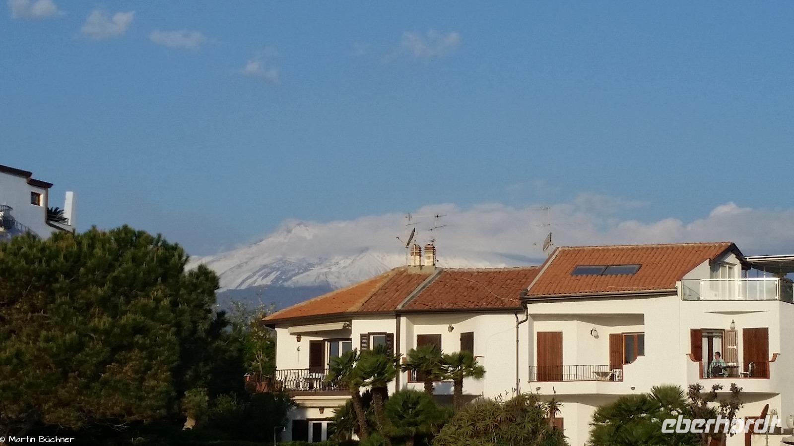 Das erste was man an einem solchen Tag tut, ist der Blick zum Ätna. Es ist blauer Himmel, der Ätna ist endlich zu sehen, schneeweiß vom frischen Neuschnee der letzten Tage. Die Gipfelkrater hüllen sich noch in Wolken, lösen sich aber zunehmend auf. Auf zum Ätna!