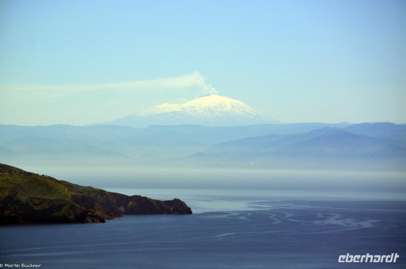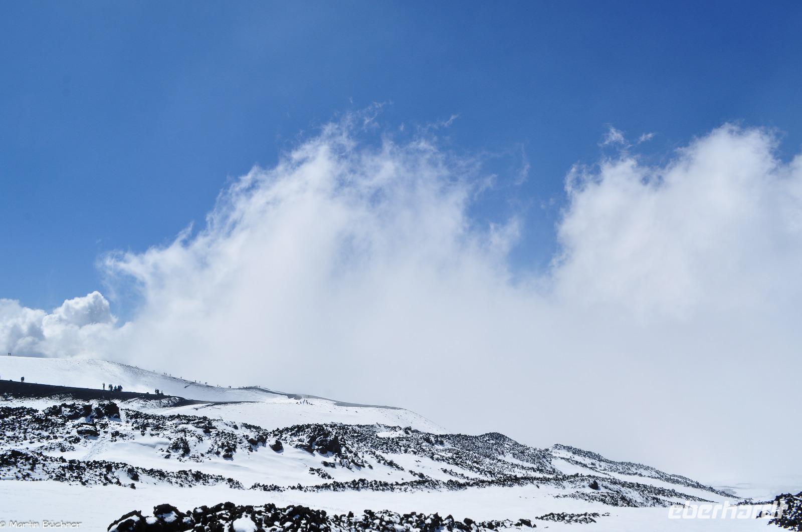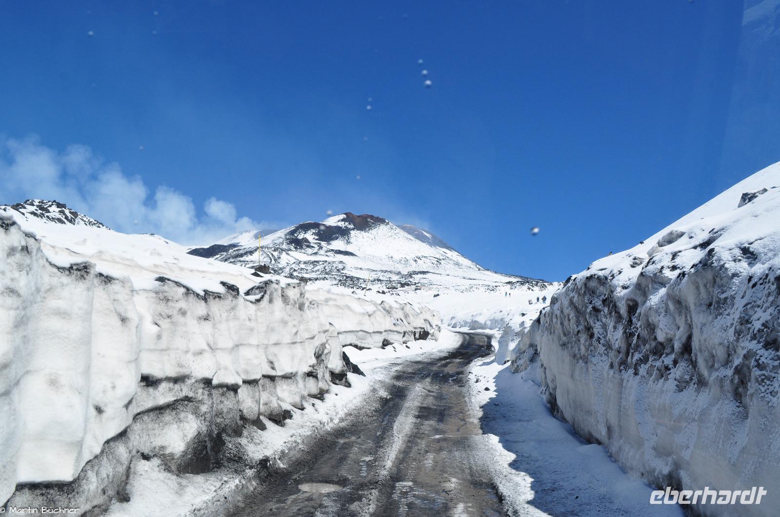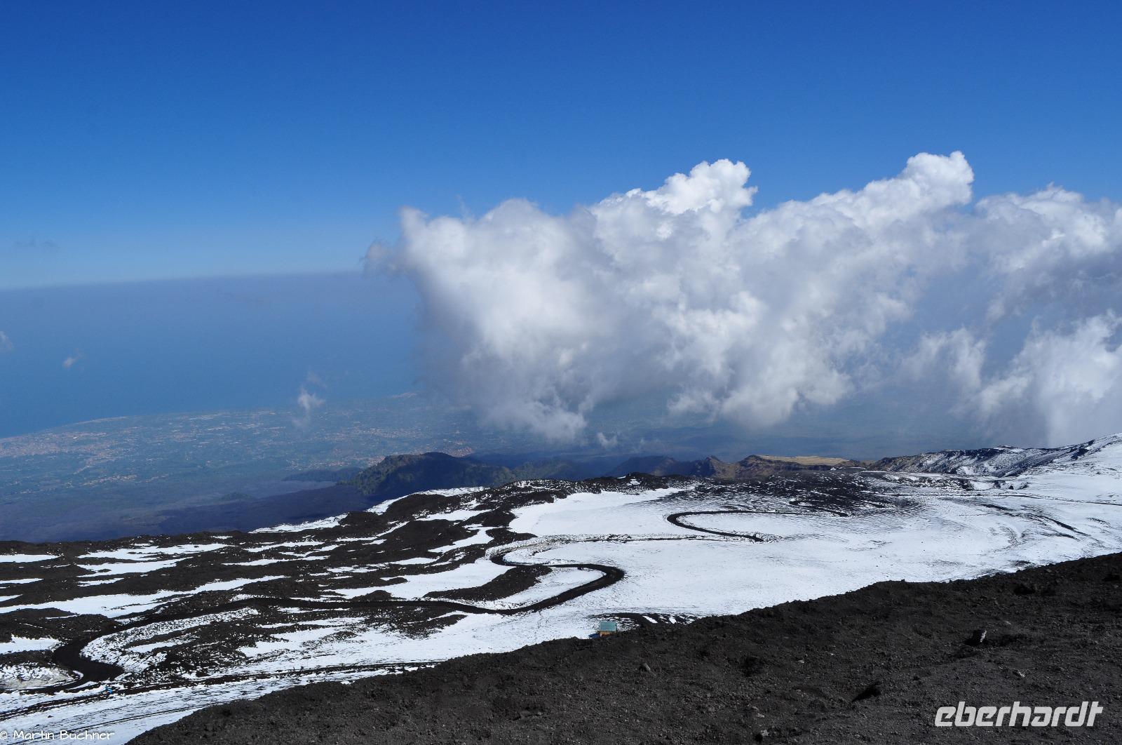Das erste was man an einem solchen Tag tut, ist der Blick zum Ätna. Es ist blauer Himmel, der Ätna ist endlich zu sehen, schneeweiß vom frischen Neuschnee der letzten Tage. Die Gipfelkrater hüllen sich noch in Wolken, lösen sich aber zunehmend auf. Auf zum Ätna!