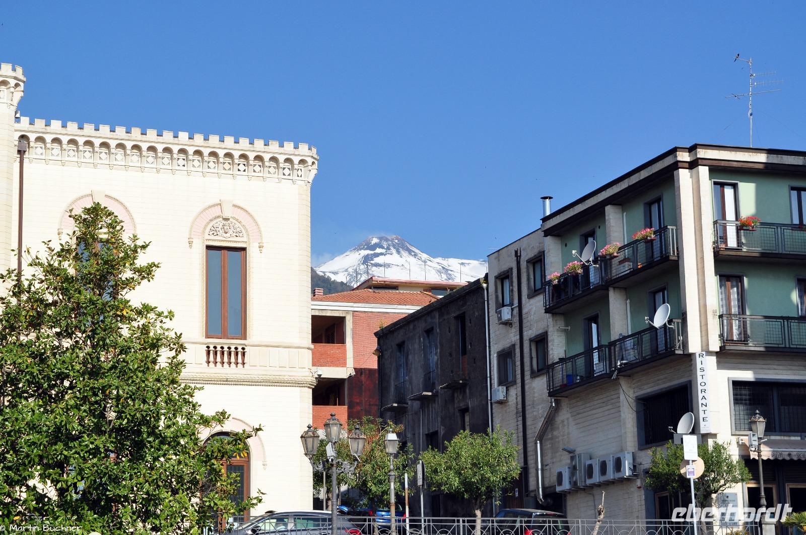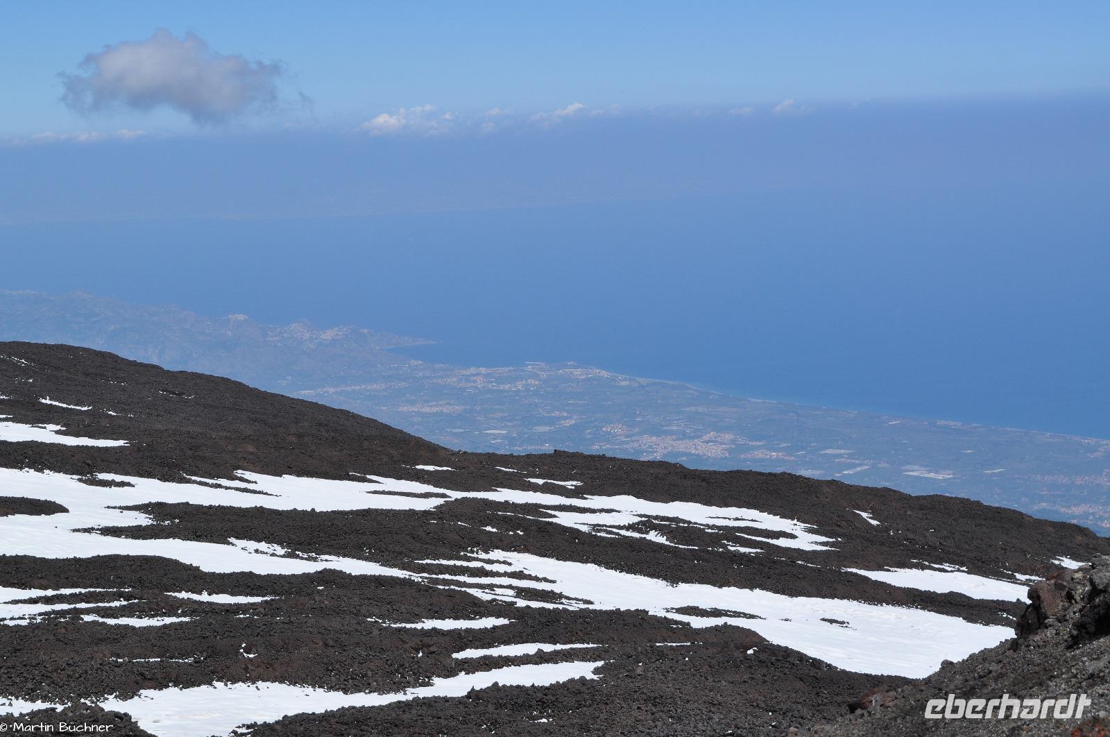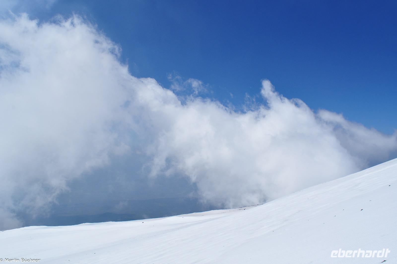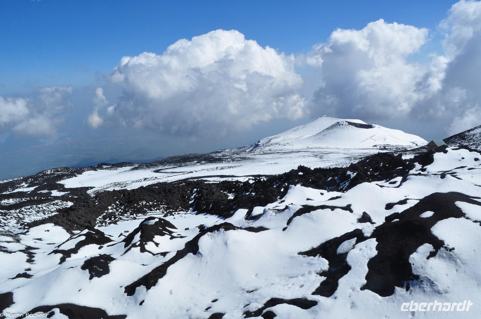 Das erste was man an einem solchen Tag tut, ist der Blick zum Ätna. Es ist blauer Himmel, der Ätna ist endlich zu sehen, schneeweiß vom frischen Neuschnee der letzten Tage. Die Gipfelkrater hüllen sich noch in Wolken, lösen sich aber zunehmend auf. Auf zum Ätna!