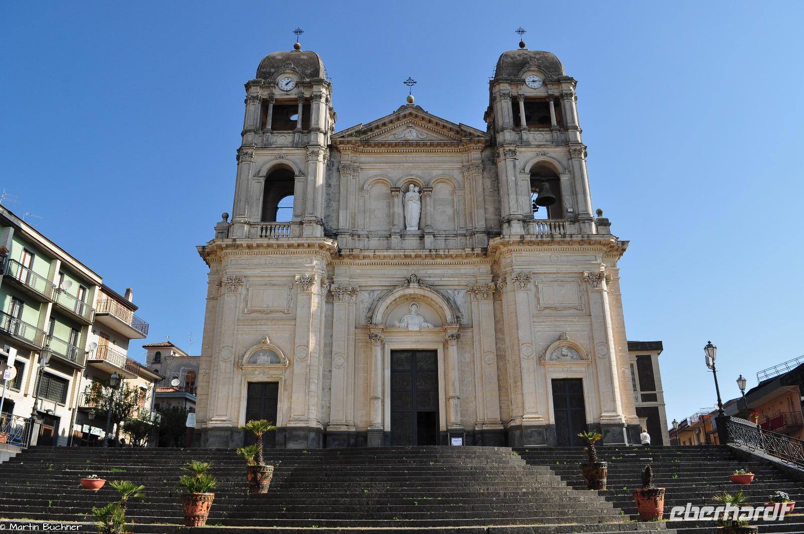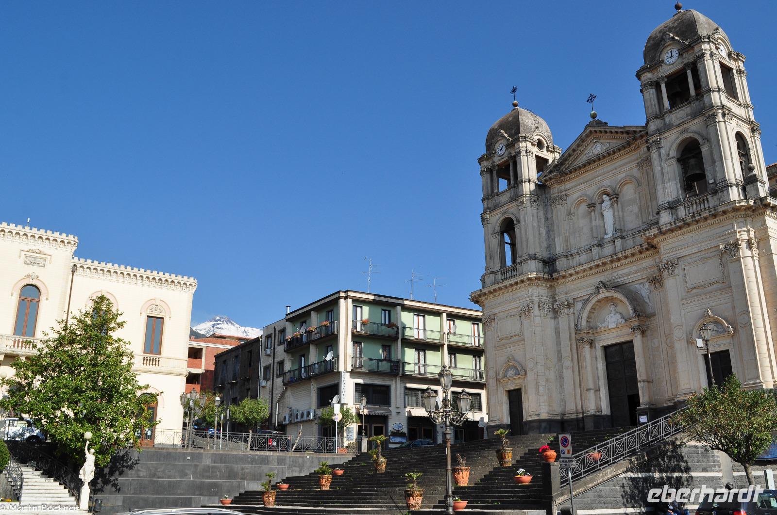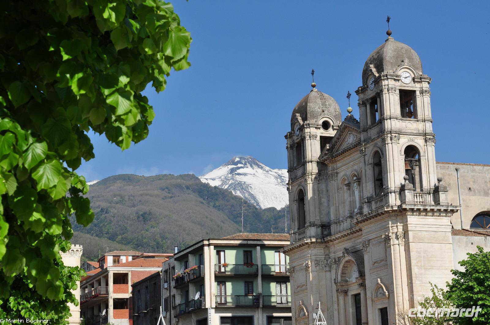 In Zafferana machen wir einen kurzen Stopp. Großartige Kulisse, blauer Himmel, barocke Kirchenfassade und direkt dahinter der markante Südostkrater der Gipfelregion.