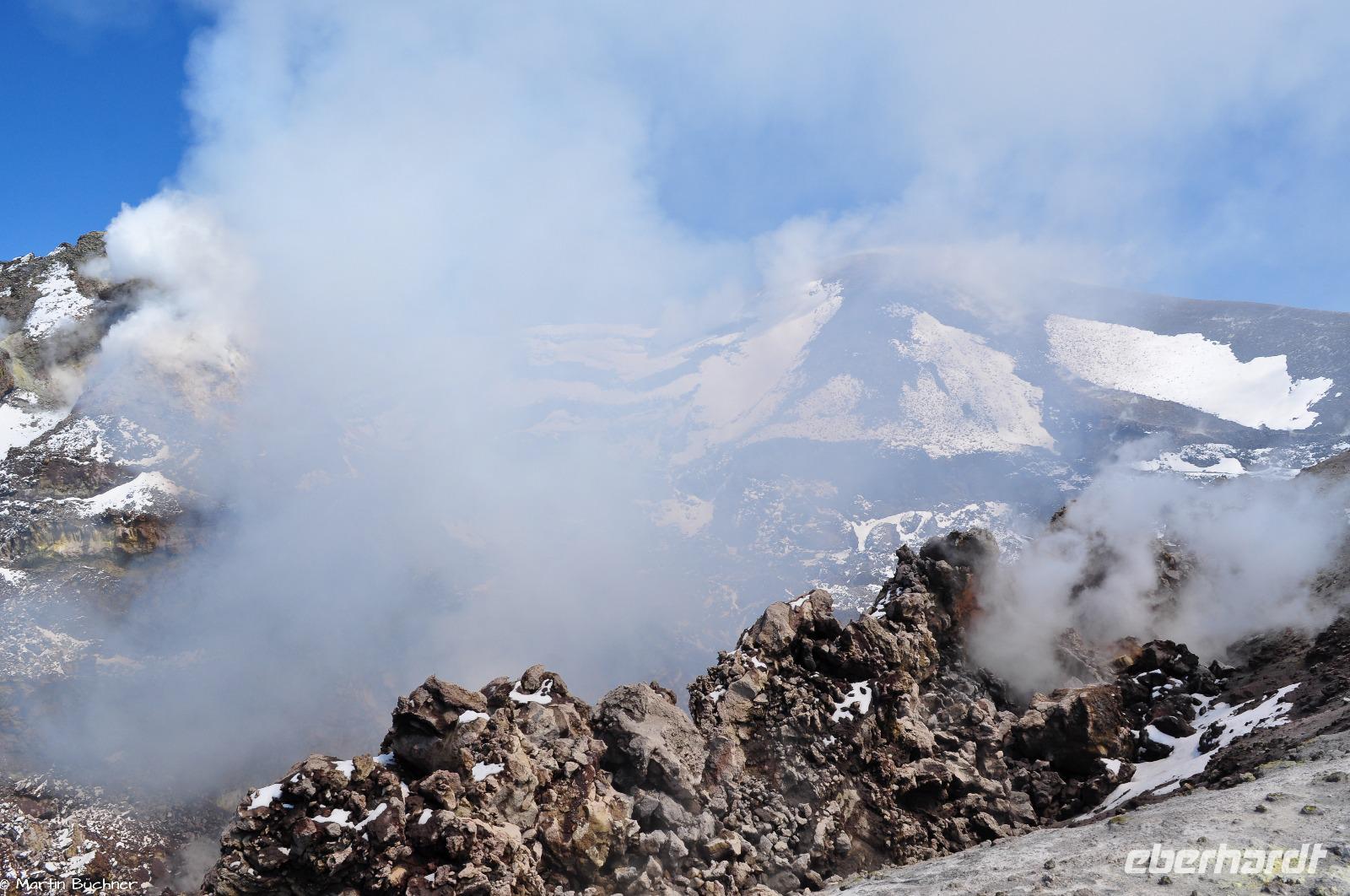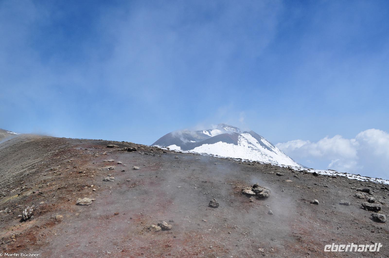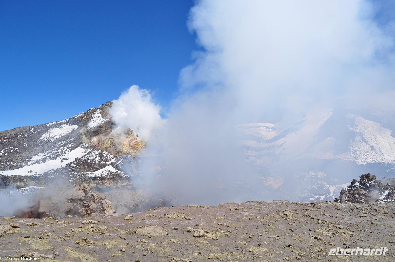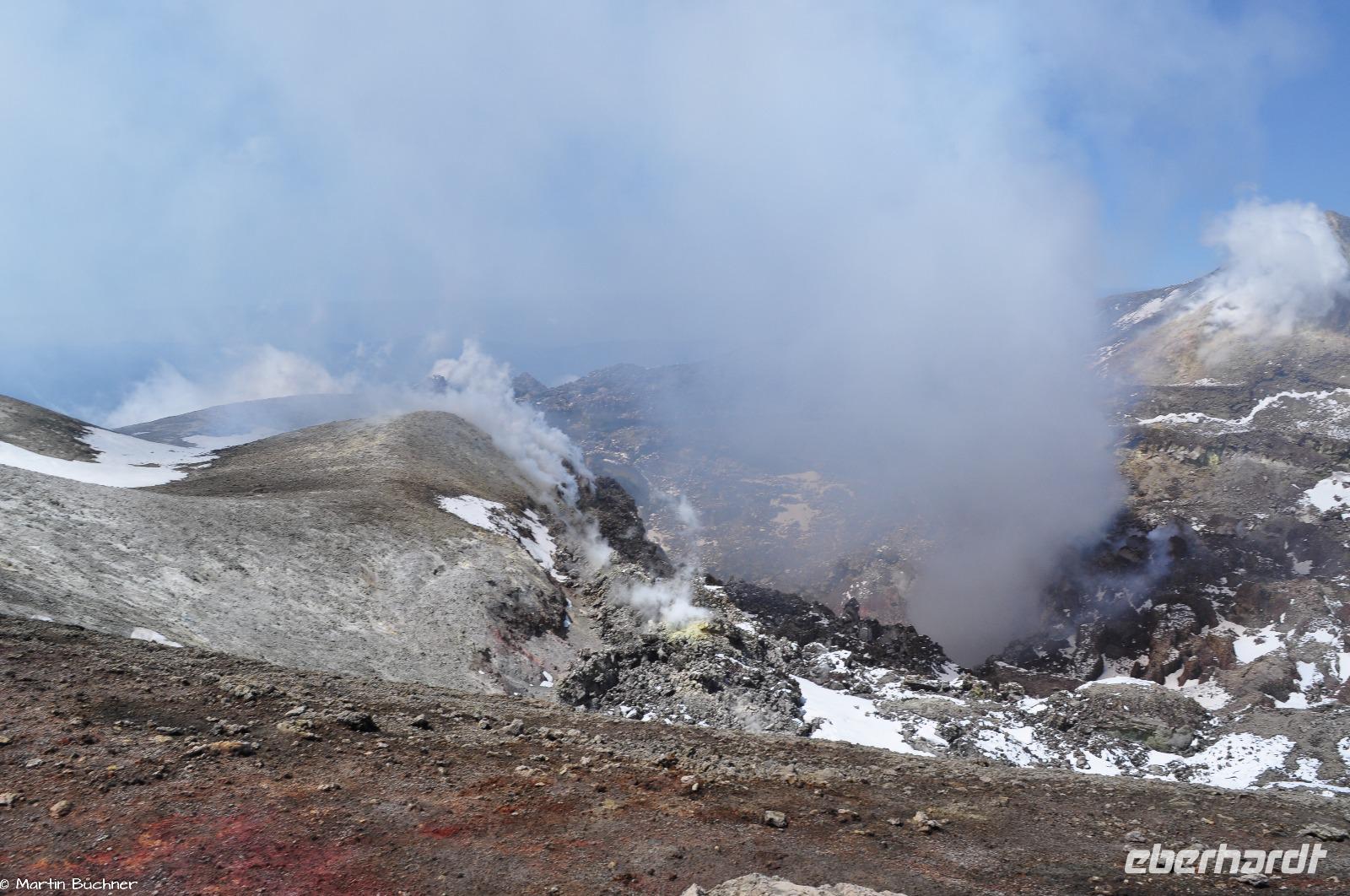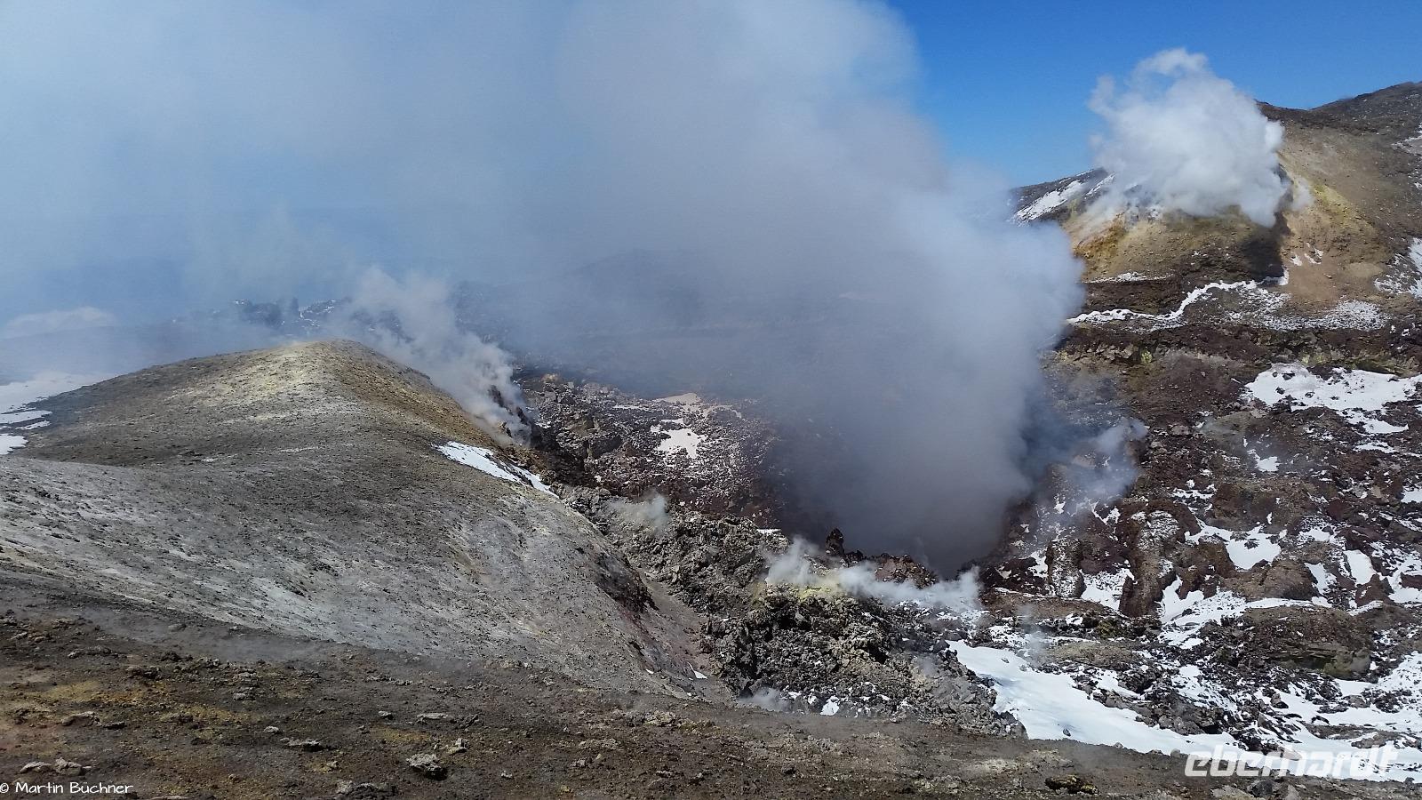 Für mich ist es kaum nachvollziehbar wie sich sehr sich ein geologisches Gebilde in so kurzer Zeit (mein letzter Aufstieg war im Oktober 2015) so radikal verändern kann. Es ist der Ätna - Er kann! Eine vulkanische Aktivität in Form von Ausgasung aus zwei verschiedenen Schloten ist unverkennbar. In regelmäßig Abständen steigt mehr als nur Wasserdampf auf. Die Ausgasung färbt sich dann deutlich dunkler, ein Anzeichen, dass z. B. Ascheteile und Gesteinsbrocken mitgefördert werden. Durch das höhere Gewicht dieser Teile, steigen diese kaum über den Kraterrand auf, sie fallen vorher aus. Daher sieht man diese dunklere Ausgasung nur am Krater, von unten sieht man nur weißen Wasserdampf.