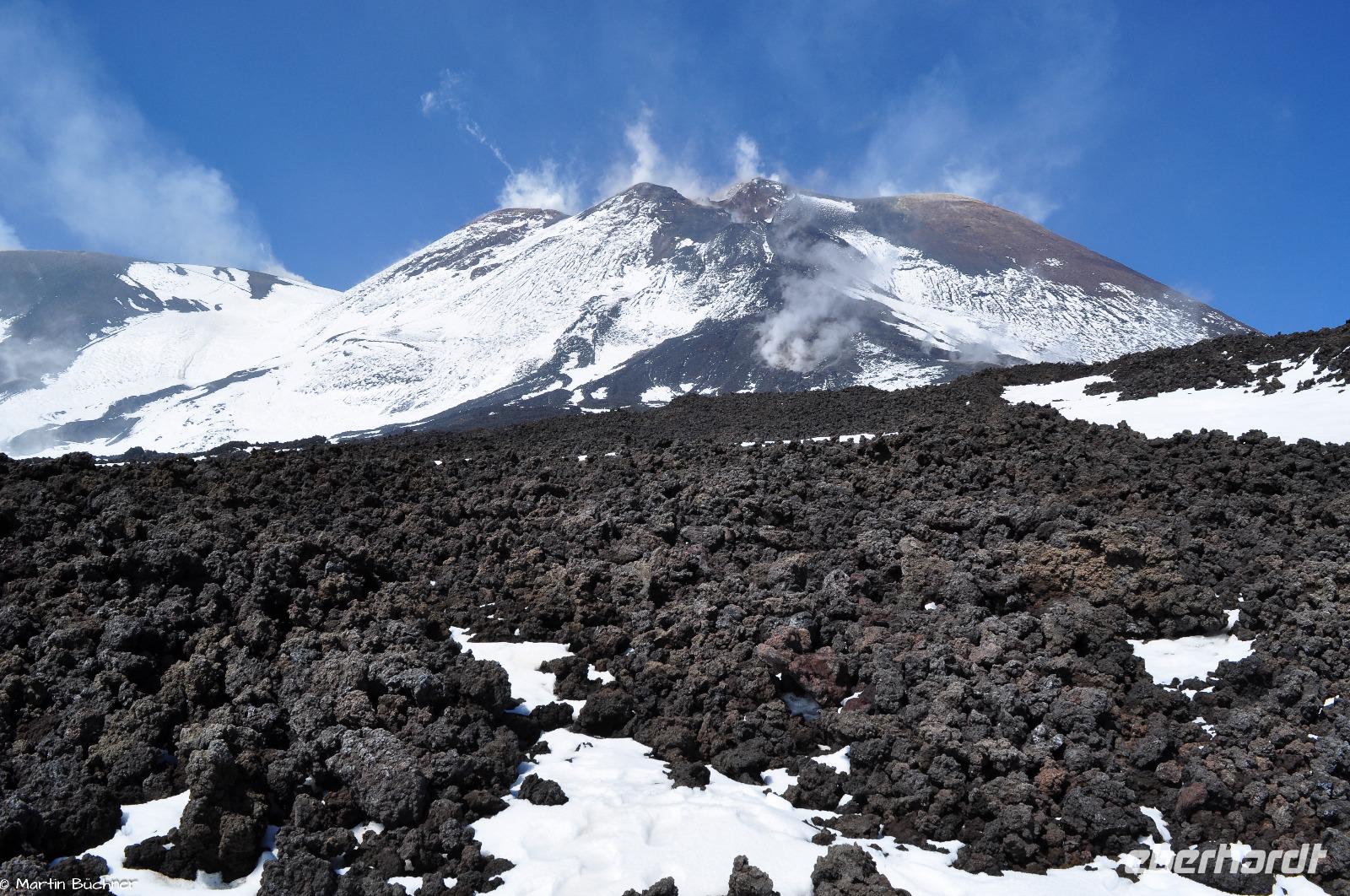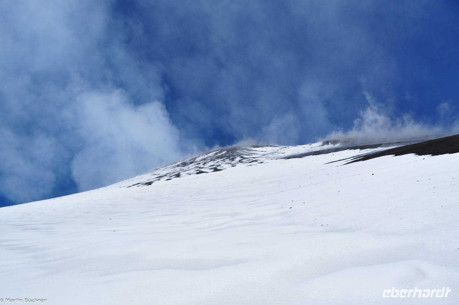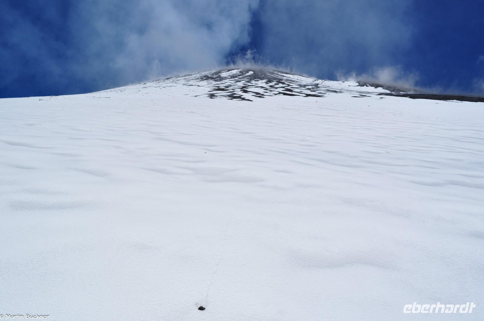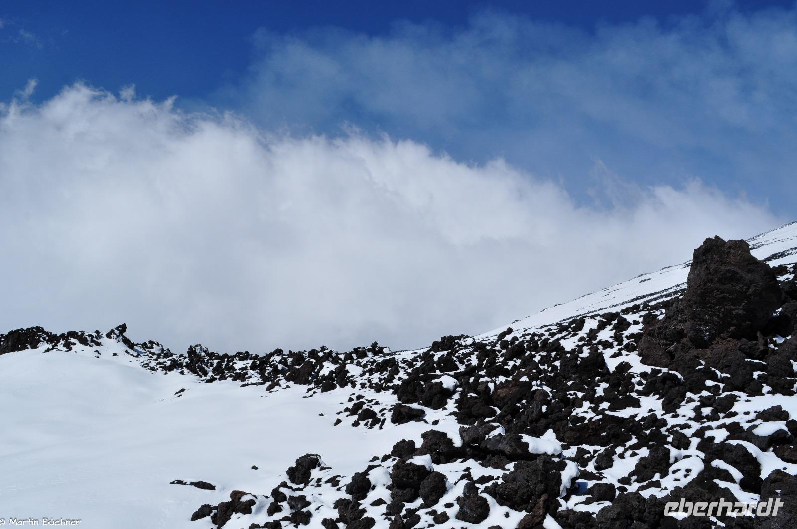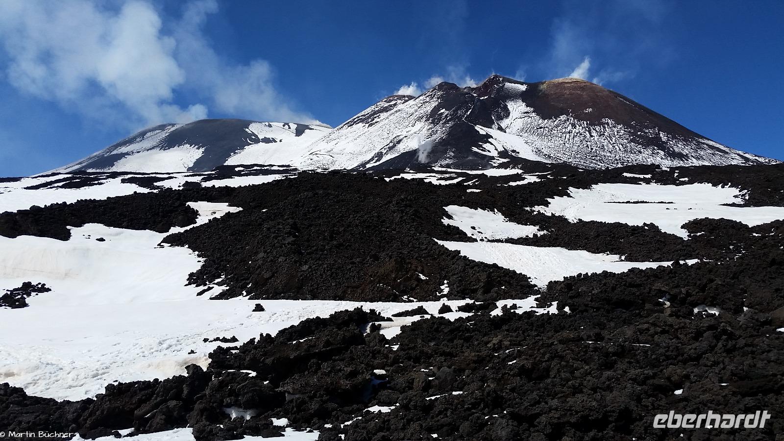 Für mich ist es kaum nachvollziehbar wie sich sehr sich ein geologisches Gebilde in so kurzer Zeit (mein letzter Aufstieg war im Oktober 2015) so radikal verändern kann. Es ist der Ätna - Er kann! Eine vulkanische Aktivität in Form von Ausgasung aus zwei verschiedenen Schloten ist unverkennbar. In regelmäßig Abständen steigt mehr als nur Wasserdampf auf. Die Ausgasung färbt sich dann deutlich dunkler, ein Anzeichen, dass z. B. Ascheteile und Gesteinsbrocken mitgefördert werden. Durch das höhere Gewicht dieser Teile, steigen diese kaum über den Kraterrand auf, sie fallen vorher aus. Daher sieht man diese dunklere Ausgasung nur am Krater, von unten sieht man nur weißen Wasserdampf.