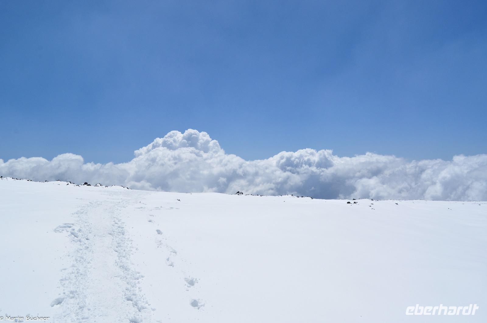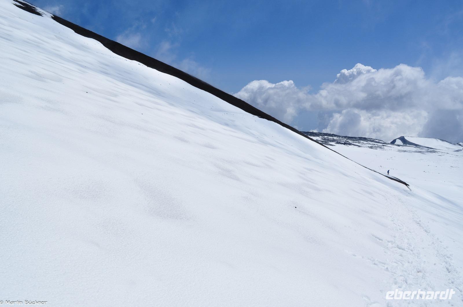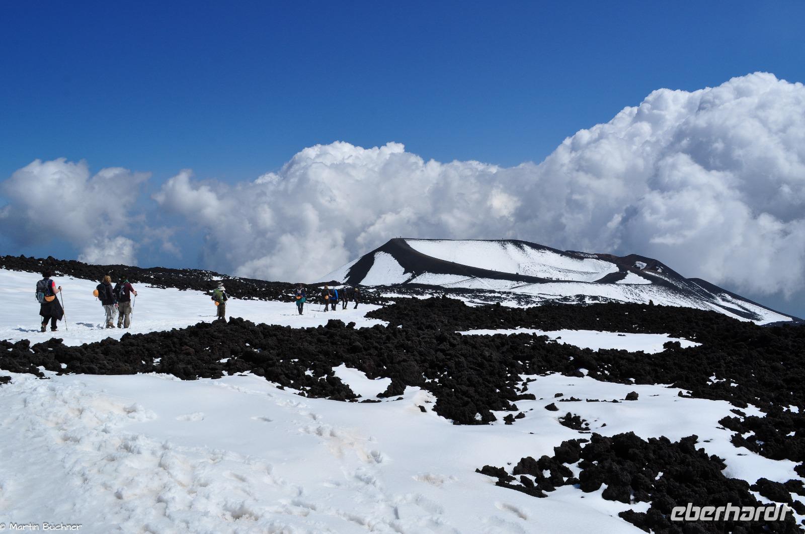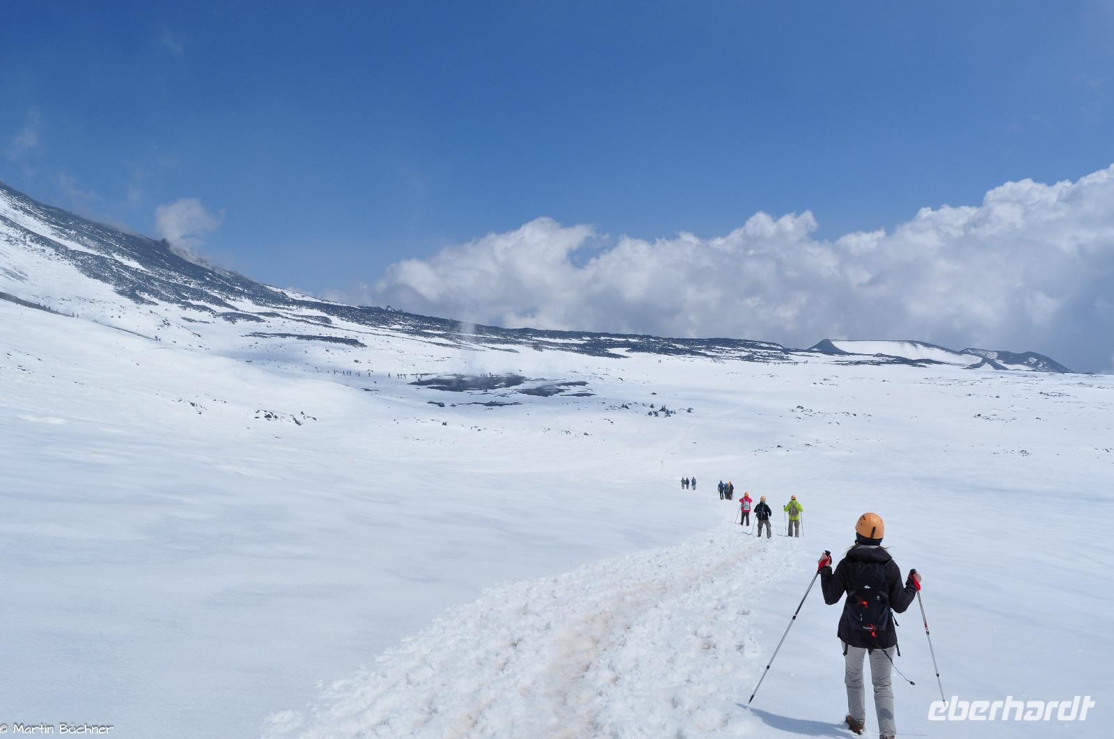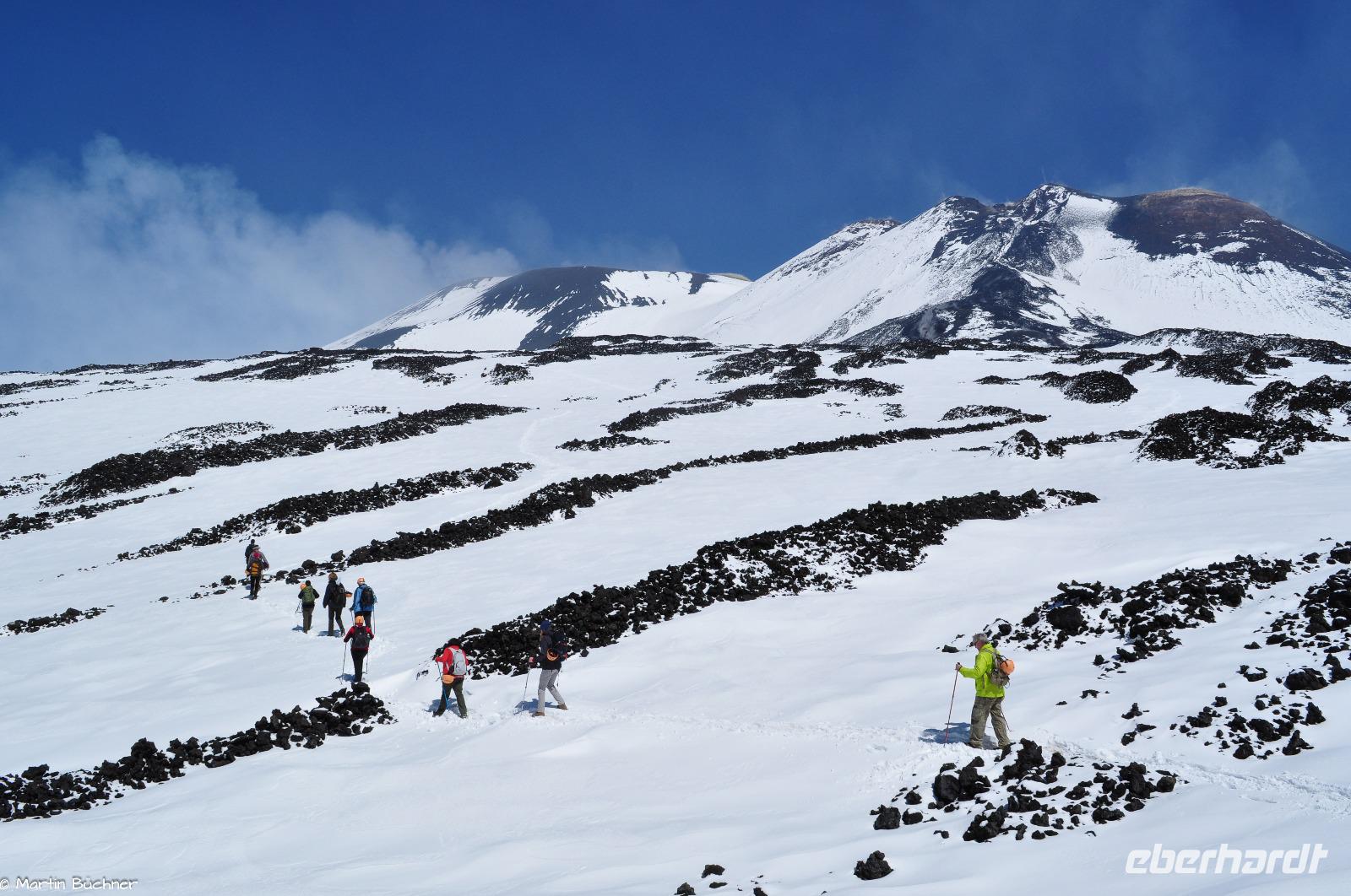 Nach unserer Ankunft am Kraterrand an der südwestlichen Seite folgen wir diesem in Richtung Südost-Seite. Nach weiteren großartigen Ausblicken steigen wir über ein heute etwas gefrorenes Aschefeld wieder zum Torre del Filosofo ab.
