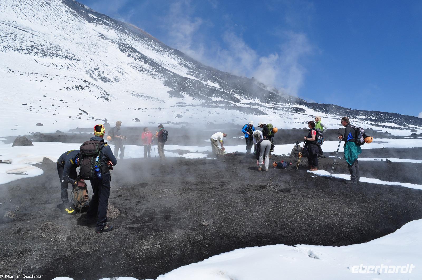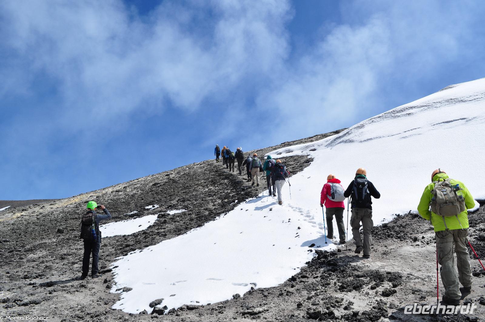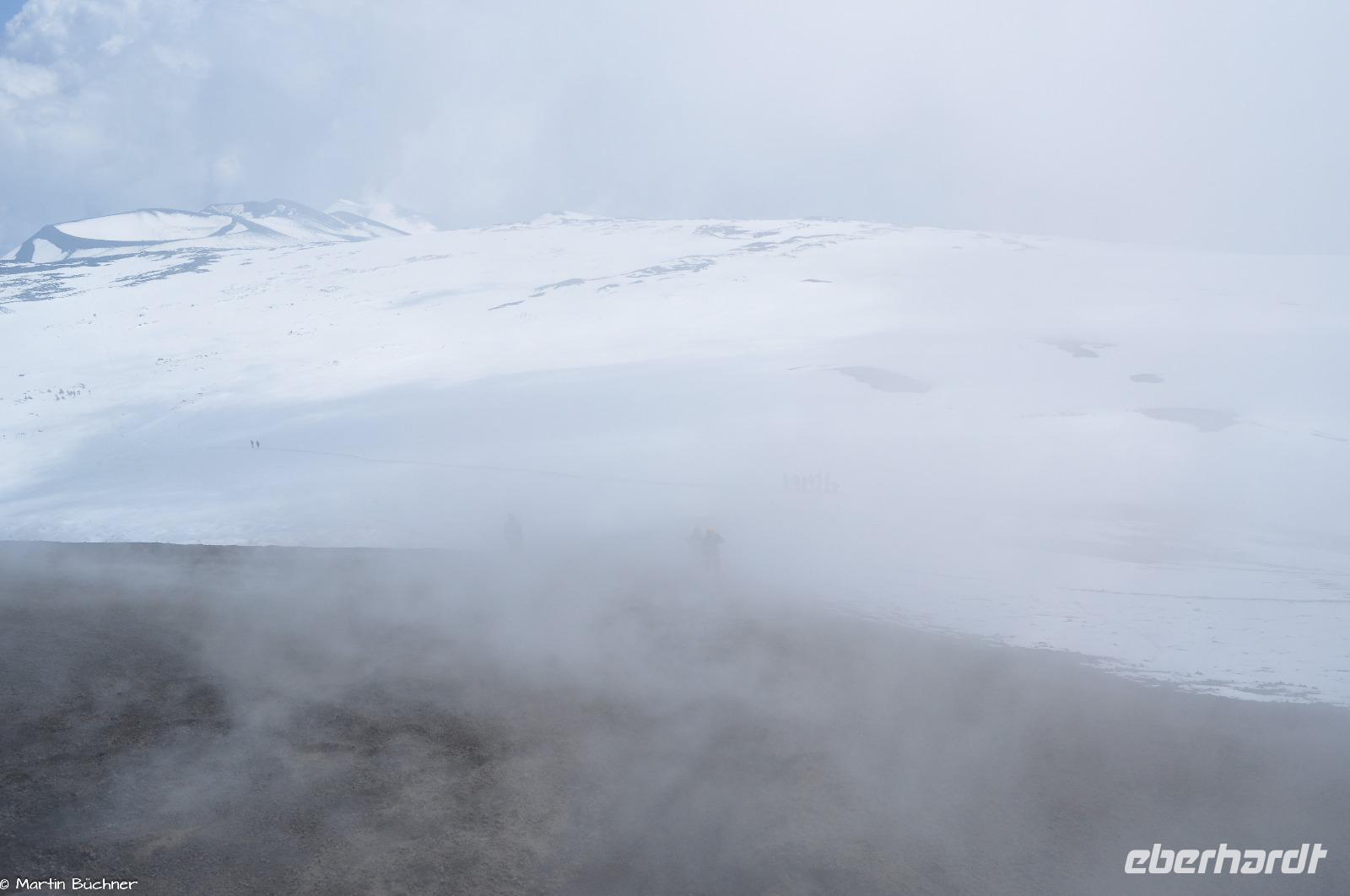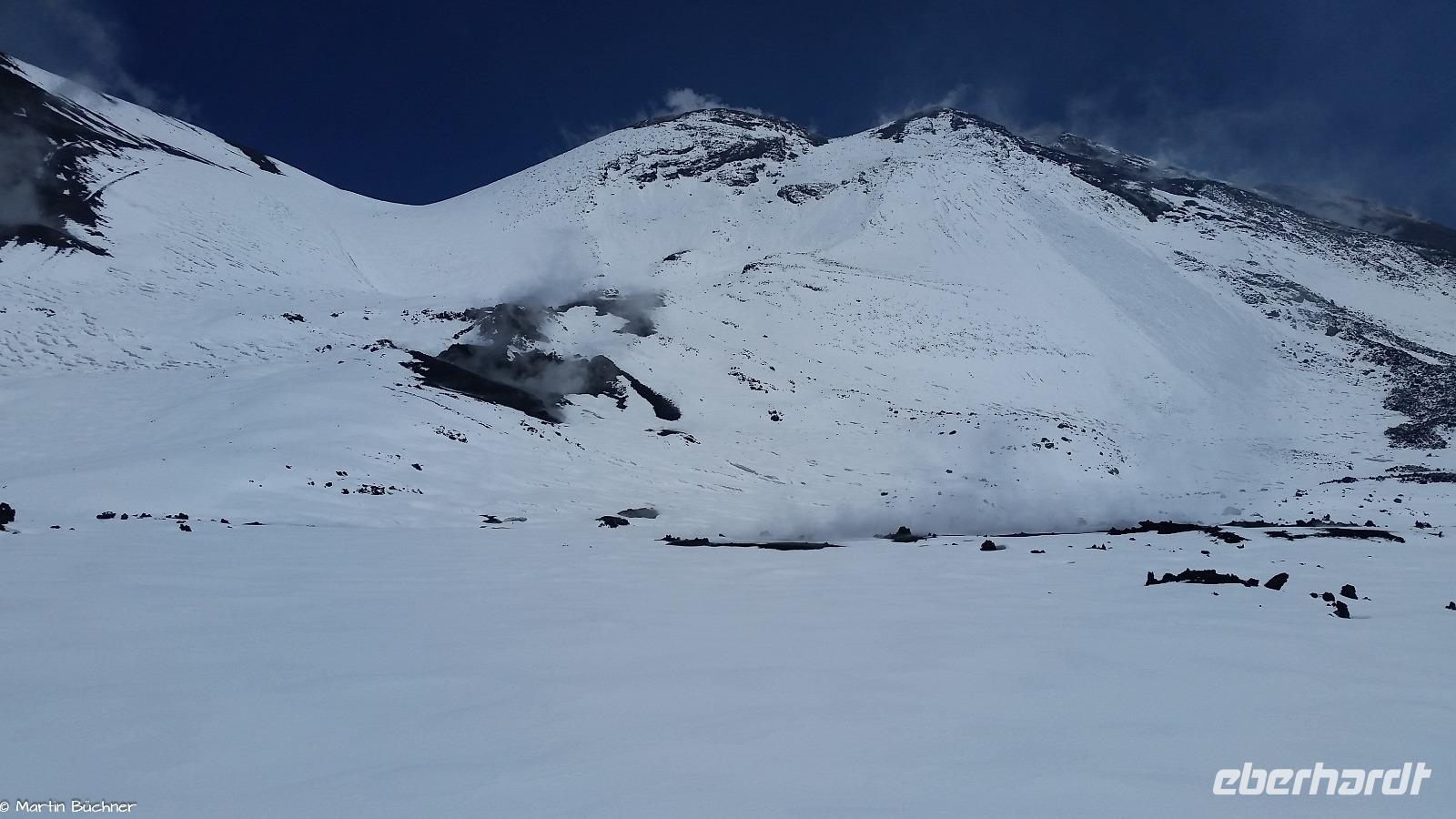 Von hier aus bringen uns Allradbusse zum Torre del Filosofo auf etwa 2.920 m. Es bietet sich ein bizarres Bild aus Eis, Schnee und vulkanischer Aktivität in Form von Dämpfen und schwarzer Lava.