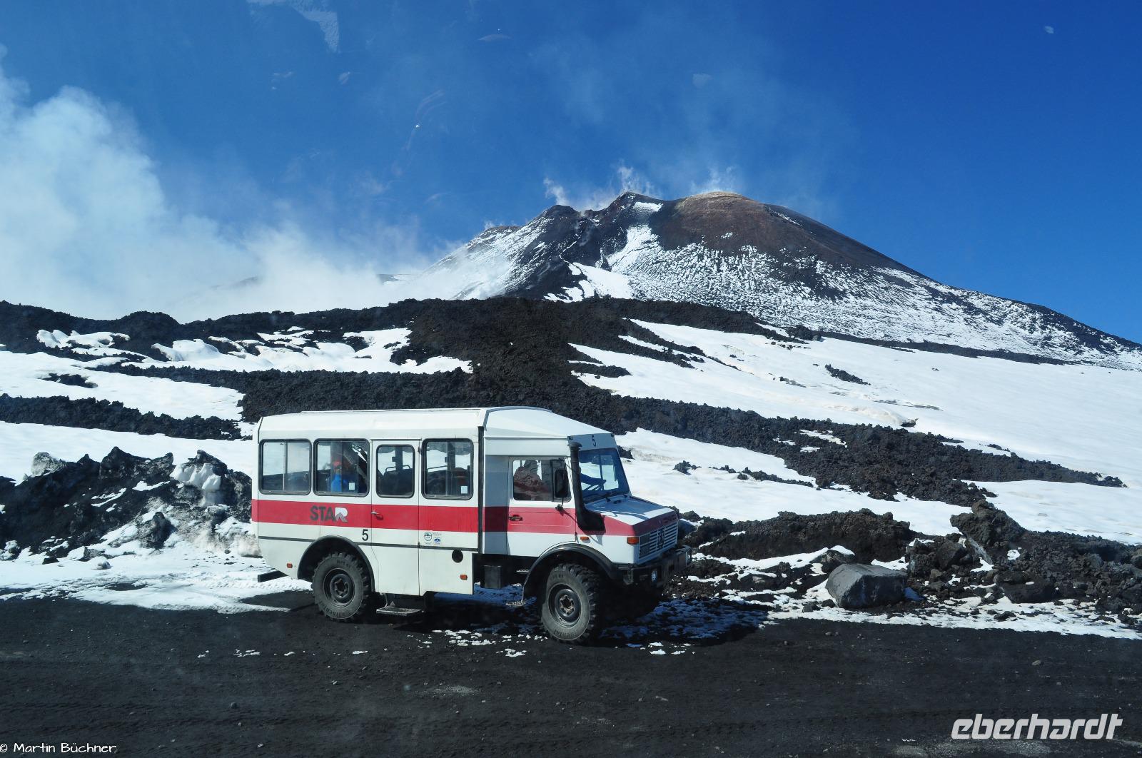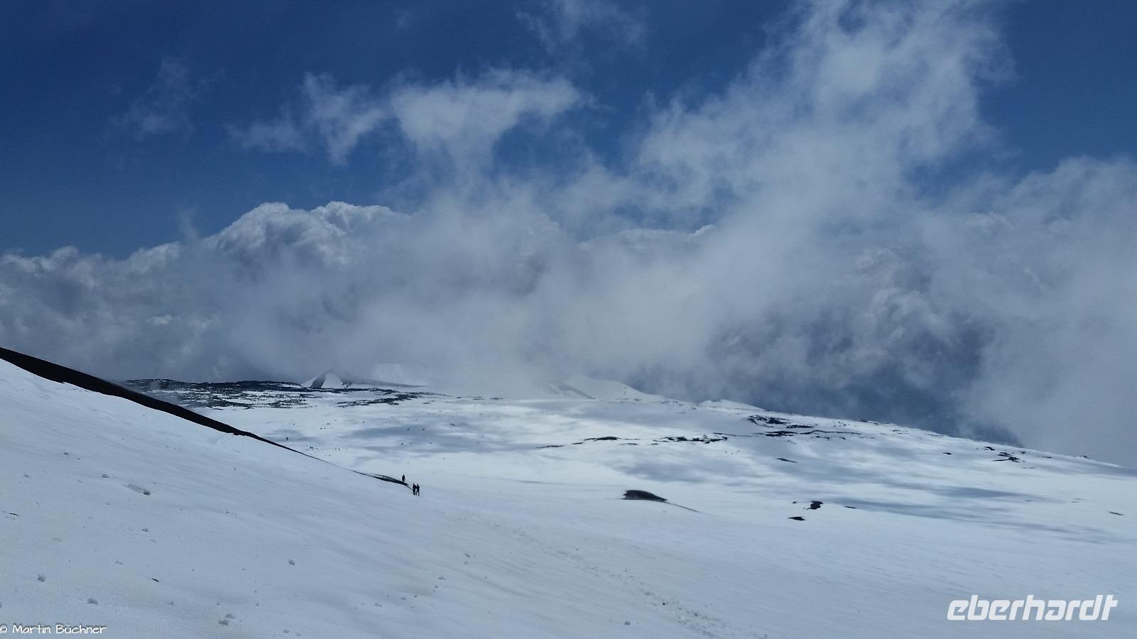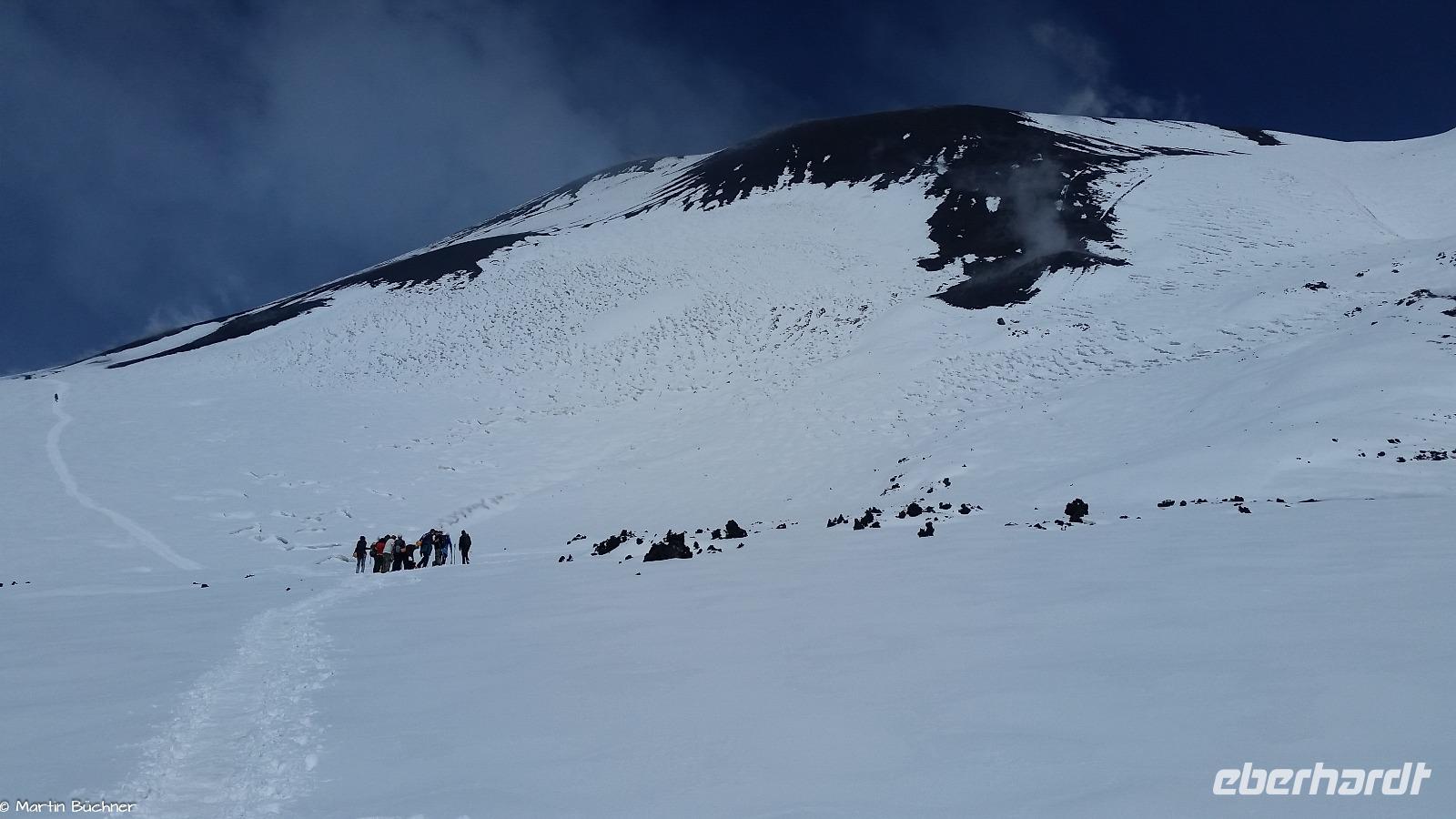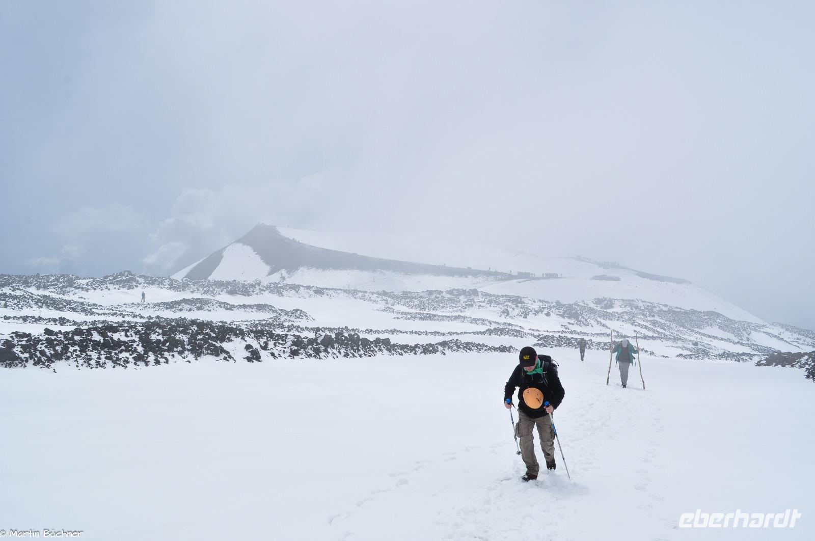 Von hier aus bringen uns Allradbusse zum Torre del Filosofo auf etwa 2.920 m. Es bietet sich ein bizarres Bild aus Eis, Schnee und vulkanischer Aktivität in Form von Dämpfen und schwarzer Lava.