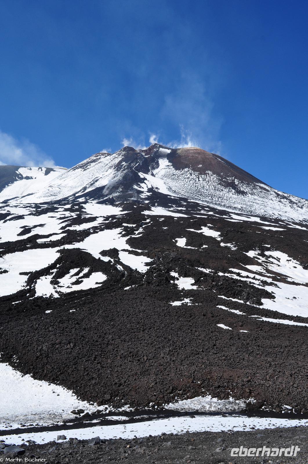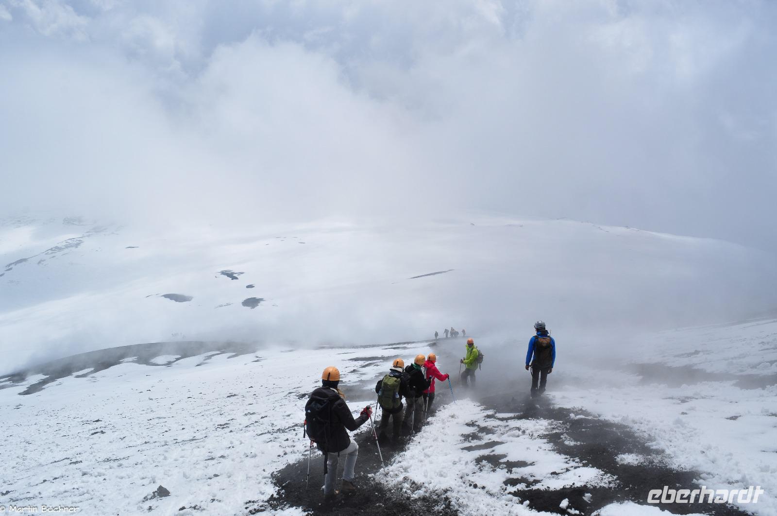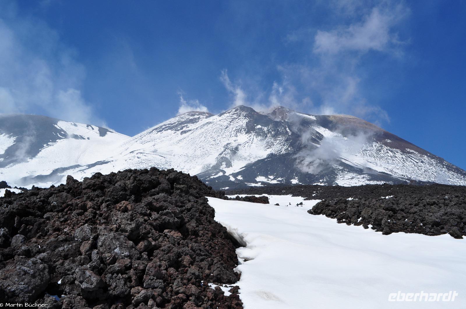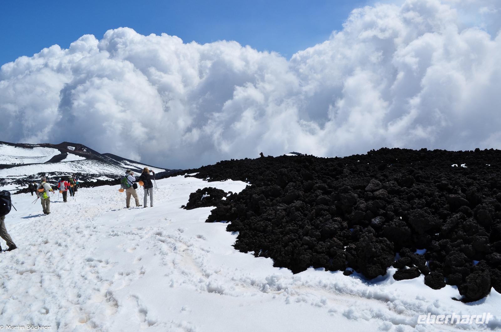 Von hier aus bringen uns Allradbusse zum Torre del Filosofo auf etwa 2.920 m. Es bietet sich ein bizarres Bild aus Eis, Schnee und vulkanischer Aktivität in Form von Dämpfen und schwarzer Lava.