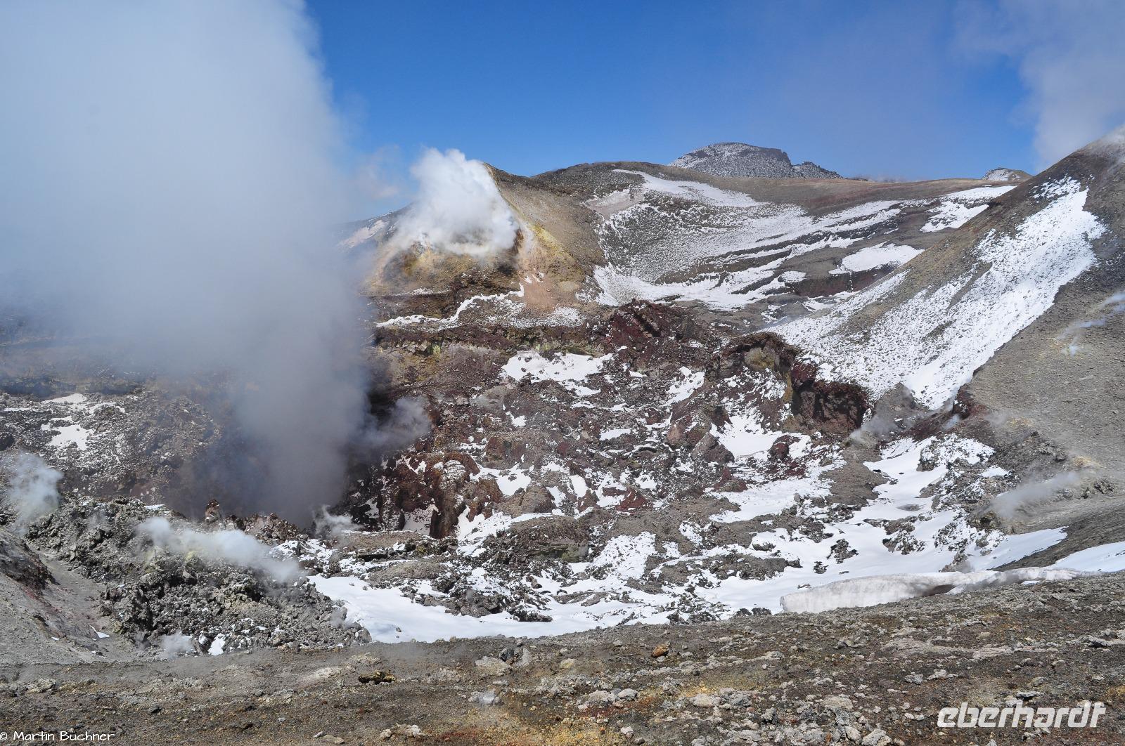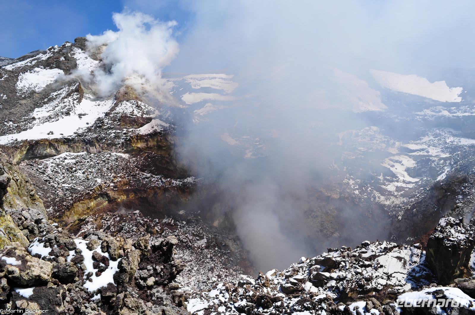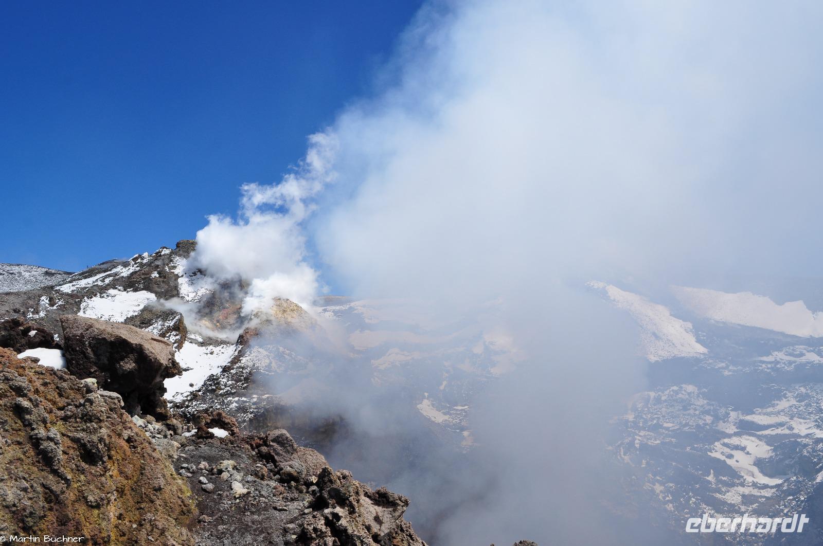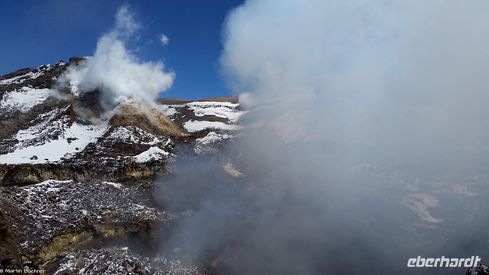 Wir steigen auf bis zum Kraterrand, man nimmt sofort die stark schwefelhaltigen und ätzenden Fumarolen wahr. Entlang des westlichen Kraterrandes steigen auf bis zum höchsten Punkt.