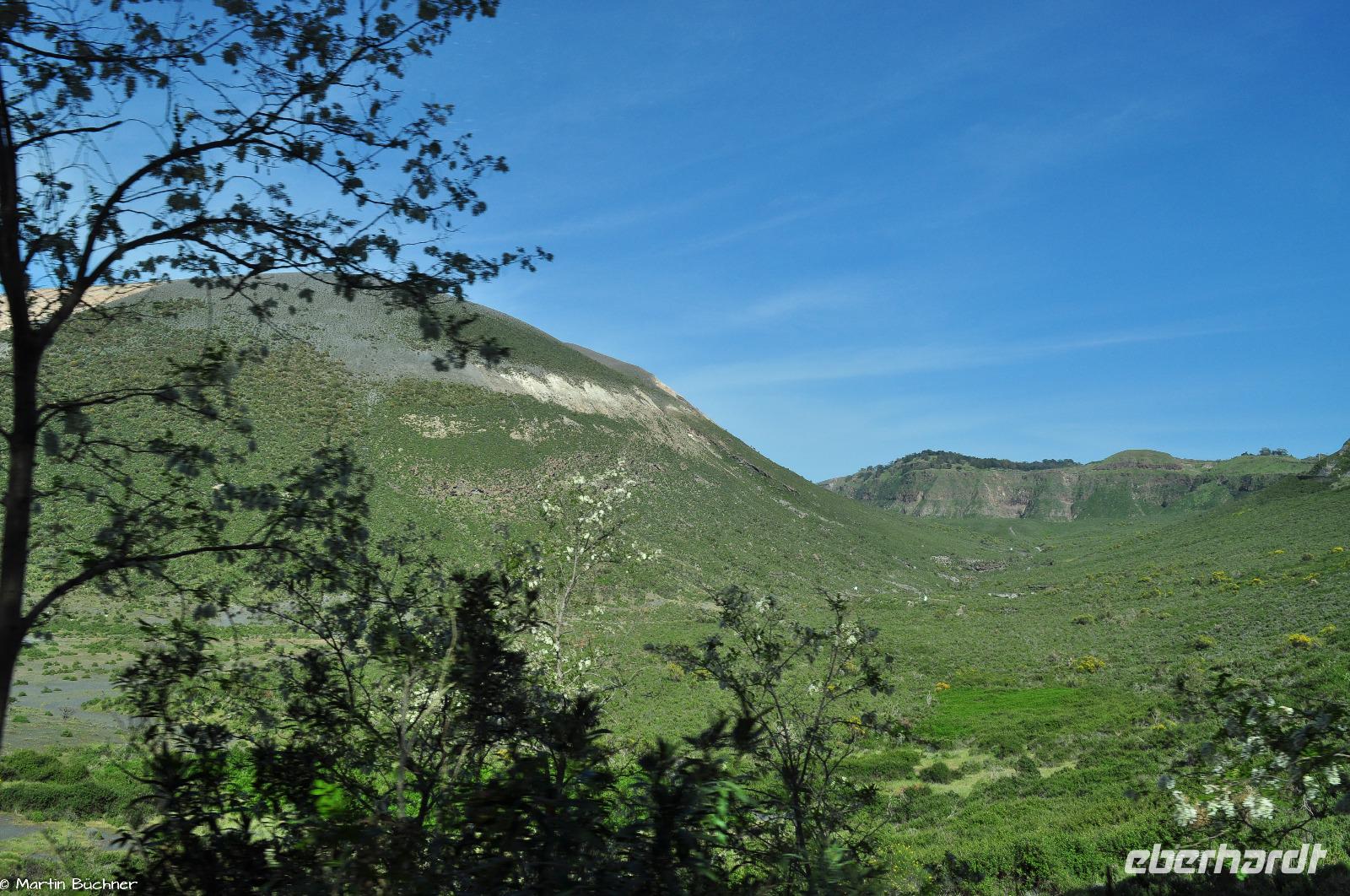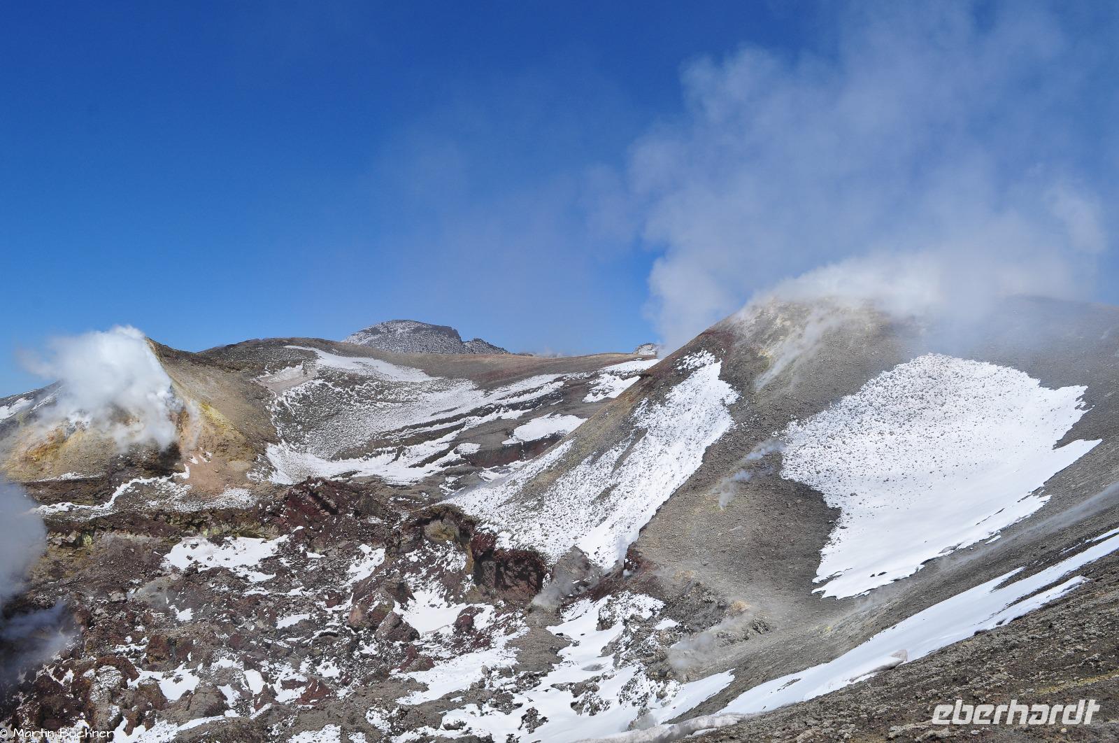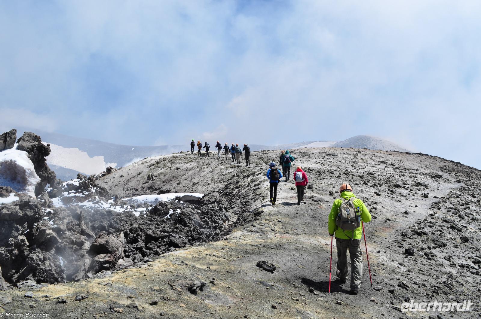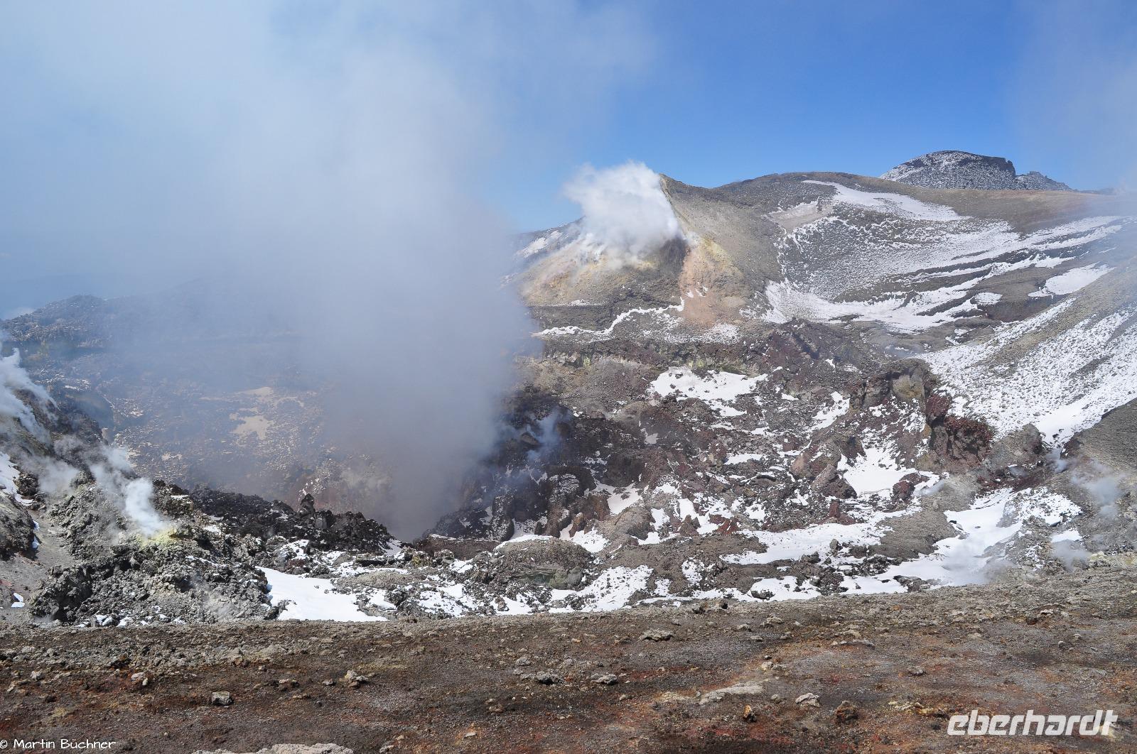 Wir steigen auf bis zum Kraterrand, man nimmt sofort die stark schwefelhaltigen und ätzenden Fumarolen wahr. Entlang des westlichen Kraterrandes steigen auf bis zum höchsten Punkt.
