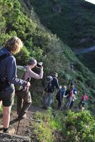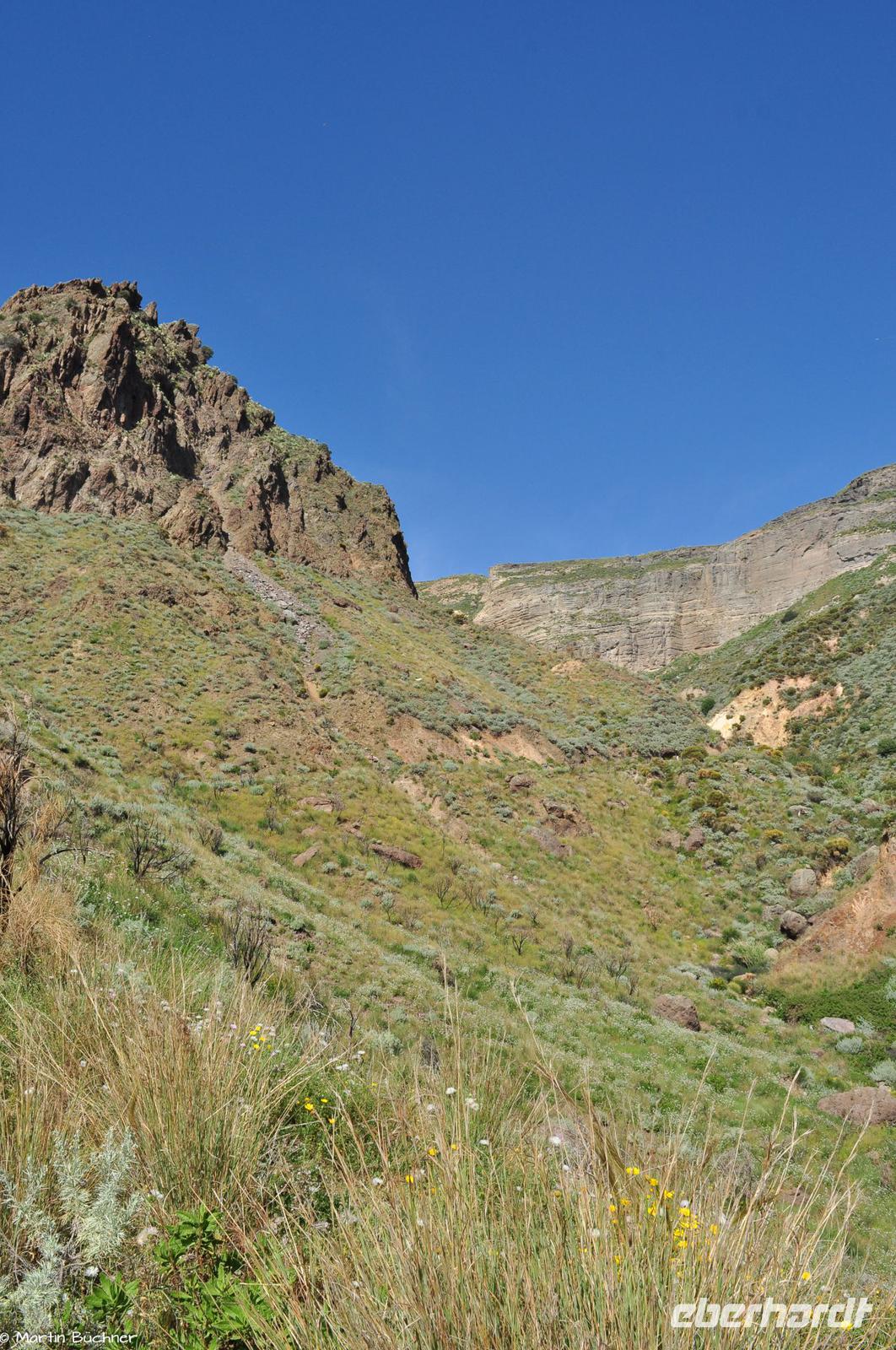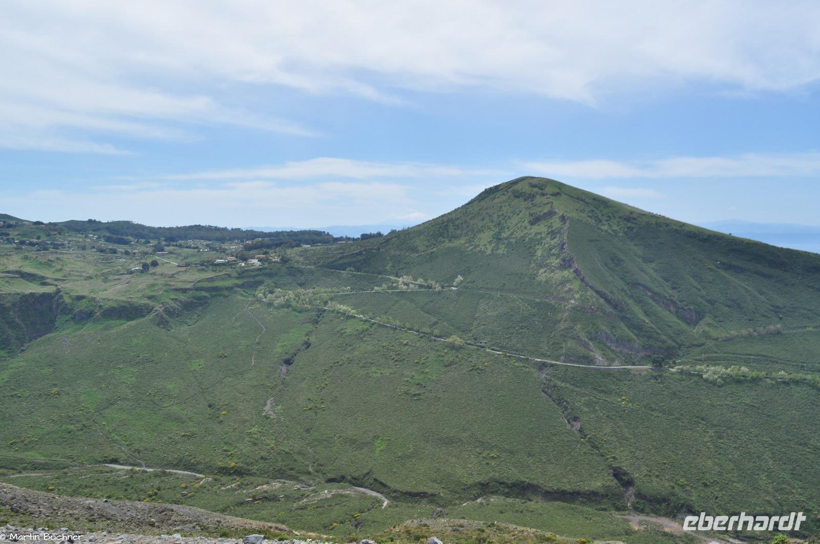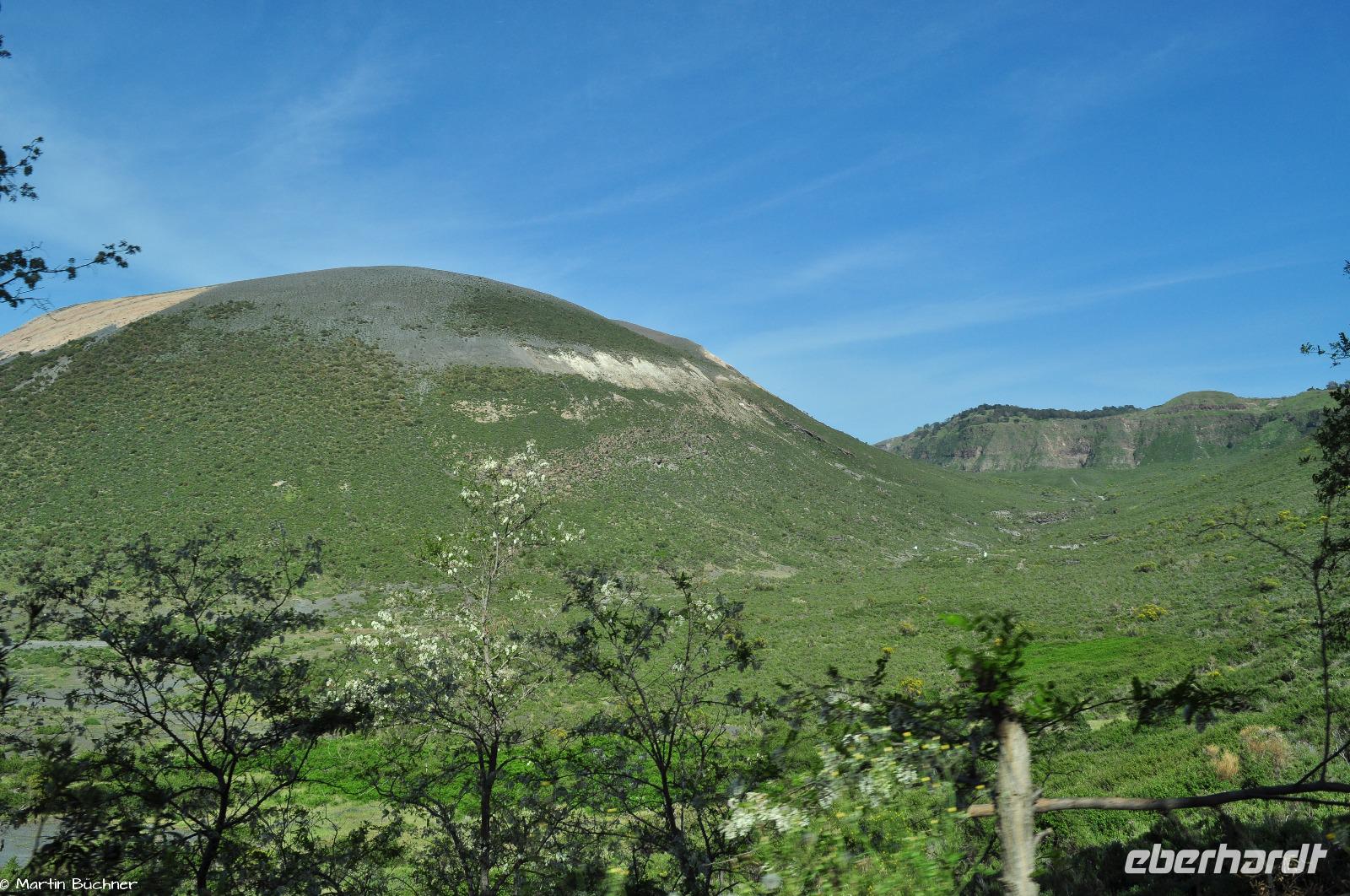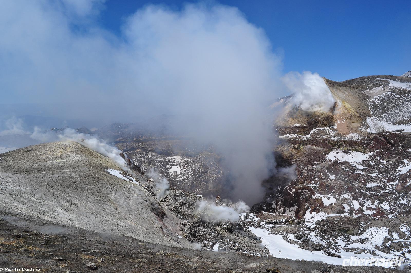 Wir steigen auf bis zum Kraterrand, man nimmt sofort die stark schwefelhaltigen und ätzenden Fumarolen wahr. Entlang des westlichen Kraterrandes steigen auf bis zum höchsten Punkt.