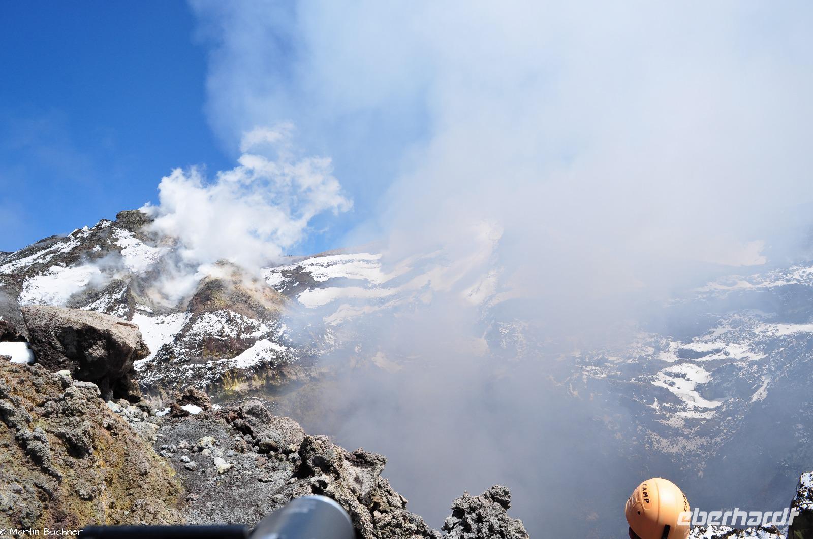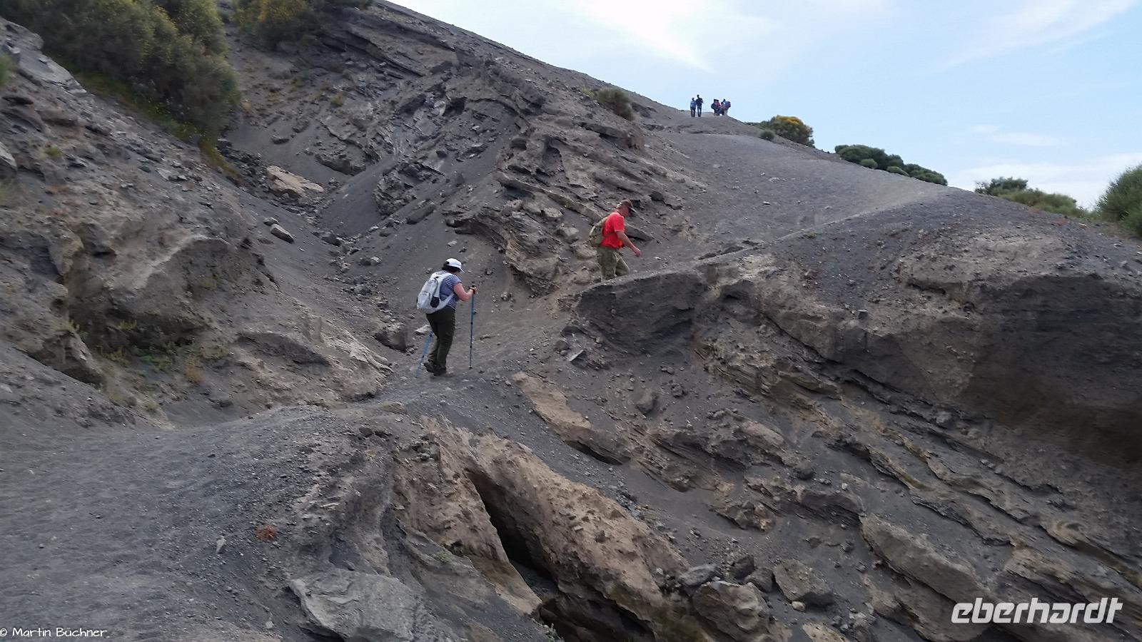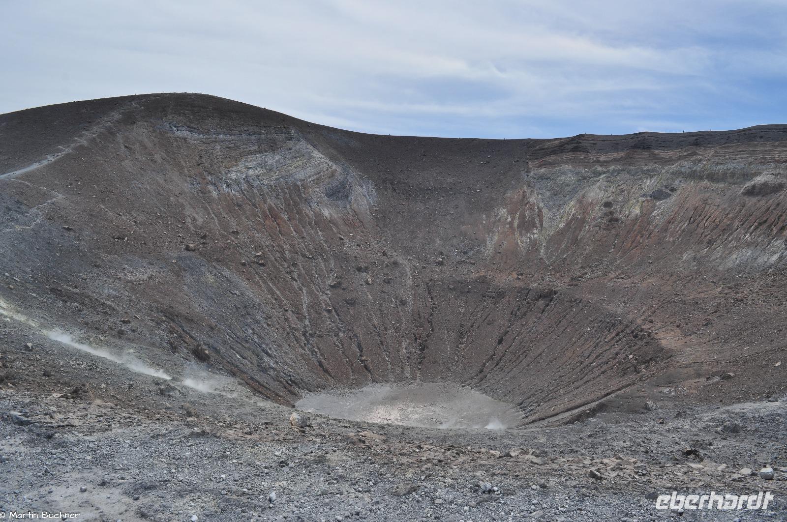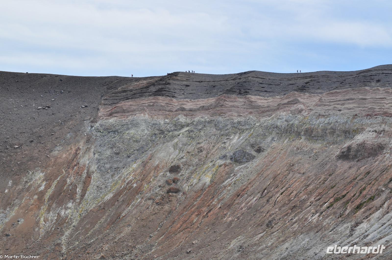 Die Aktivität kann auch ein Laie wahrnehmen, daher ist es uns völlig unverständlich, dass trotz Warnungen und Verbote Individualtouristen in unzureichender Kleidung, ohne Helm und in Turnschuhen den Weg hier herauffinden. Einer ist hier oben am Kraterrand sogar mit einem Mountainbike unterwegs.
