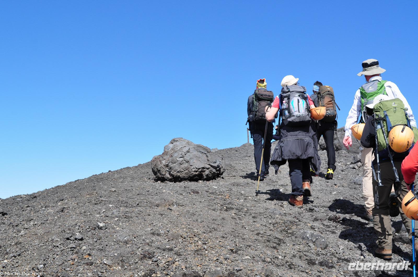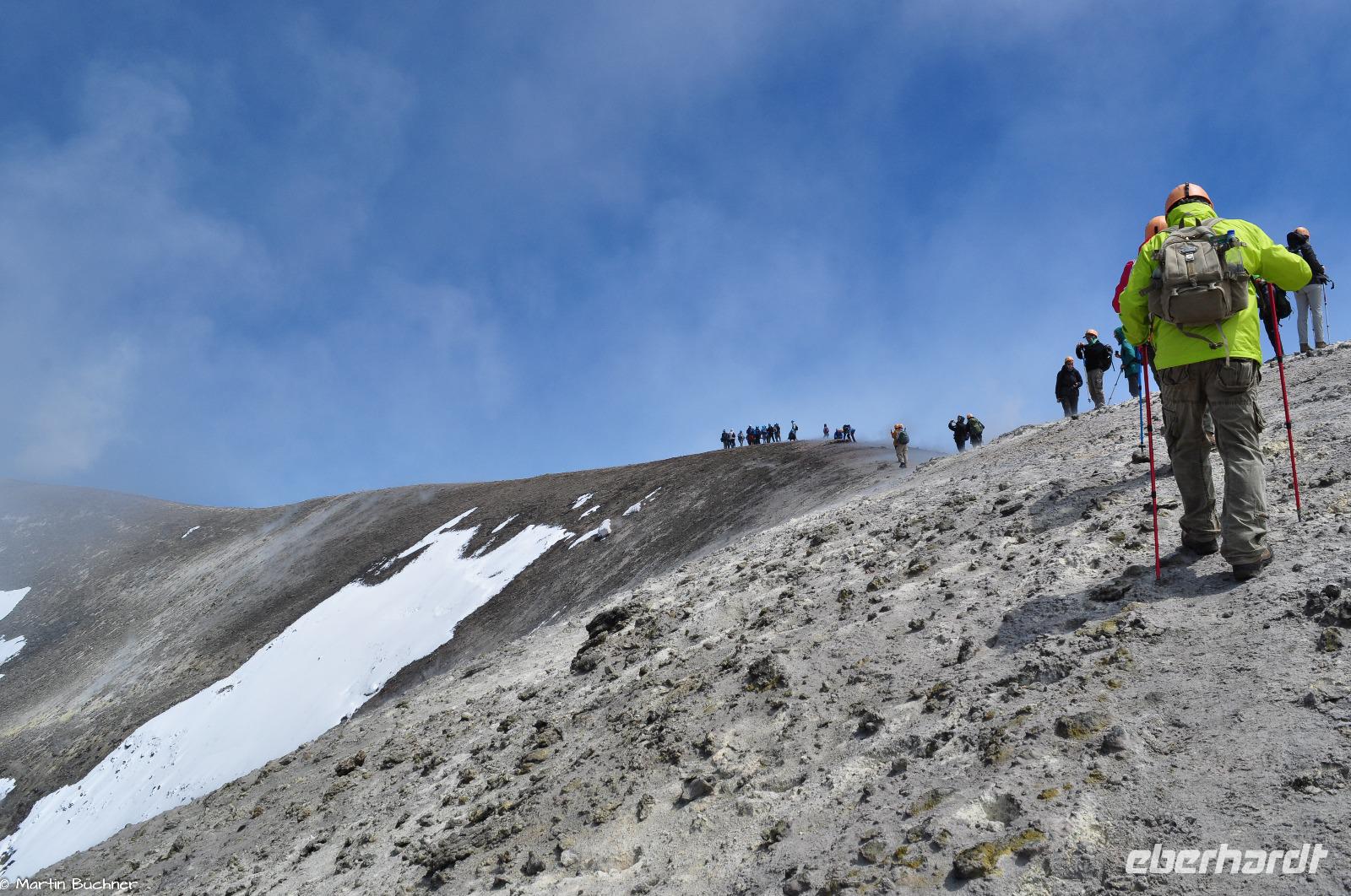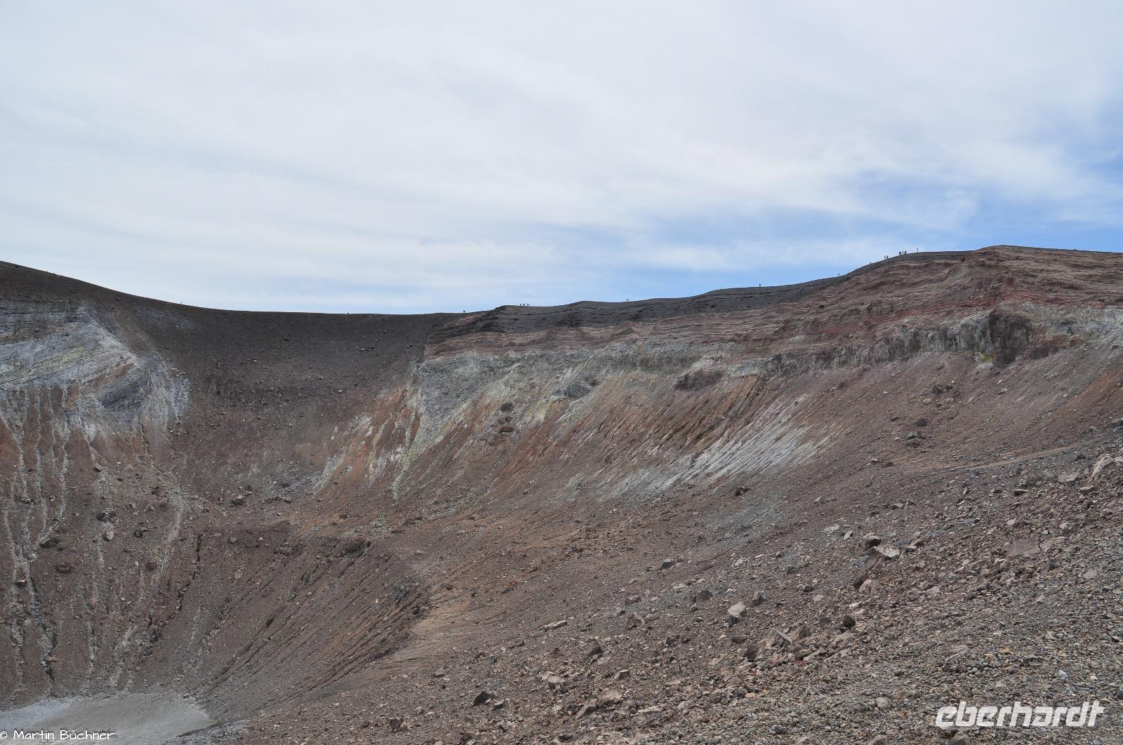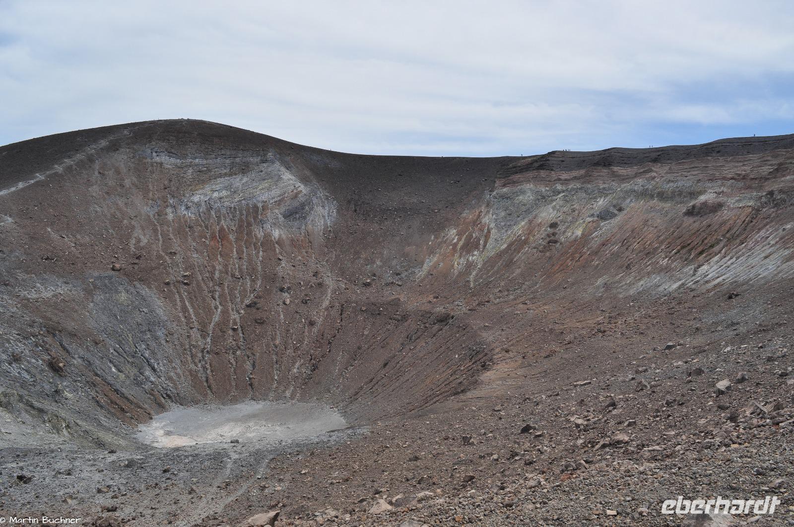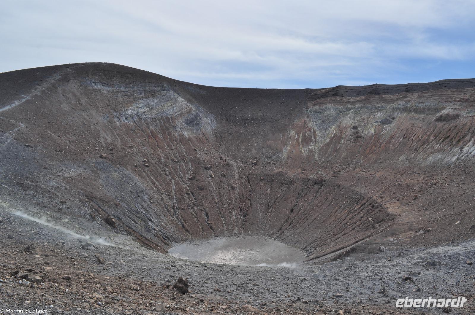 Die Aktivität kann auch ein Laie wahrnehmen, daher ist es uns völlig unverständlich, dass trotz Warnungen und Verbote Individualtouristen in unzureichender Kleidung, ohne Helm und in Turnschuhen den Weg hier herauffinden. Einer ist hier oben am Kraterrand sogar mit einem Mountainbike unterwegs.