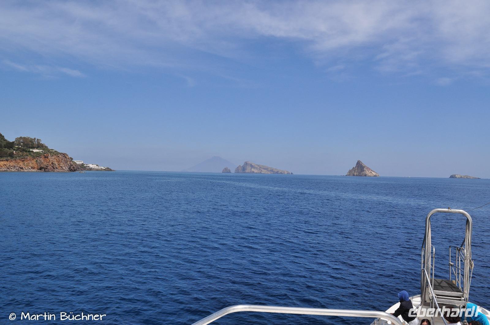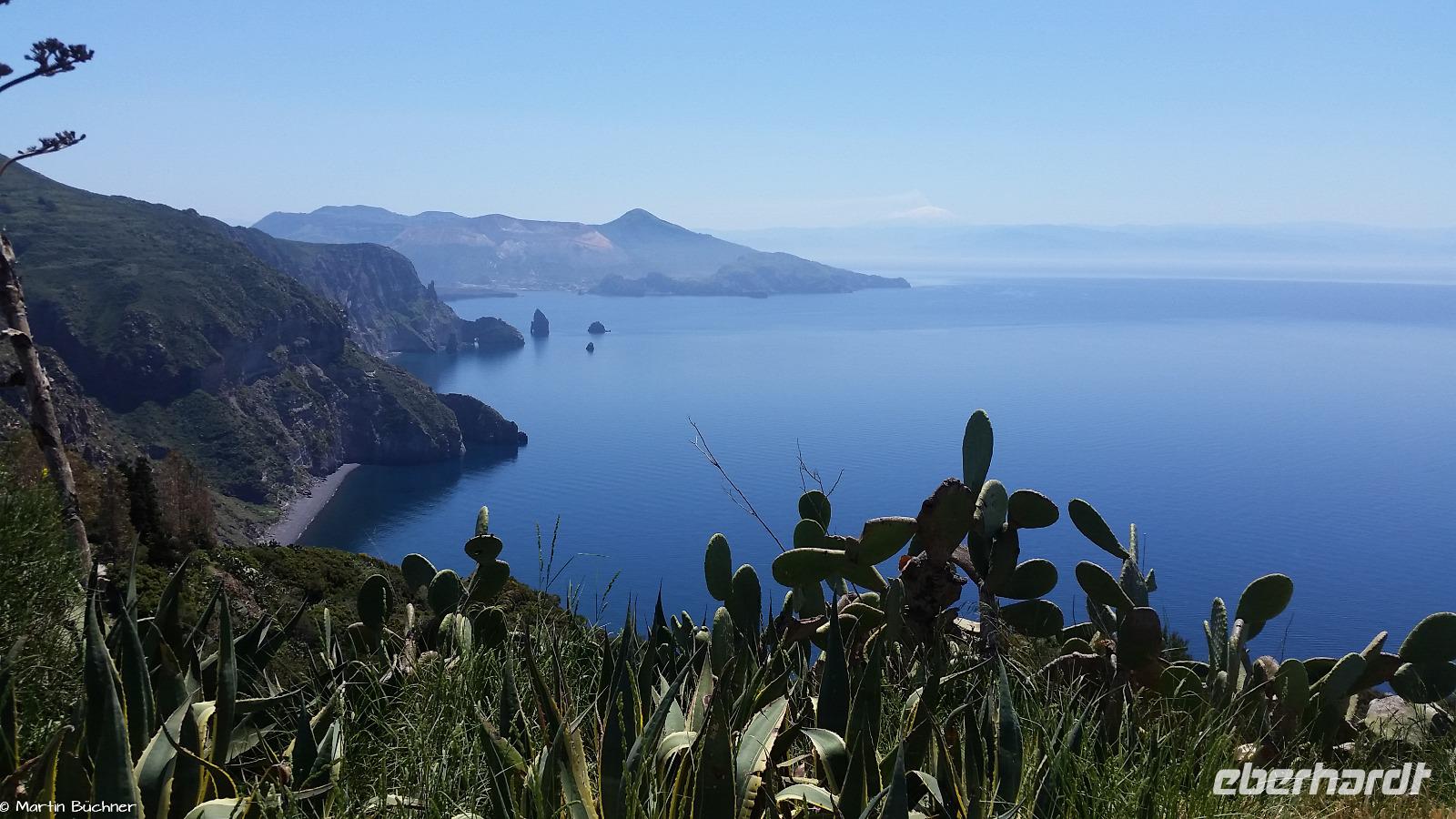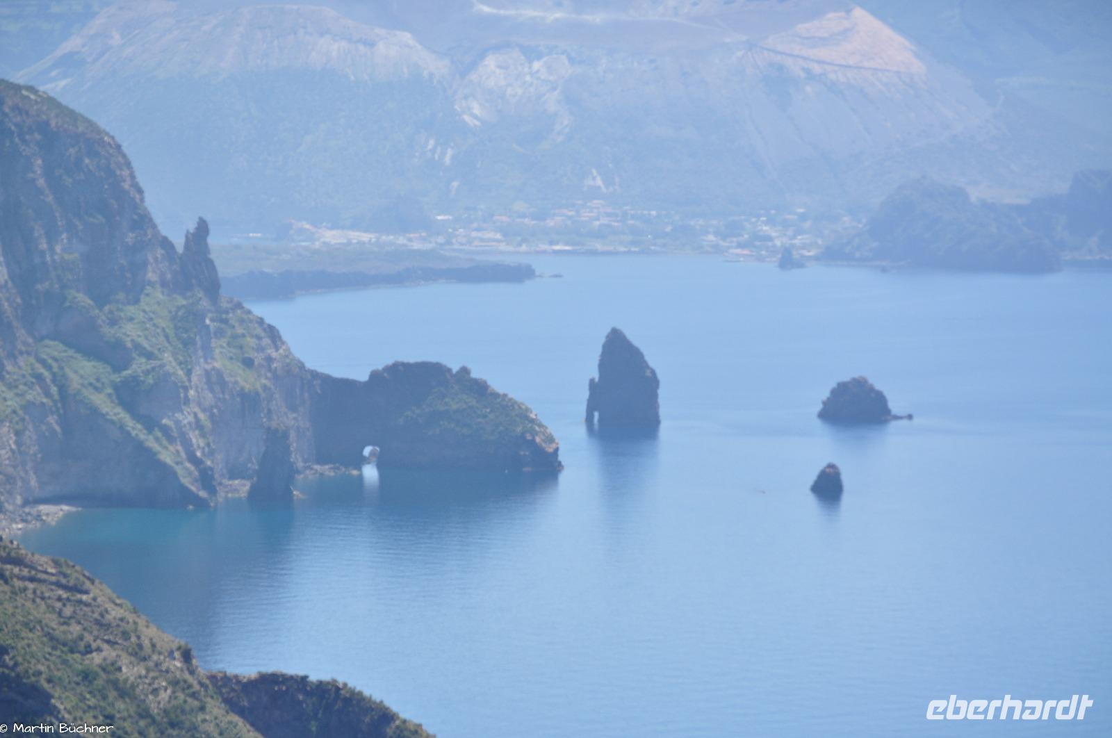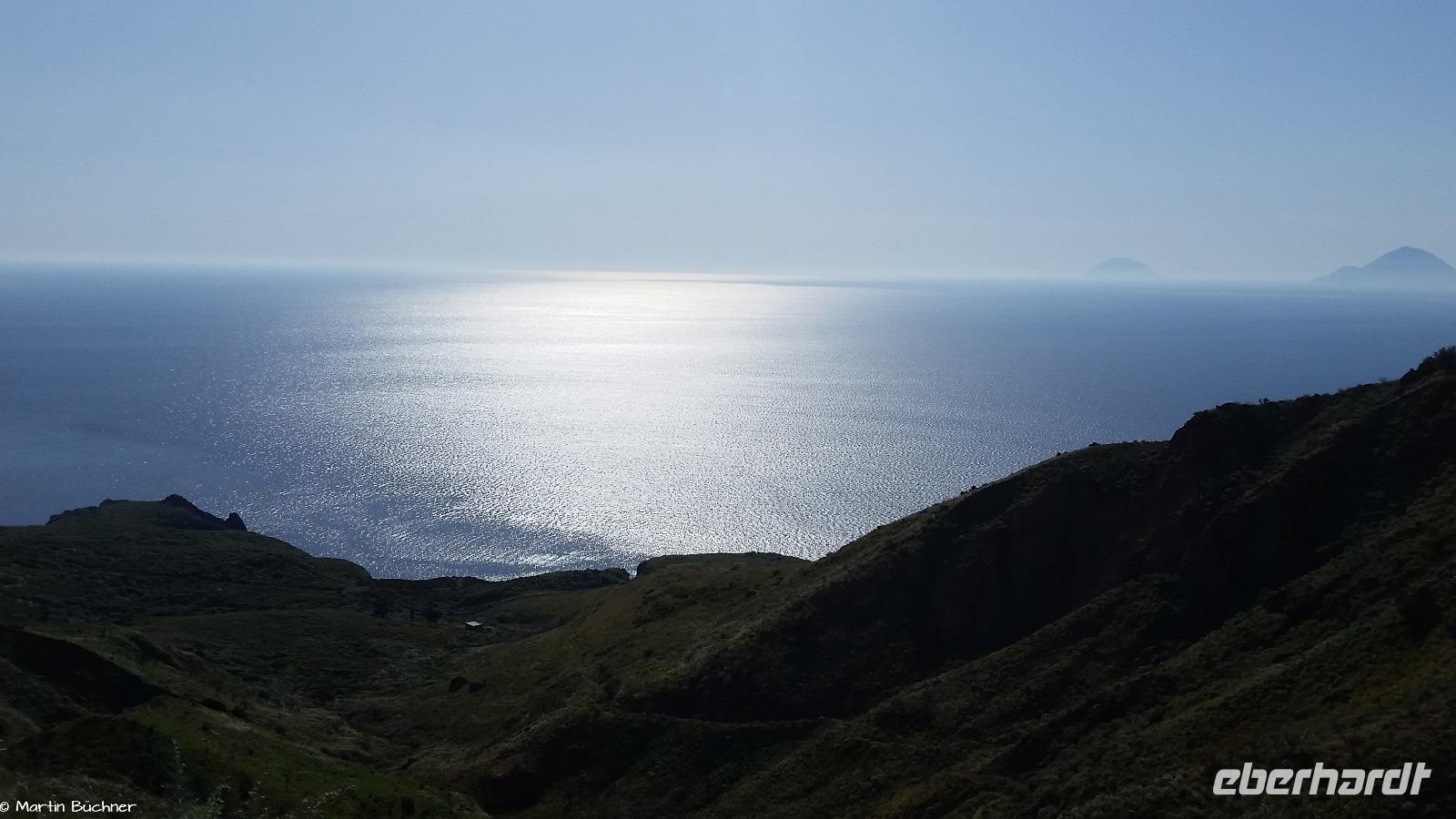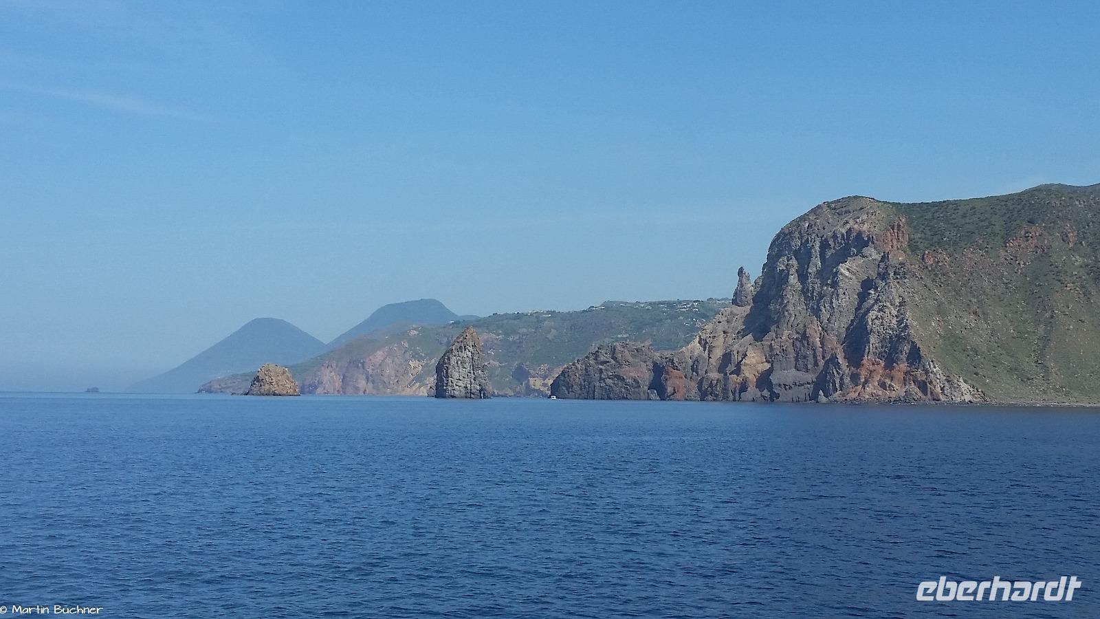 Fantastische Sicht, sogar der Ätna in ca. 100 km Entfernung ist zu sehen. Vor uns liegt die schroffe Steilküste und die Nachbarinsel Vulcano, die uns morgen erwartet. Weiter am Horizont liegen Alicudi und Filicudi, später dann auch die Insel Salina.