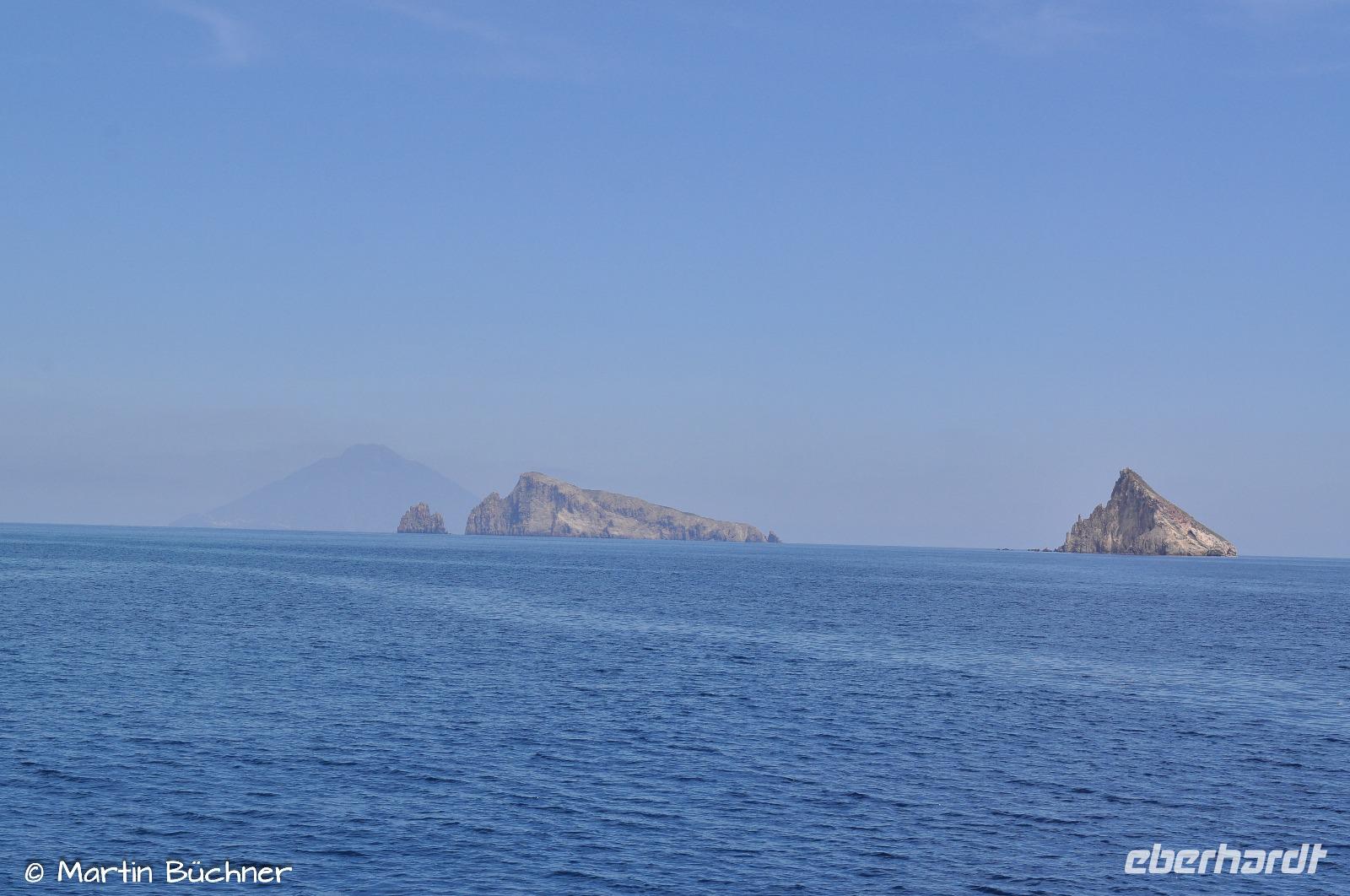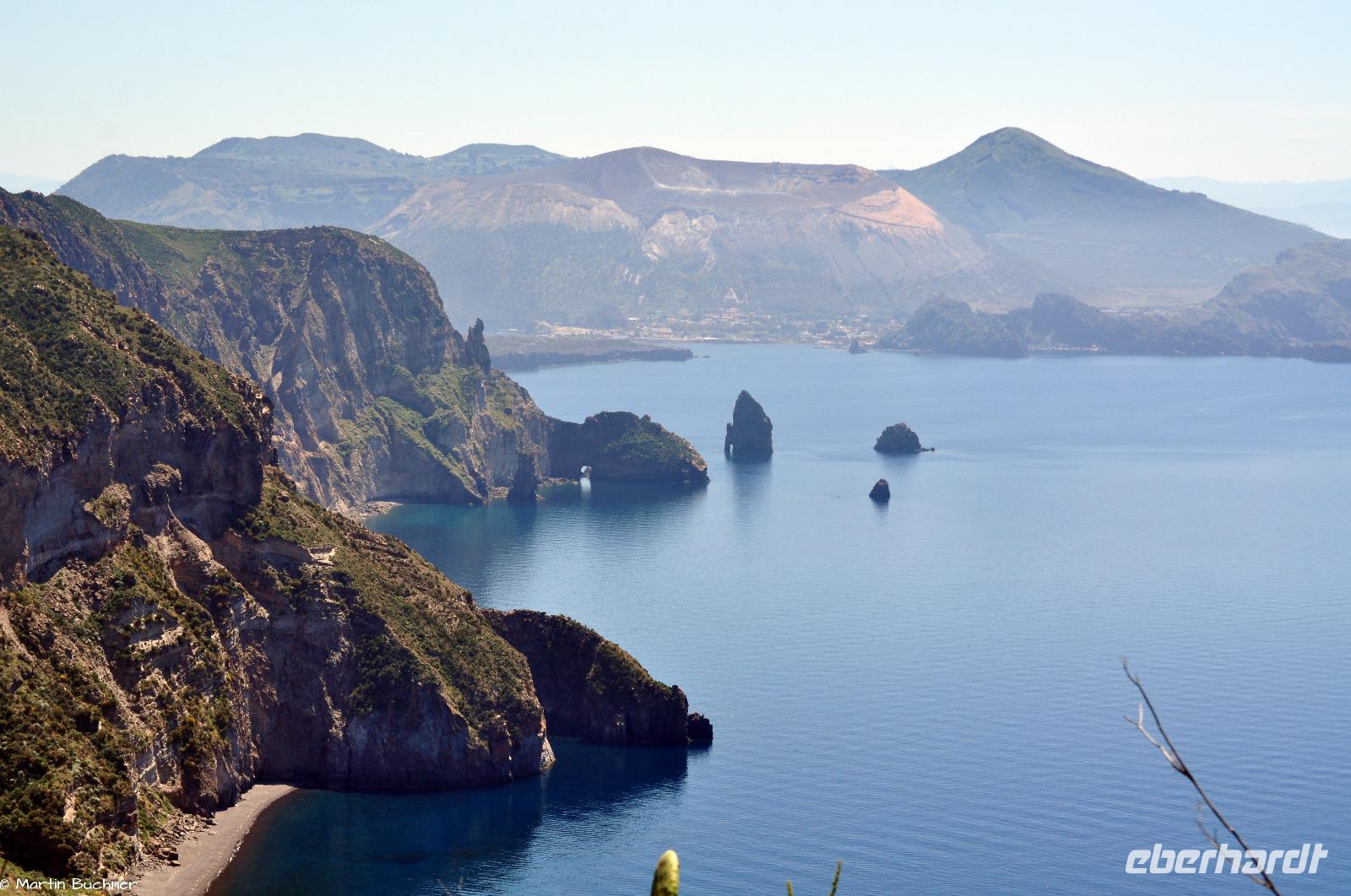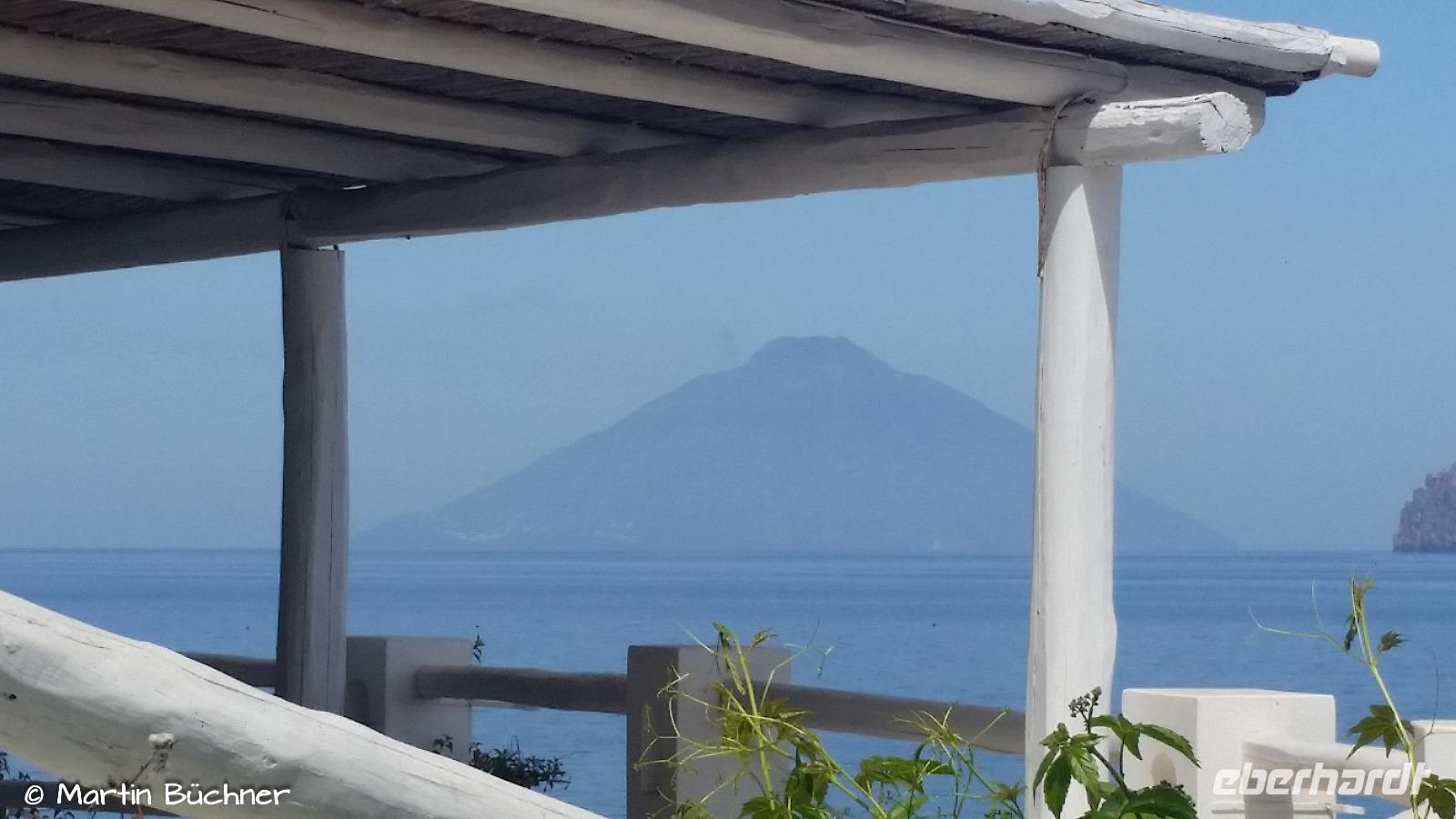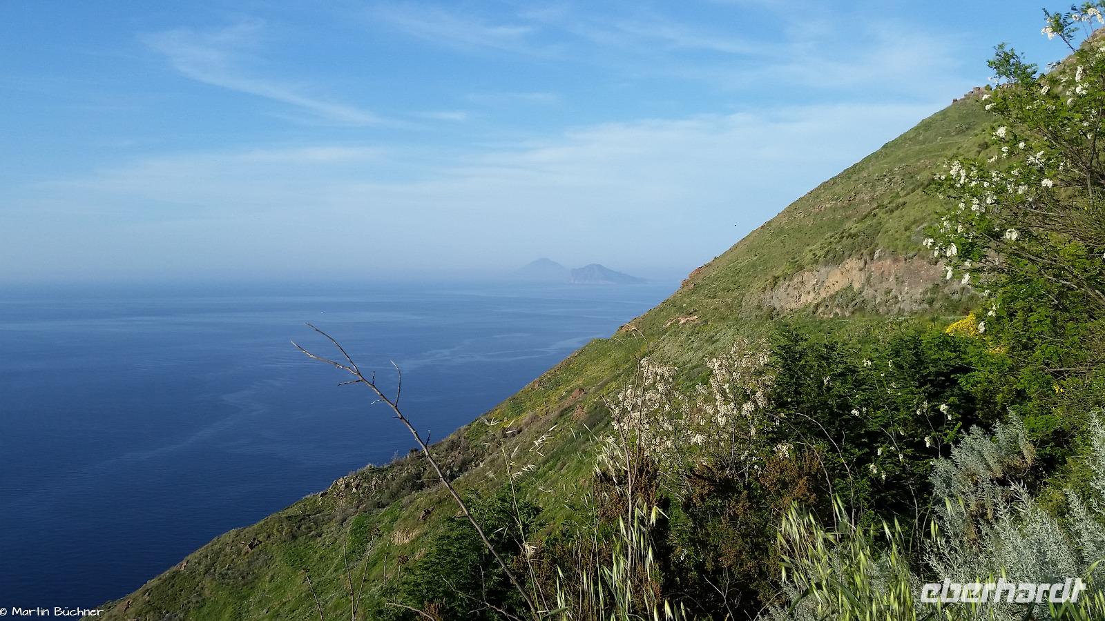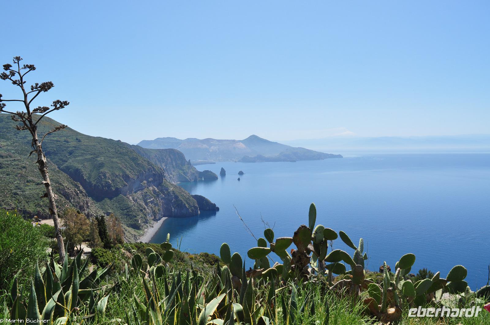 Fantastische Sicht, sogar der Ätna in ca. 100 km Entfernung ist zu sehen. Vor uns liegt die schroffe Steilküste und die Nachbarinsel Vulcano, die uns morgen erwartet. Weiter am Horizont liegen Alicudi und Filicudi, später dann auch die Insel Salina.