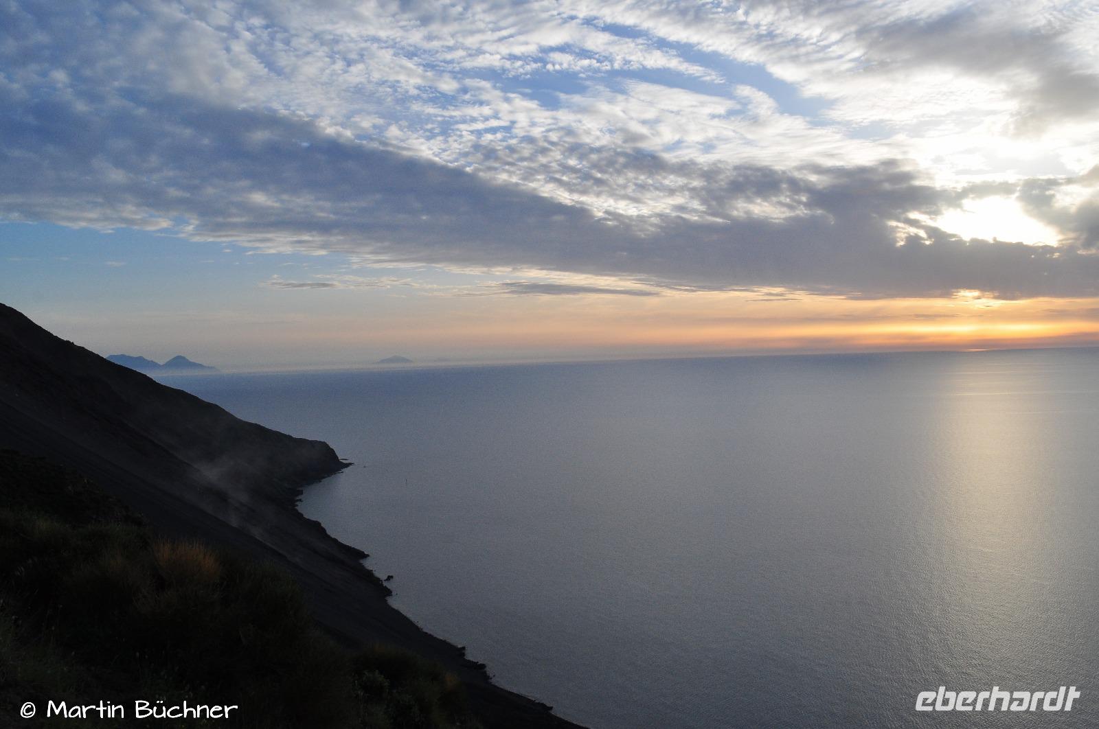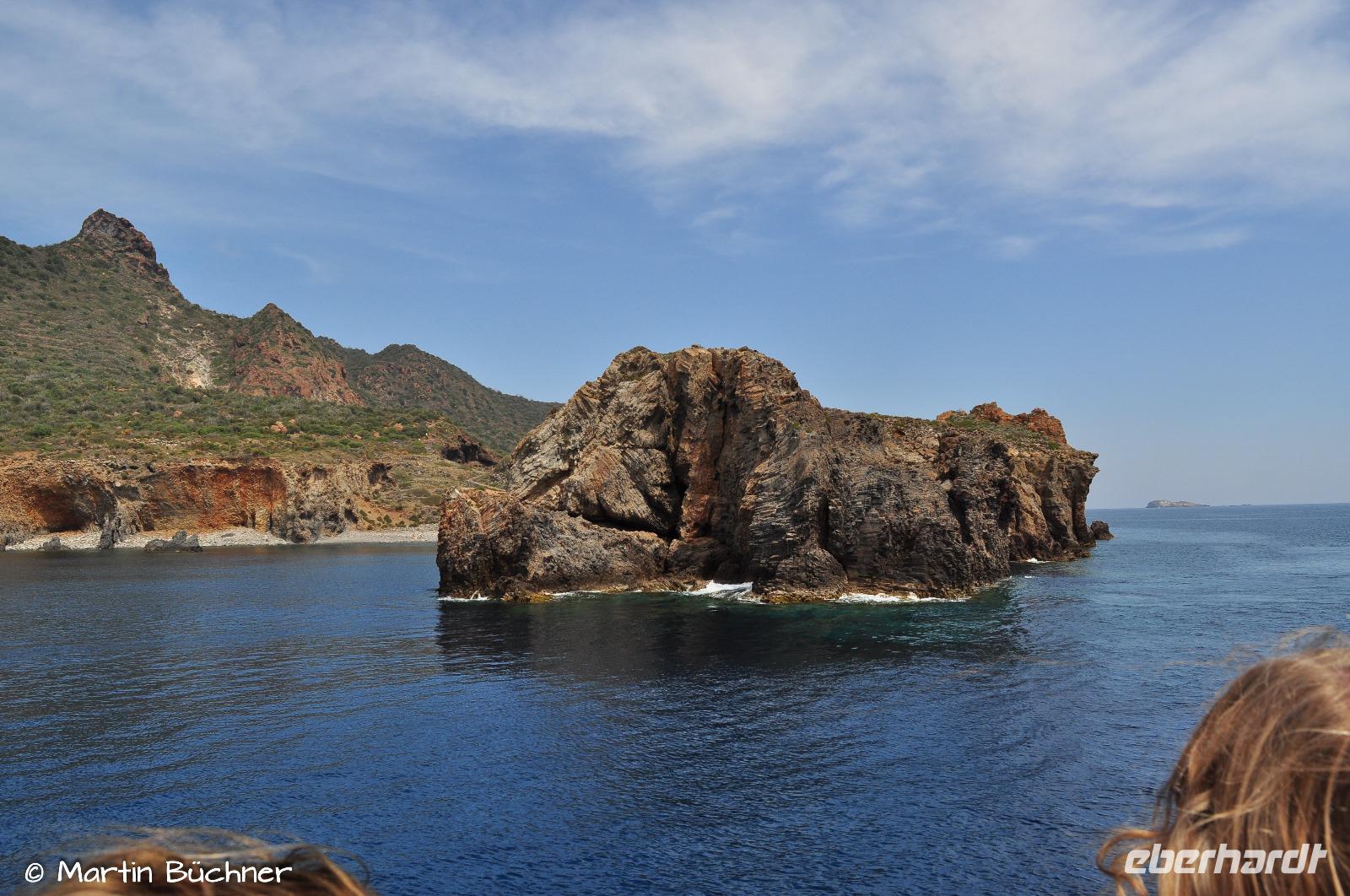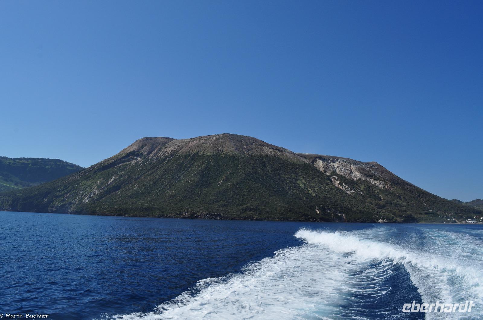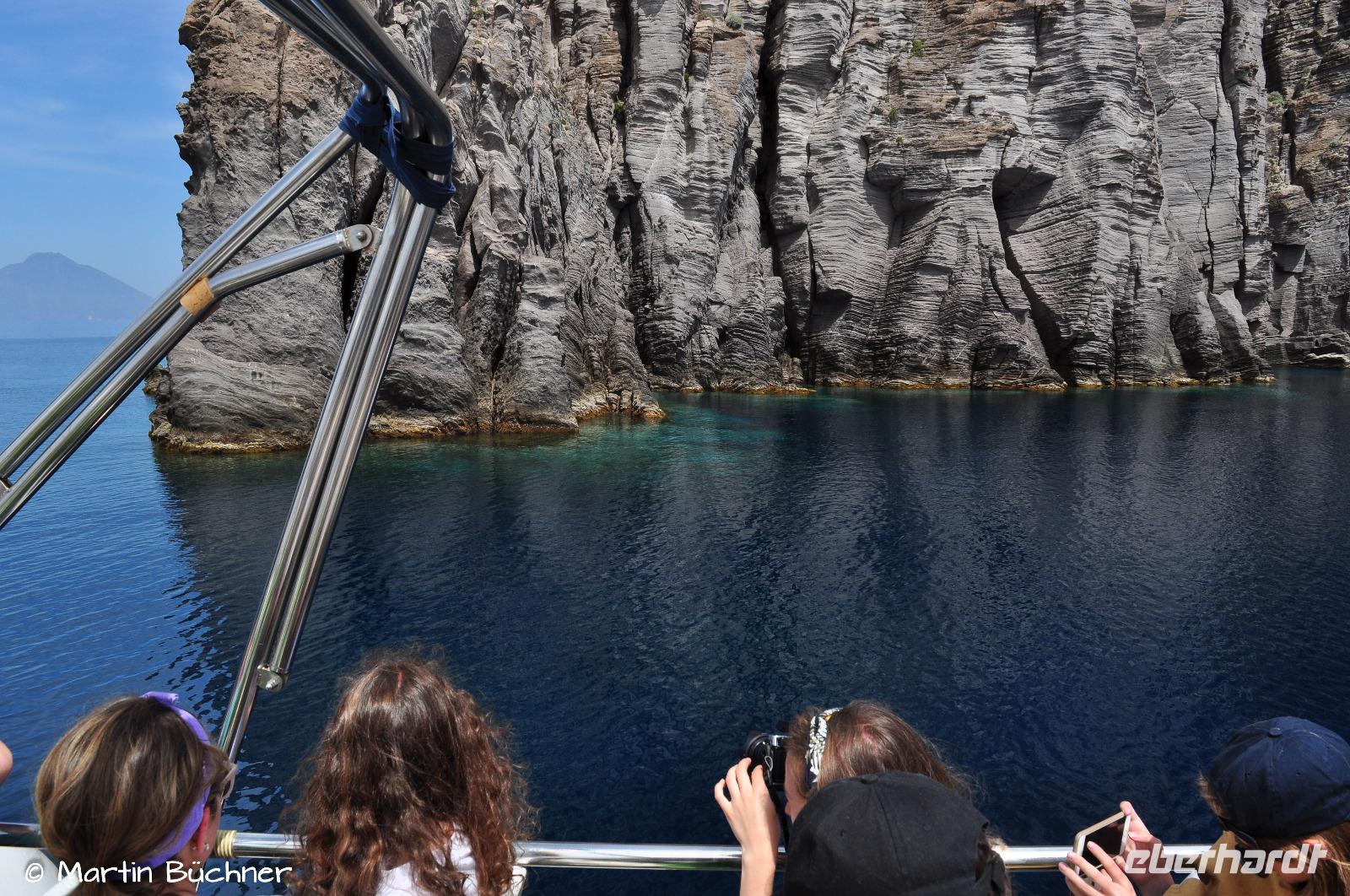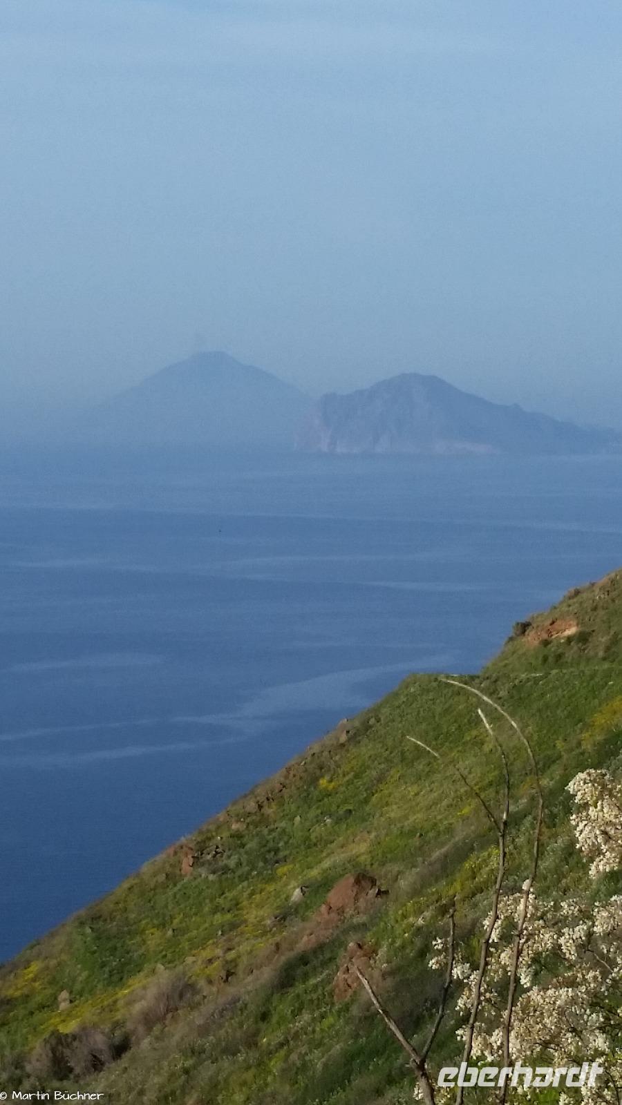 Fantastische Sicht, sogar der Ätna in ca. 100 km Entfernung ist zu sehen. Vor uns liegt die schroffe Steilküste und die Nachbarinsel Vulcano, die uns morgen erwartet. Weiter am Horizont liegen Alicudi und Filicudi, später dann auch die Insel Salina.