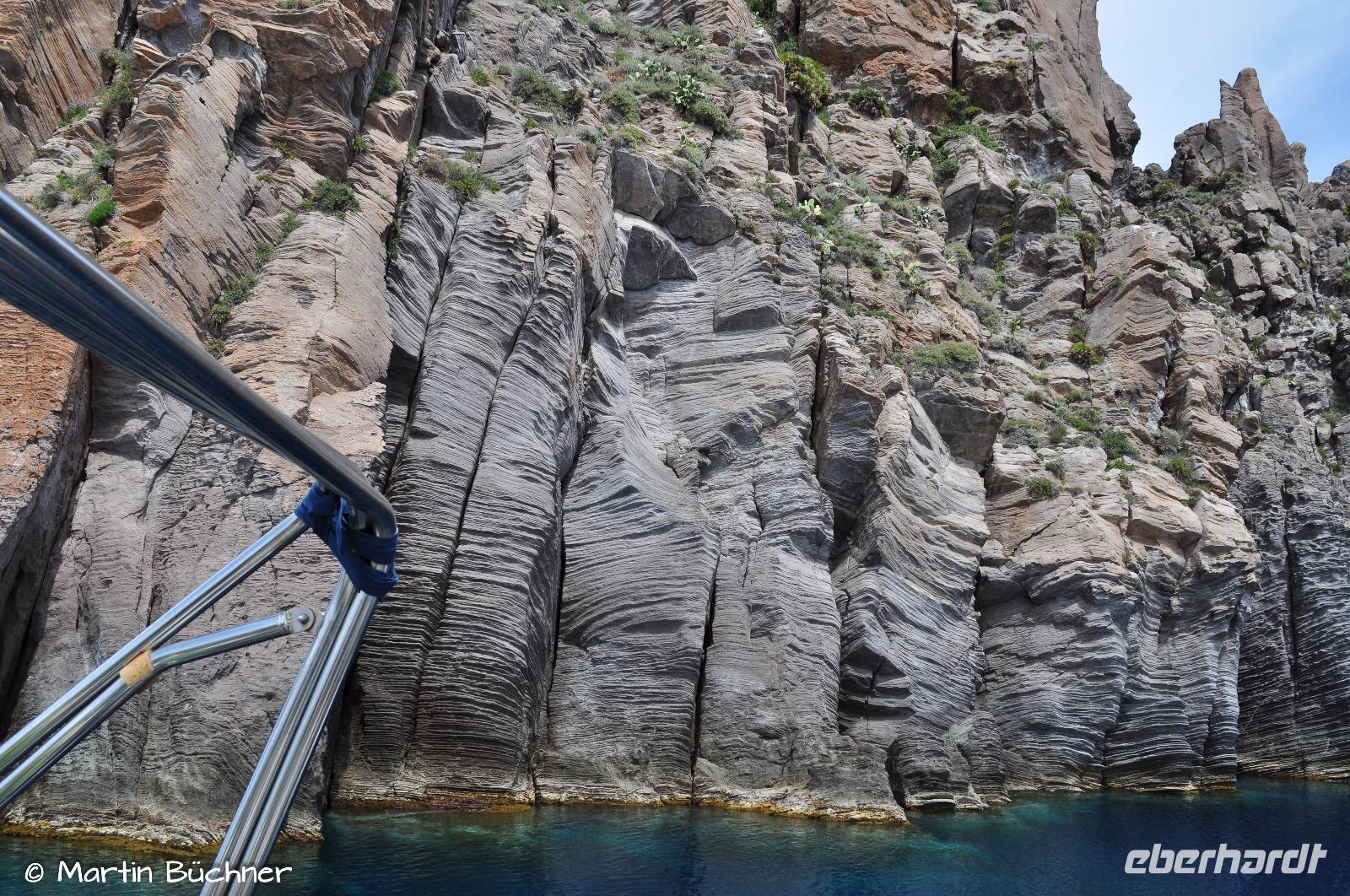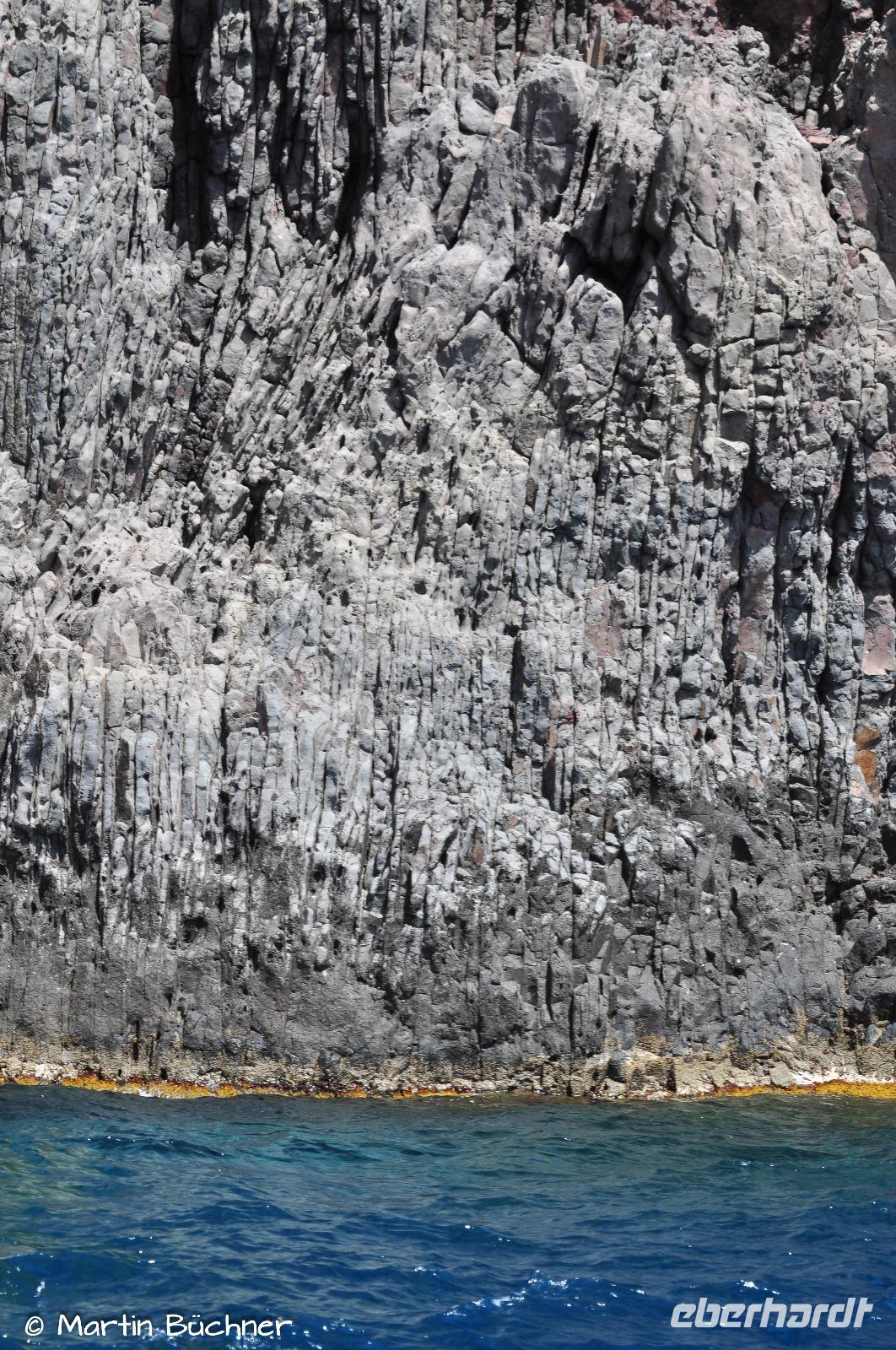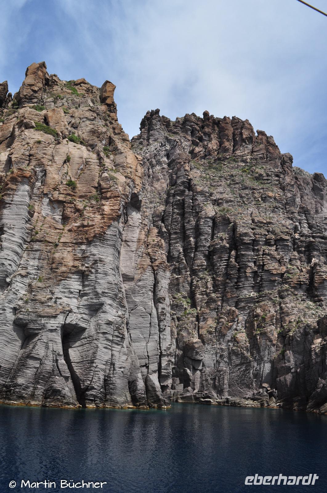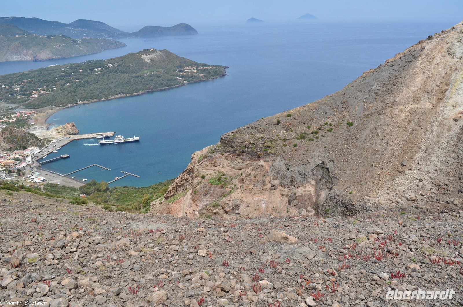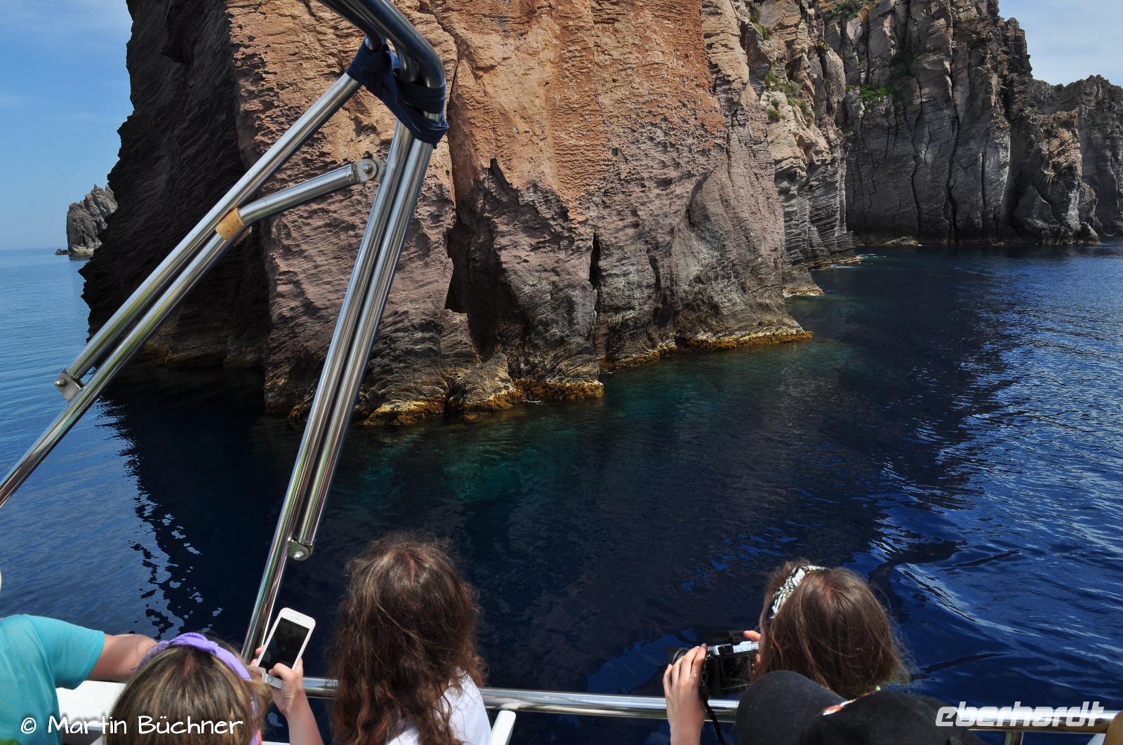 Fantastische Sicht, sogar der Ätna in ca. 100 km Entfernung ist zu sehen. Vor uns liegt die schroffe Steilküste und die Nachbarinsel Vulcano, die uns morgen erwartet. Weiter am Horizont liegen Alicudi und Filicudi, später dann auch die Insel Salina.
