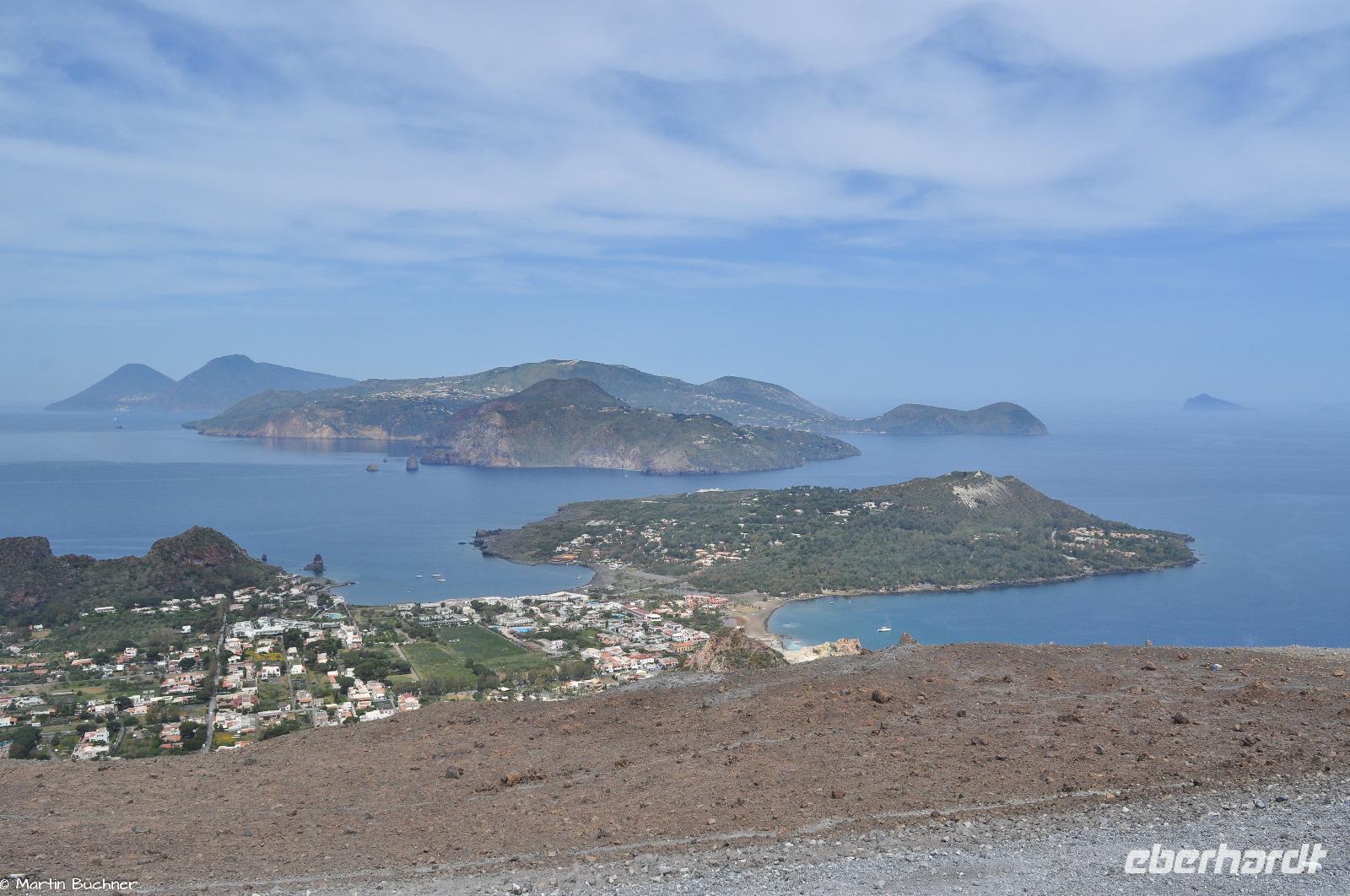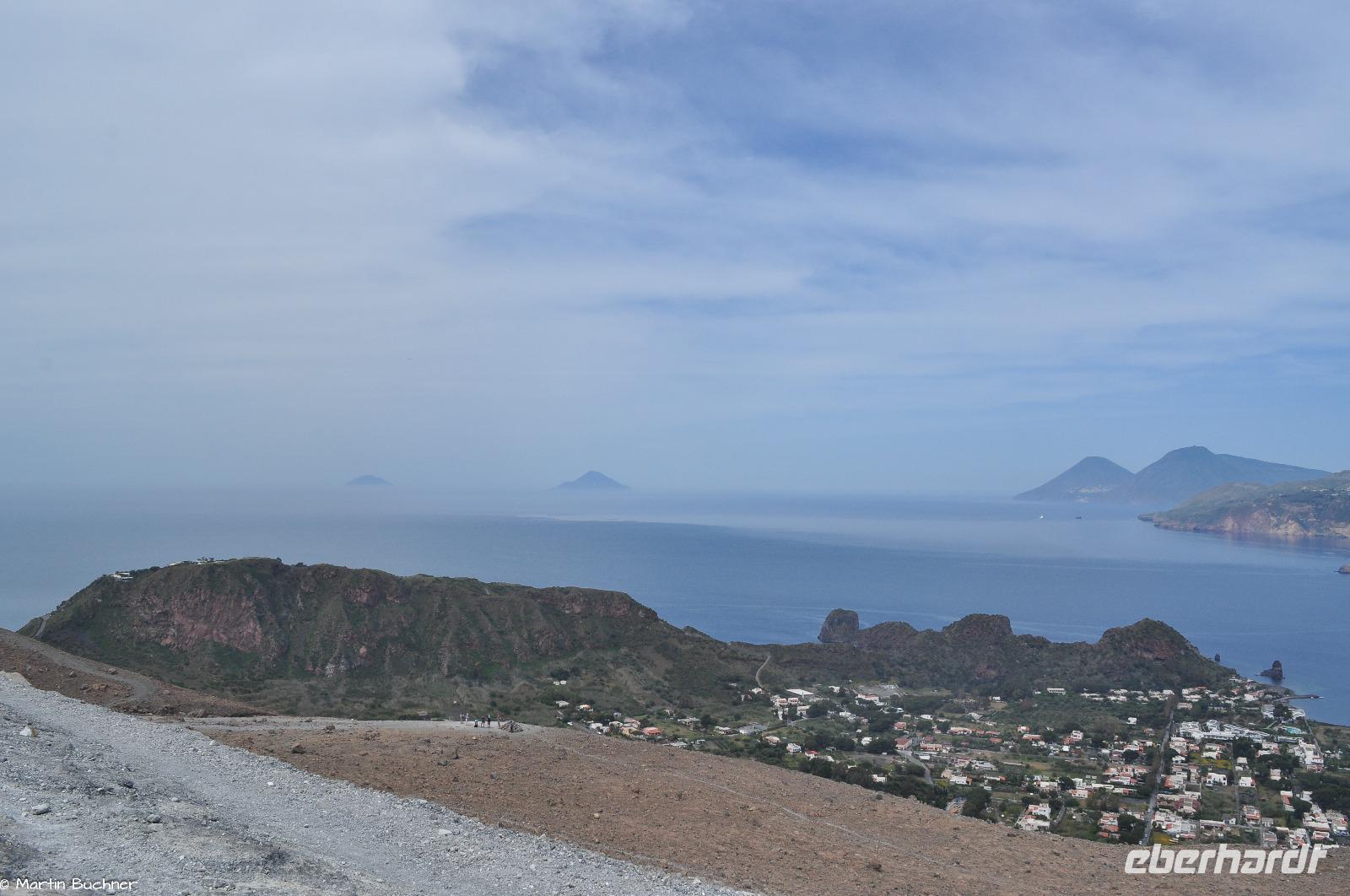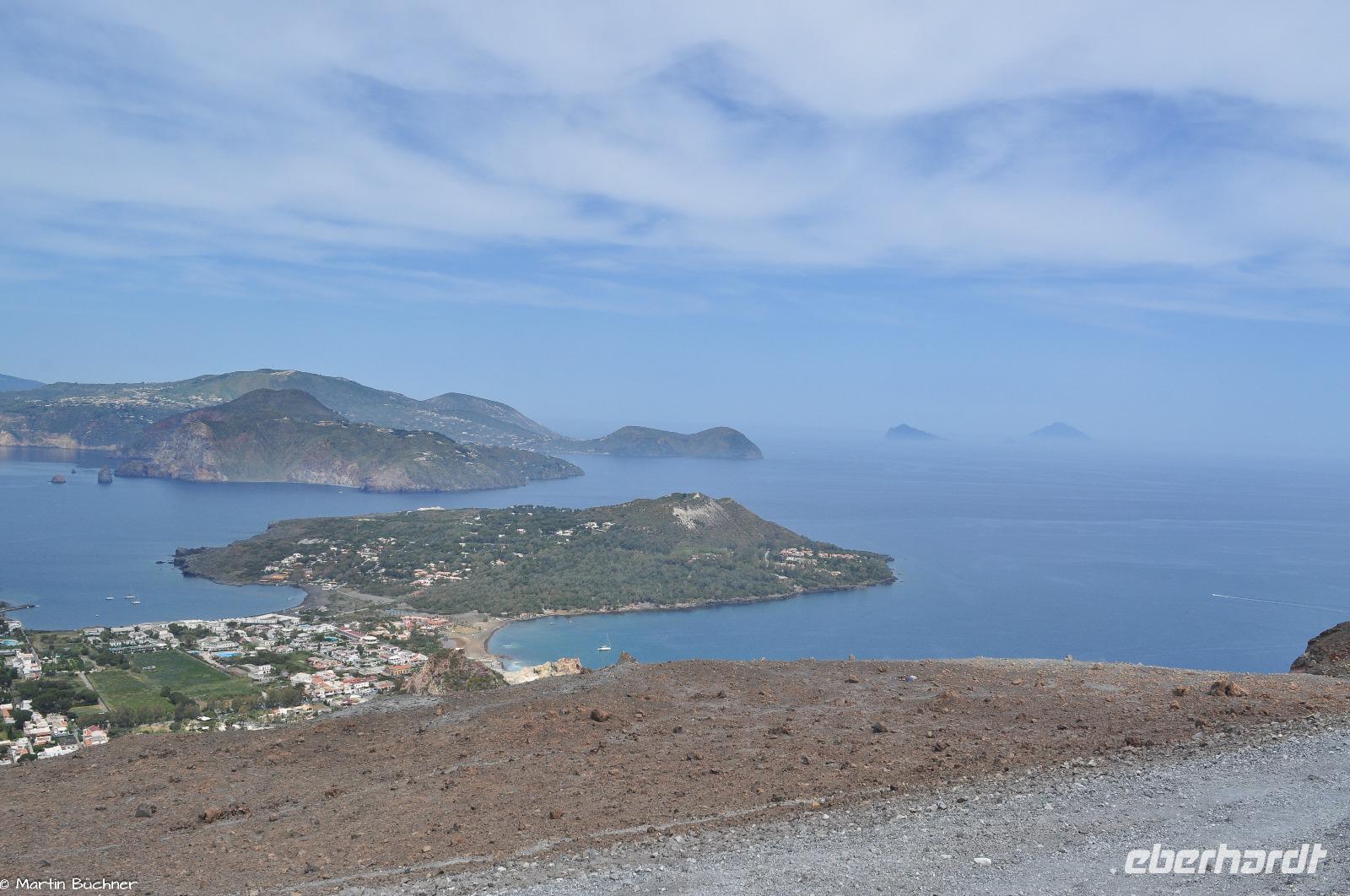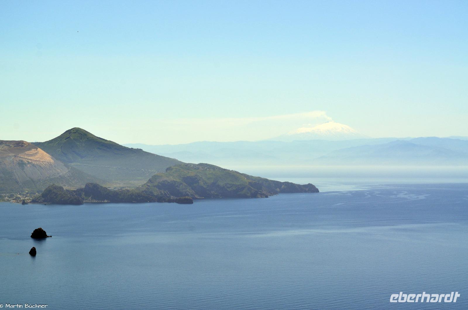 Auch heute haben wir wieder eine fantastische Sicht. Alle Äolischen Inseln sind zu sehen: Alicudi, Filicudi, Salina, Lipari, Panarea, Stromboli und natürlich Vulcano. Nach Süden hin ist auch Sizilien zu sehen und ja sogar der Ätna.