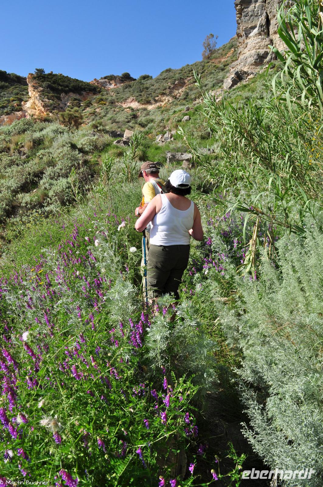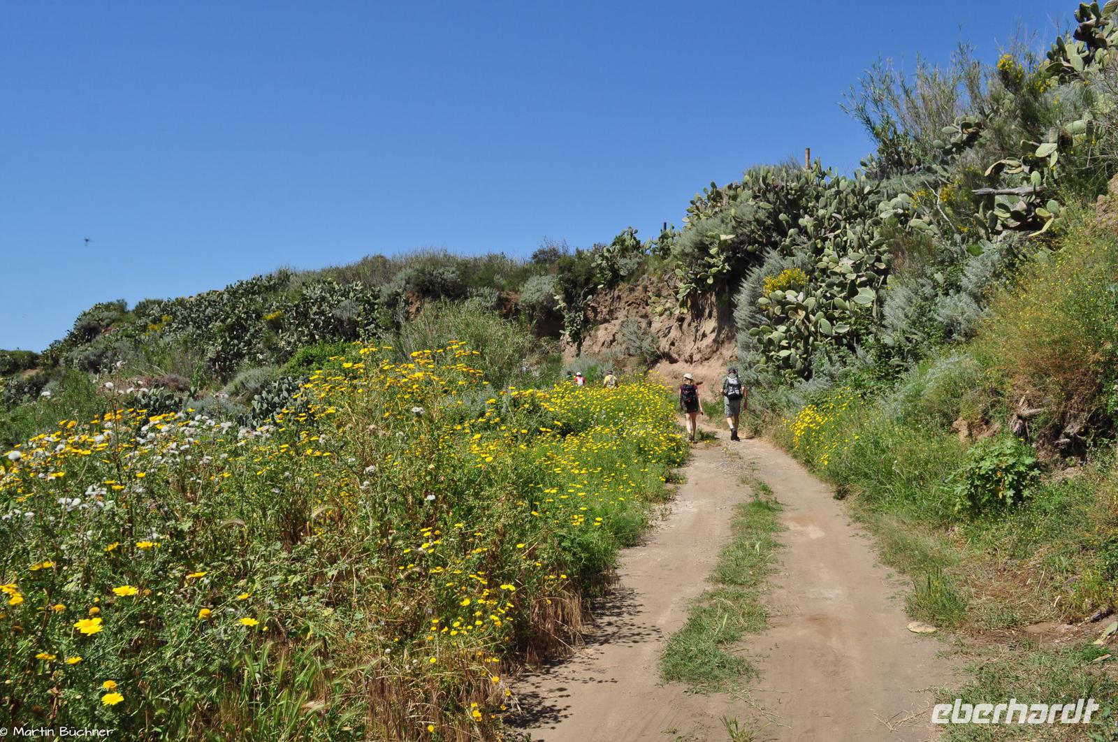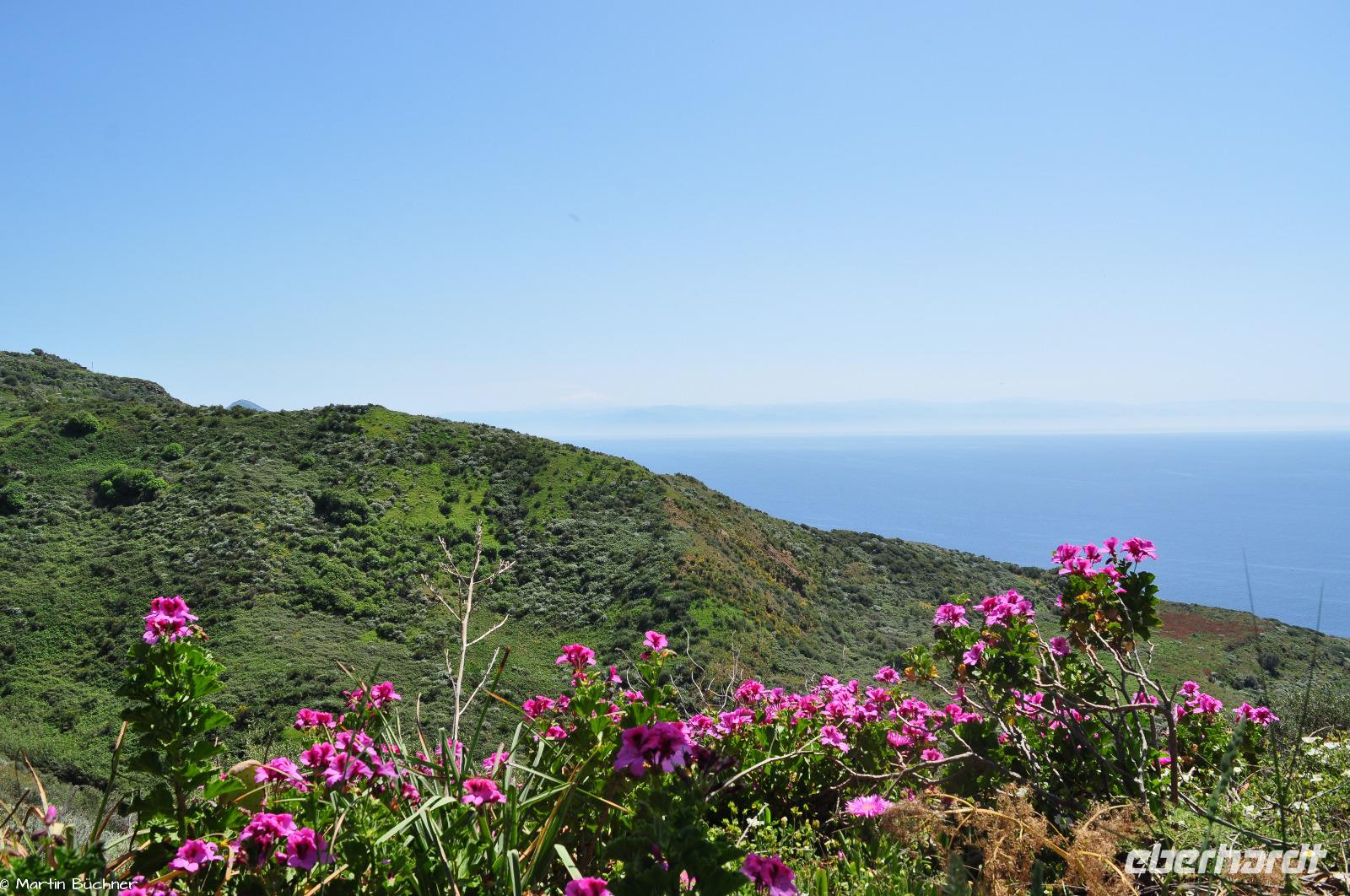 Unsere Wanderung verläuft durch ein UNESCO Weltnaturerbe. In dieser Jahreszeit blühen tausende Blumen. Unser Weg verläuft immer oberhalb der rauen Steilküste auf der Westseite Liparis.