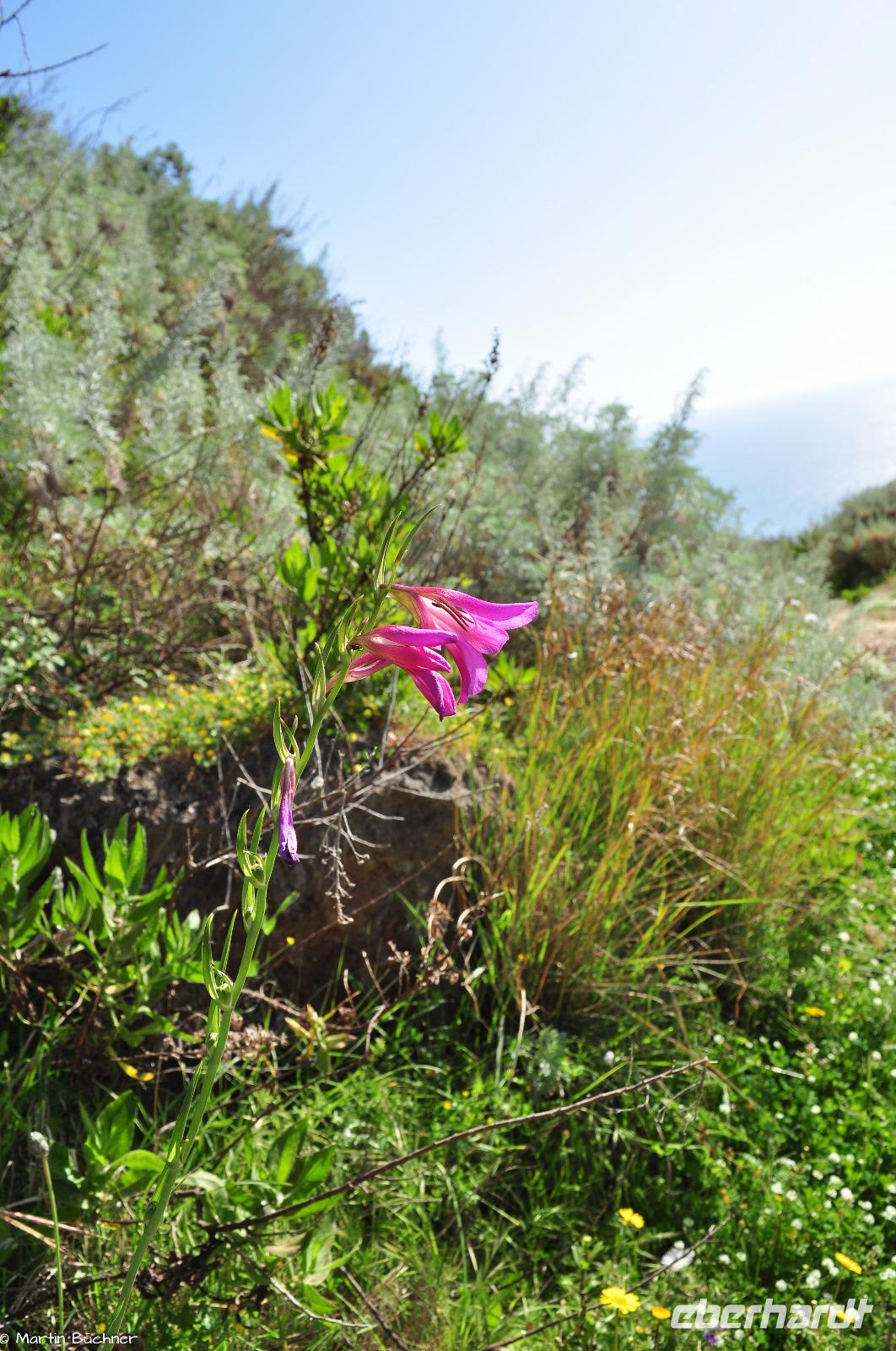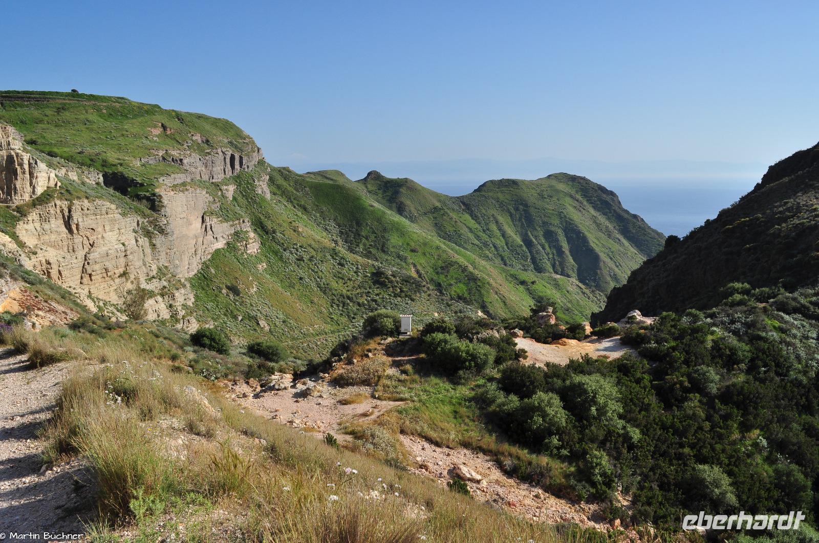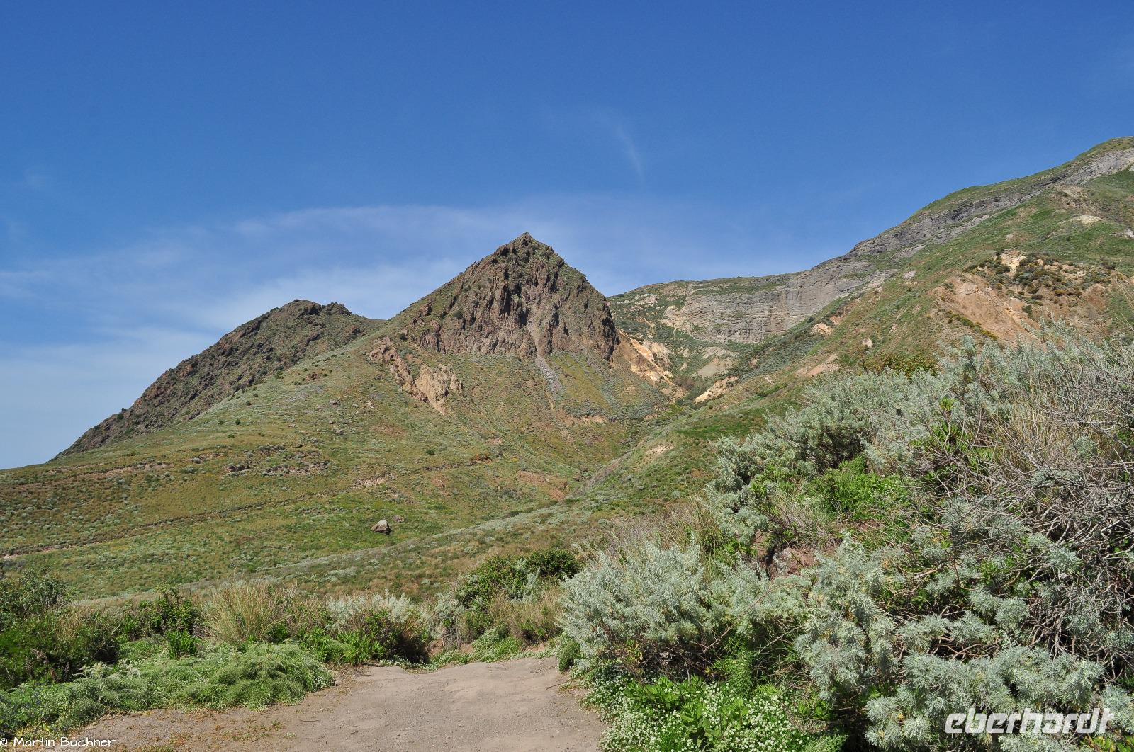 Unsere Wanderung verläuft durch ein UNESCO Weltnaturerbe. In dieser Jahreszeit blühen tausende Blumen. Unser Weg verläuft immer oberhalb der rauen Steilküste auf der Westseite Liparis.