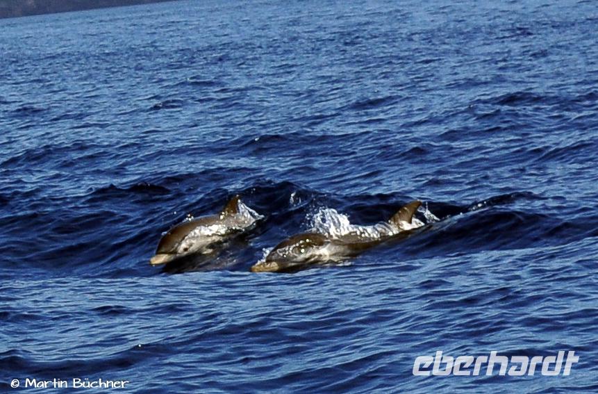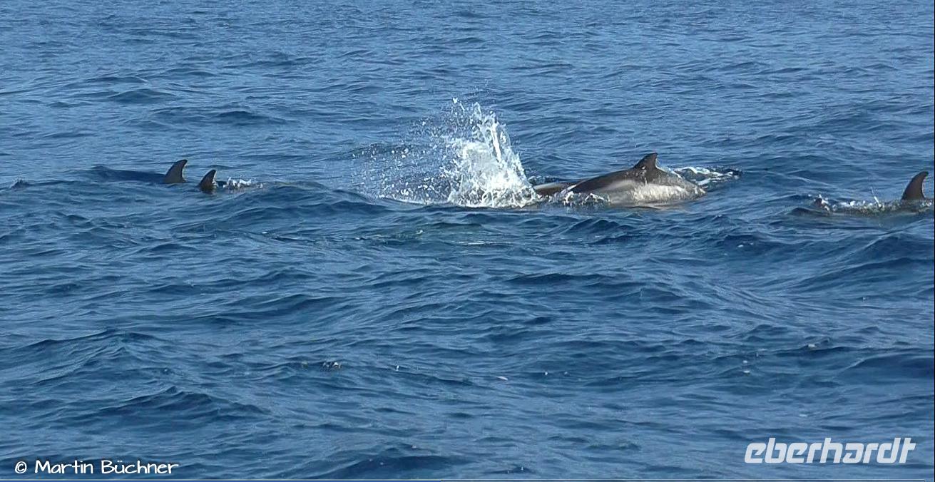 Unser Gemüt hellt sich deutlich auf, als in der Hotelbucht eine Gruppe Delfine auftaucht und mit wilden Sprüngen auf sich aufmerksam macht.