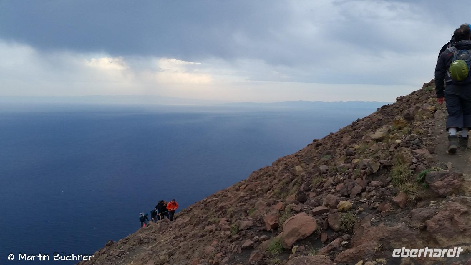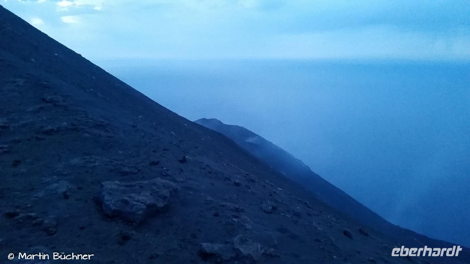 Am Abend brechen wir auf für den Gipfelgrat des Strombolis. Das Wetter verschlechtert sich bereits am Nachmittag, sogar einige Tropfen fallen. Keiner rechnet mit dem, was dort heute noch kommen sollte.