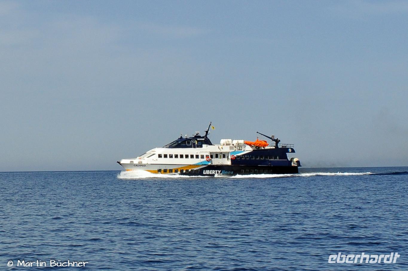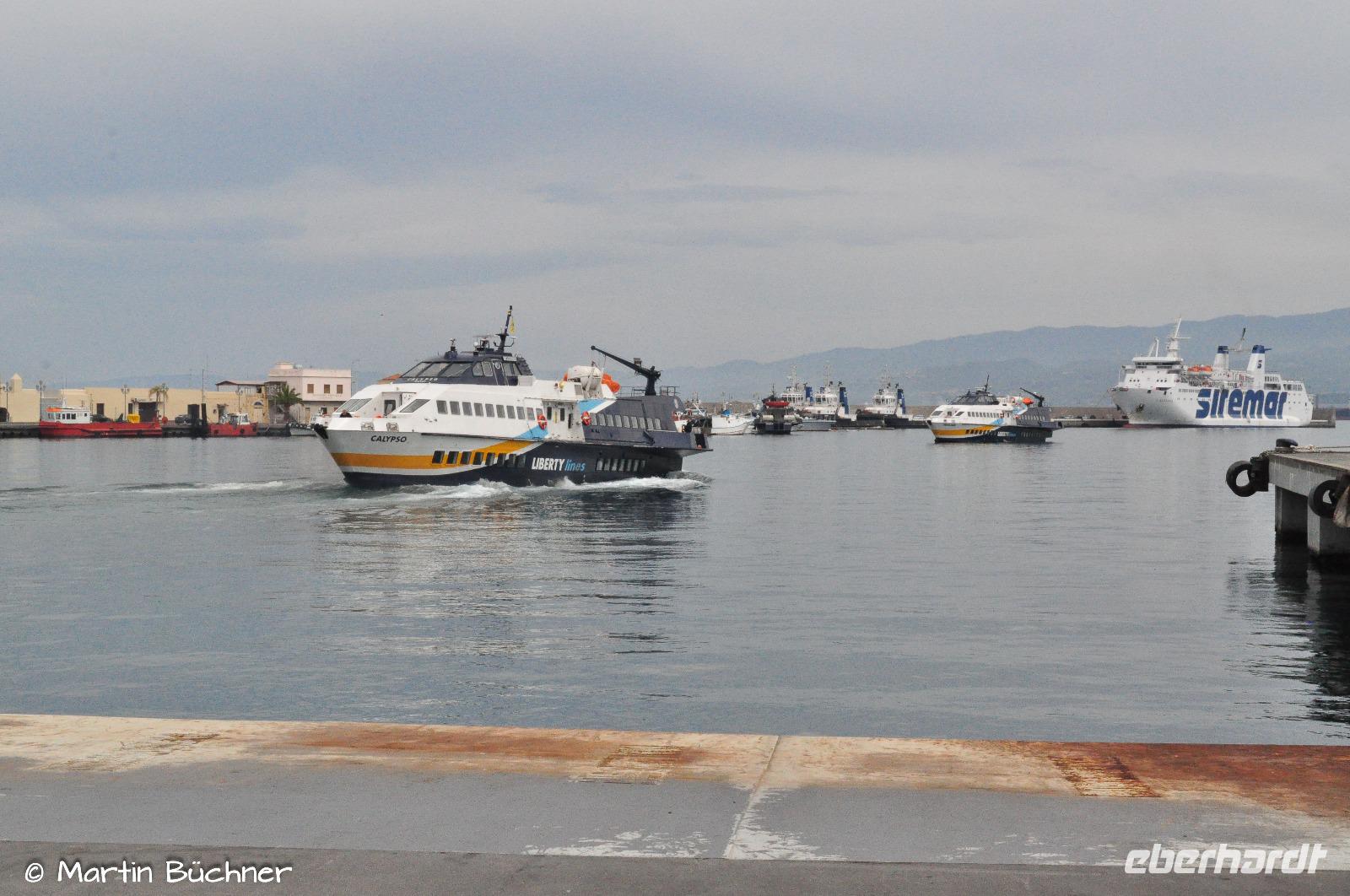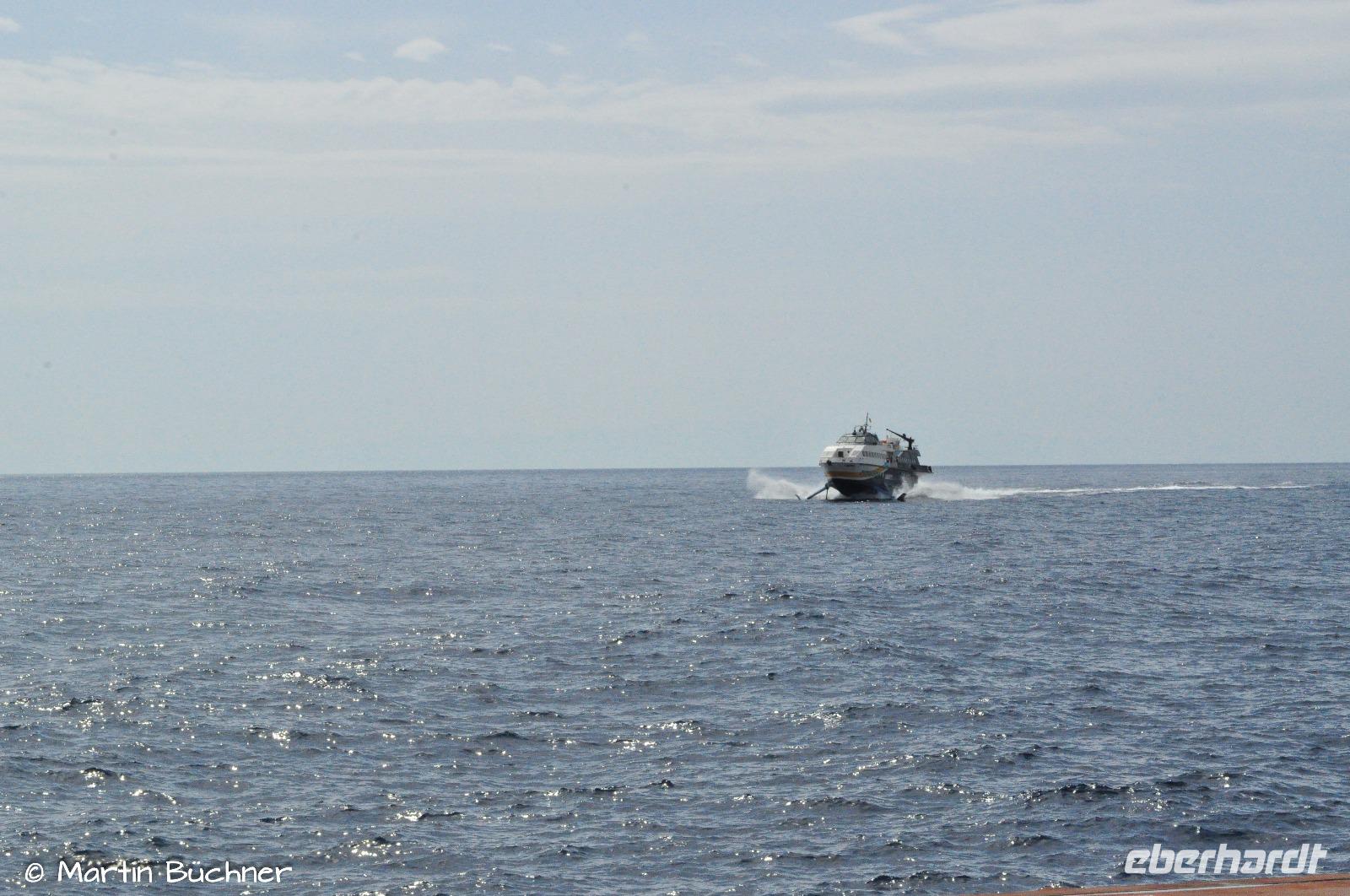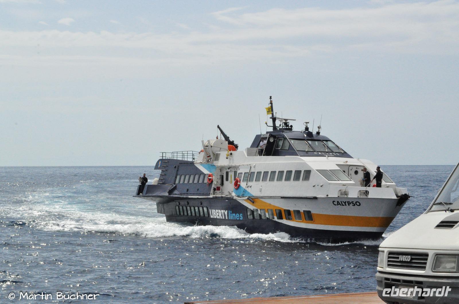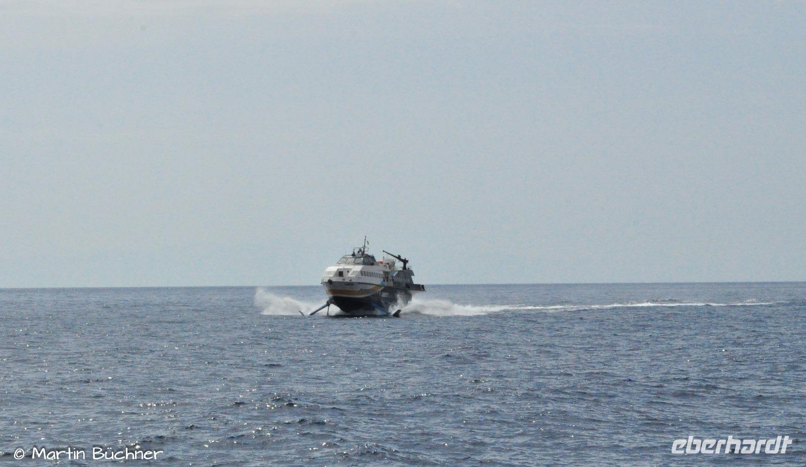 Mit dem Tragflächenboot, auch Tragflügelboot genannt der Liberty Lines geht es in hohem Tempo über Panarea, Salina, Lipari und Vulcano zurück nach Milazzo auf Sizilien.
