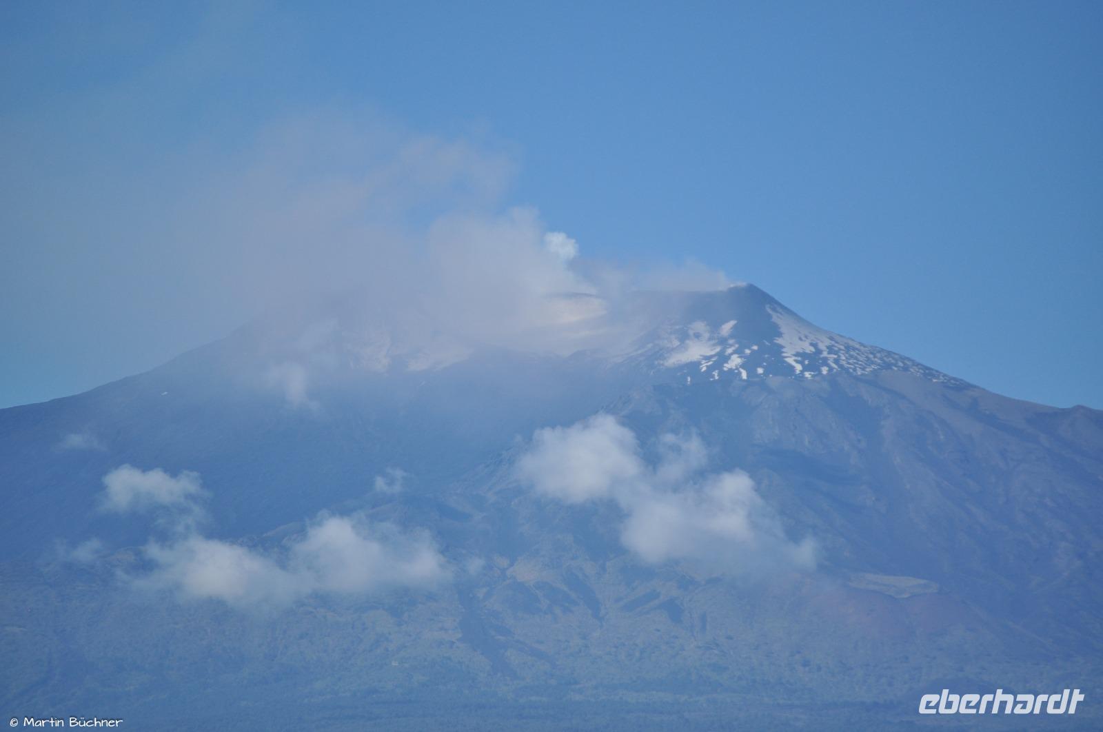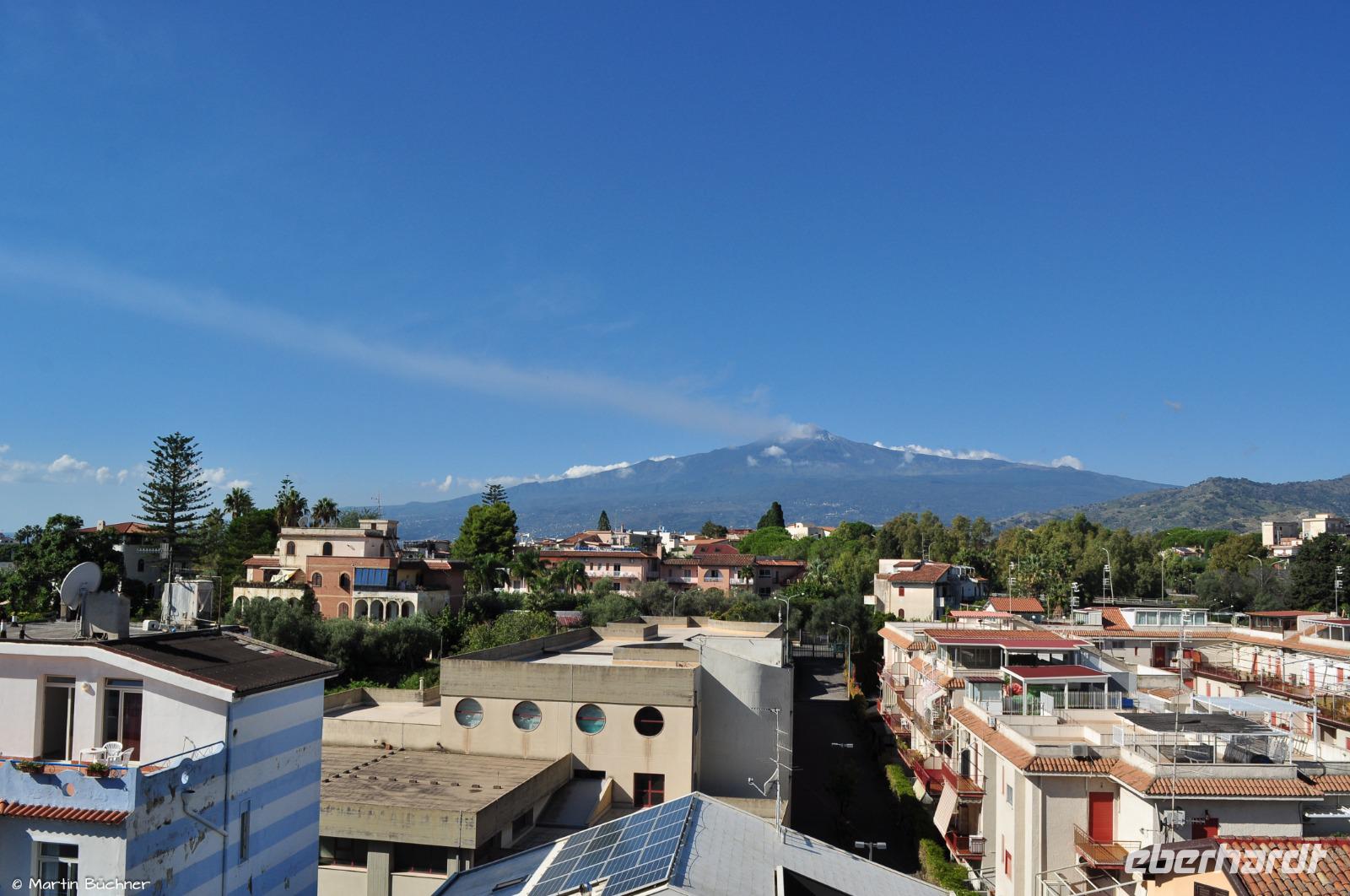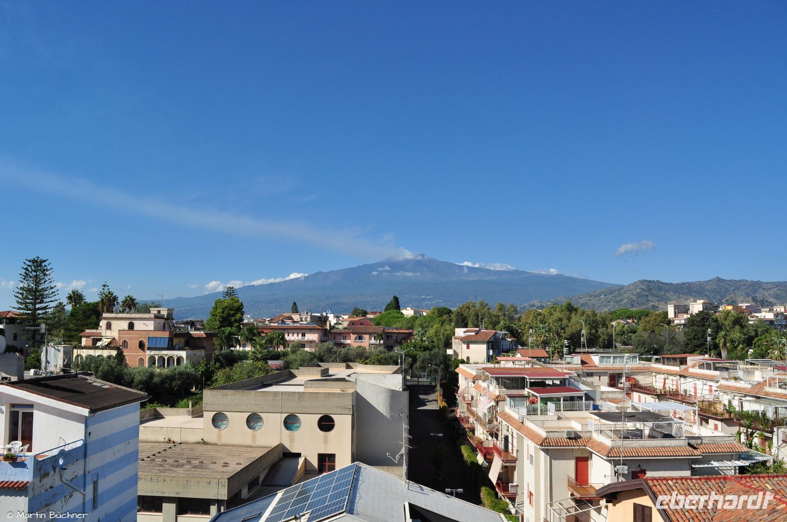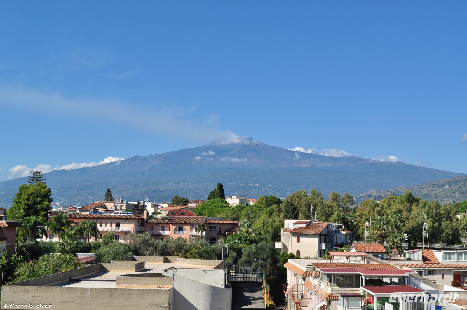 Am Morgen richten sich die ersten Blicke zum Ätna. Das Wetter ist gut, die Hauptkrater sind zu sehen. Der Ätna befindet sich gegenwertig in einer Phase erhöhter Aktivität, dass sich optisch an starkem Ausgasen mehrerer Hauptkrater zeigt und messtechnisch an deutlicher seismischer Aktivität (kleine Minibeben).