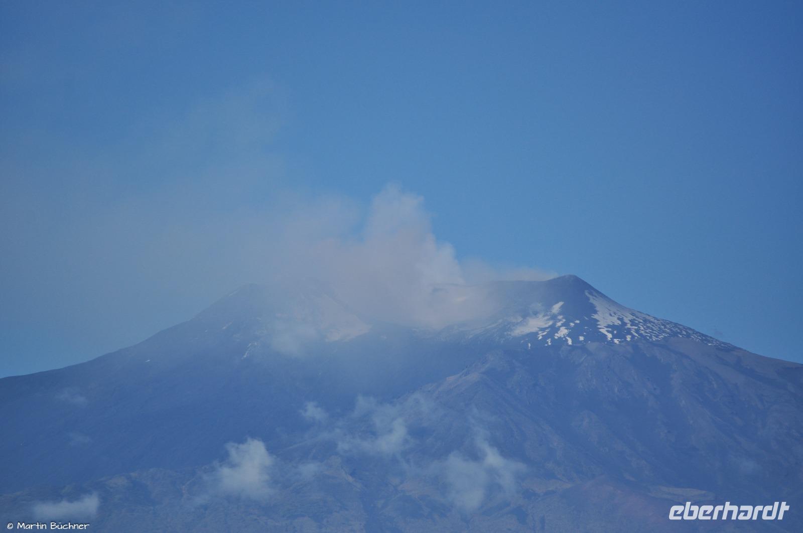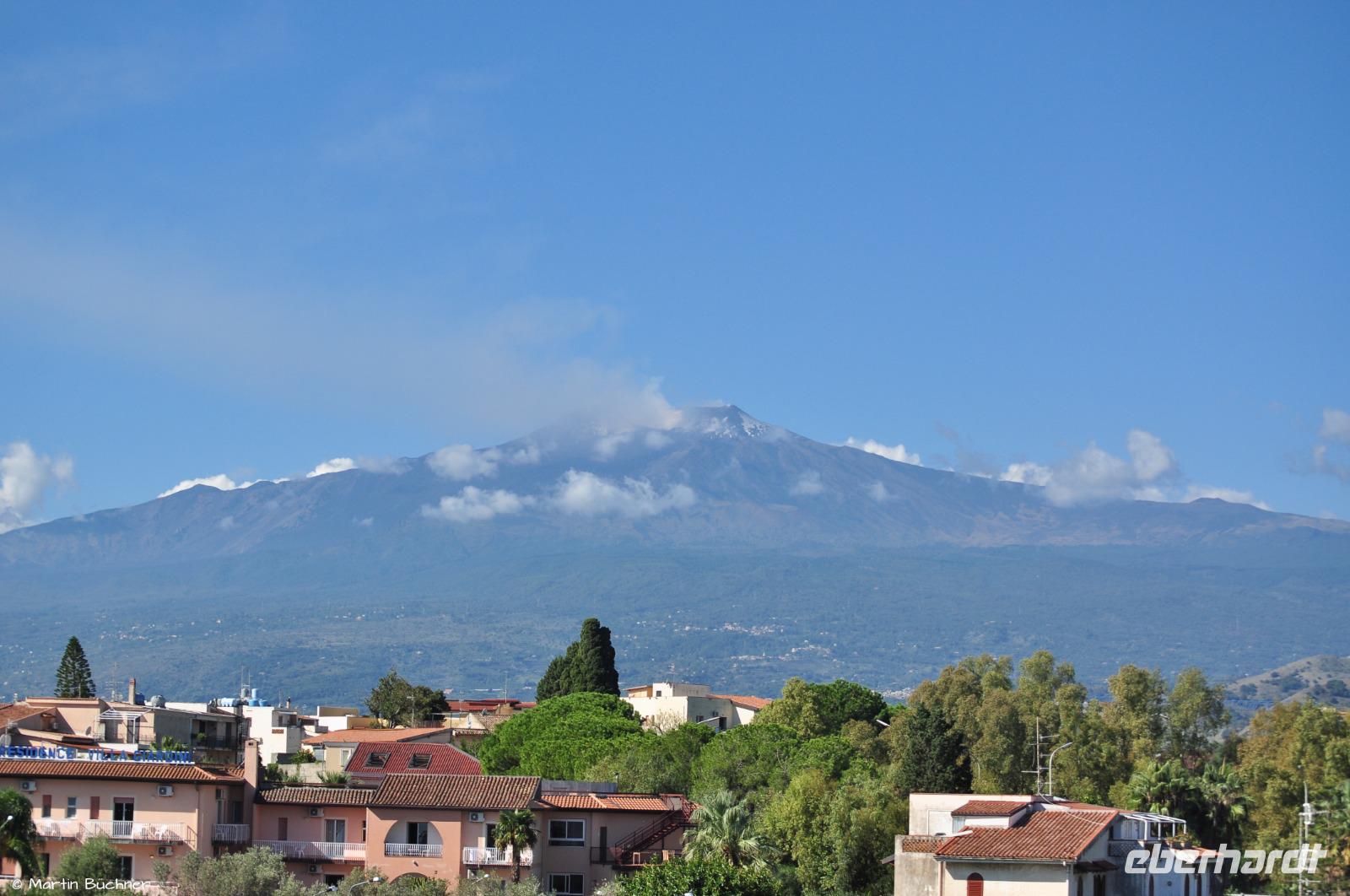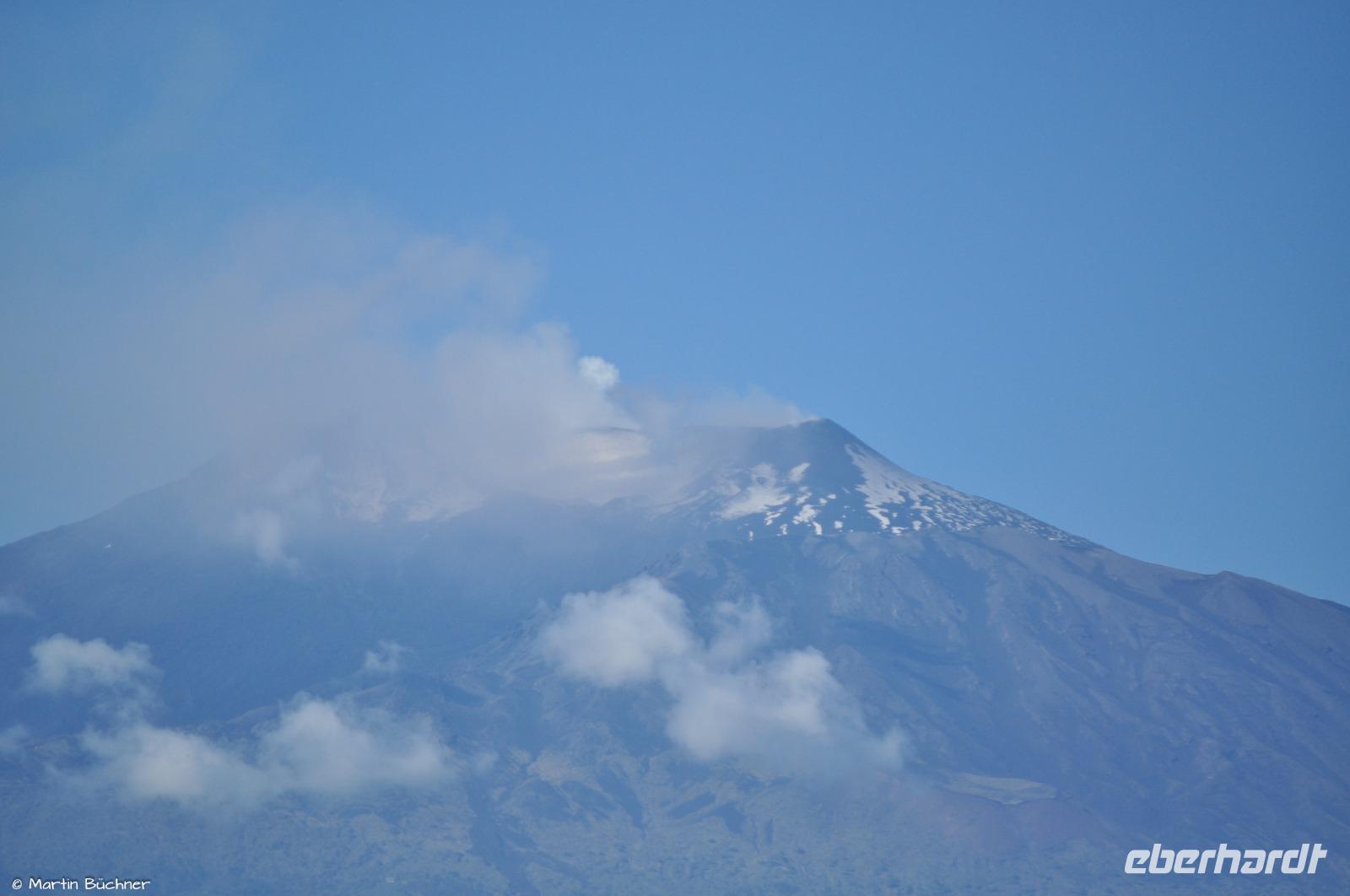 Am Morgen richten sich die ersten Blicke zum Ätna. Das Wetter ist gut, die Hauptkrater sind zu sehen. Der Ätna befindet sich gegenwertig in einer Phase erhöhter Aktivität, dass sich optisch an starkem Ausgasen mehrerer Hauptkrater zeigt und messtechnisch an deutlicher seismischer Aktivität (kleine Minibeben).