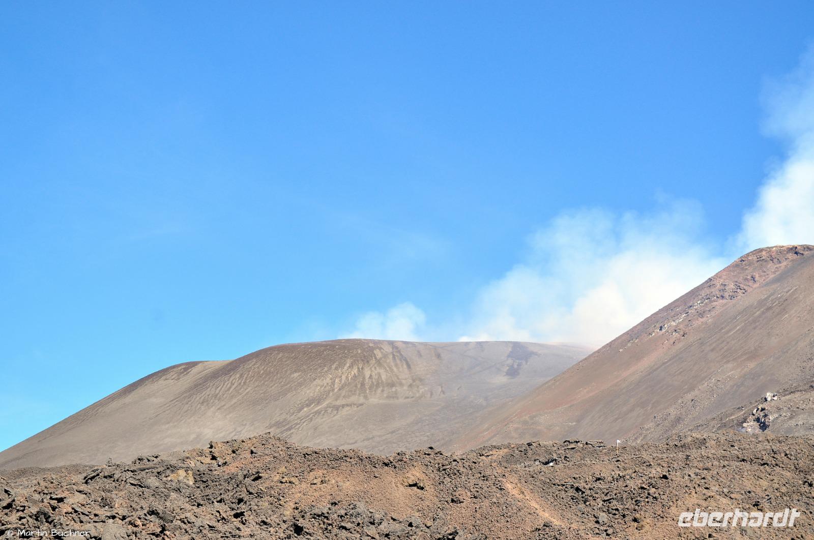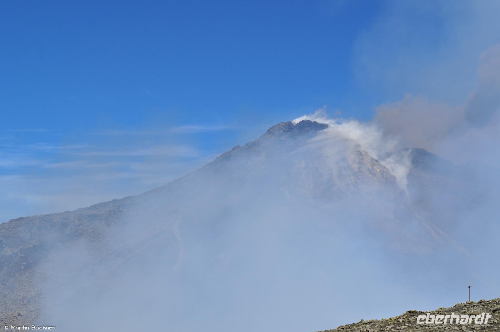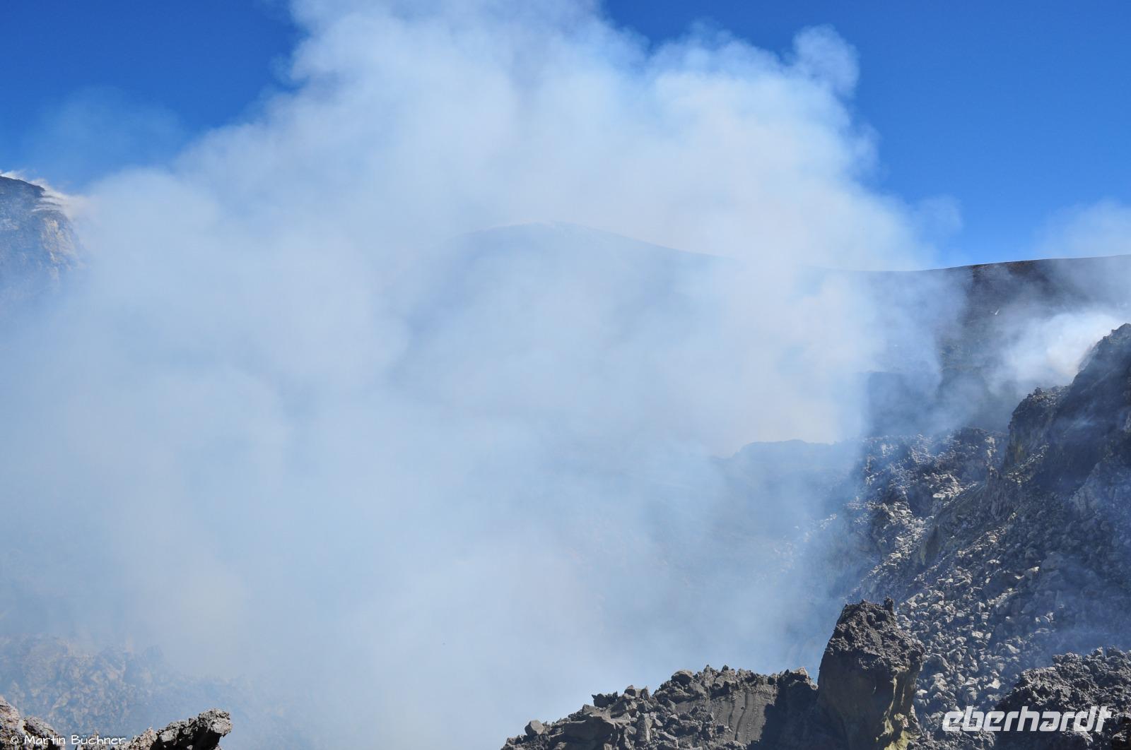 Wie bereits erwähnt gibt es heute an mehreren Hauptkratern starke Ausgasung, man versteht sofort, dass ist ein aktiver Vulkan. Wir haben sogar das Glück von etwas strombolianischer Aktivität, genauer gesagt einer strombolianischen Explosion, bei der etwas Lapilli mit ausgeworfen wird. Aufgrund des Tageslichts nimmt man jedoch nur Lavateile wahr, bei Dunkelheit hätten sie glutrot geleuchtet.