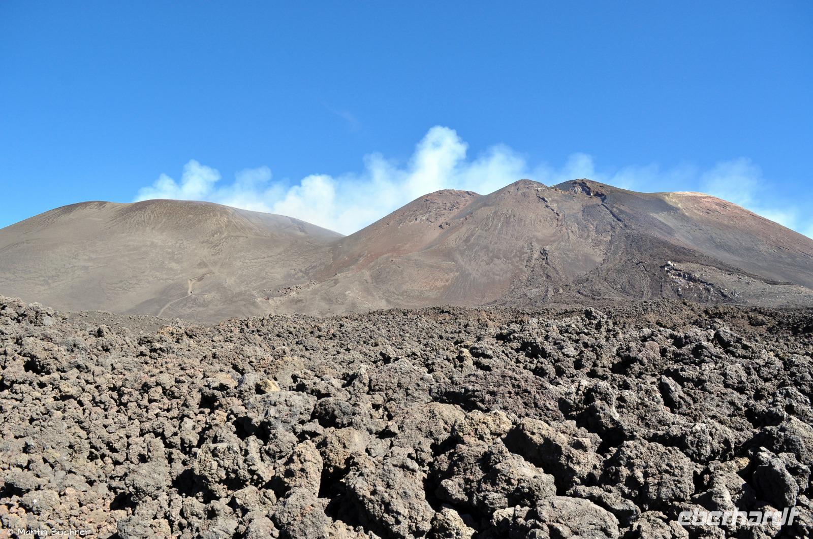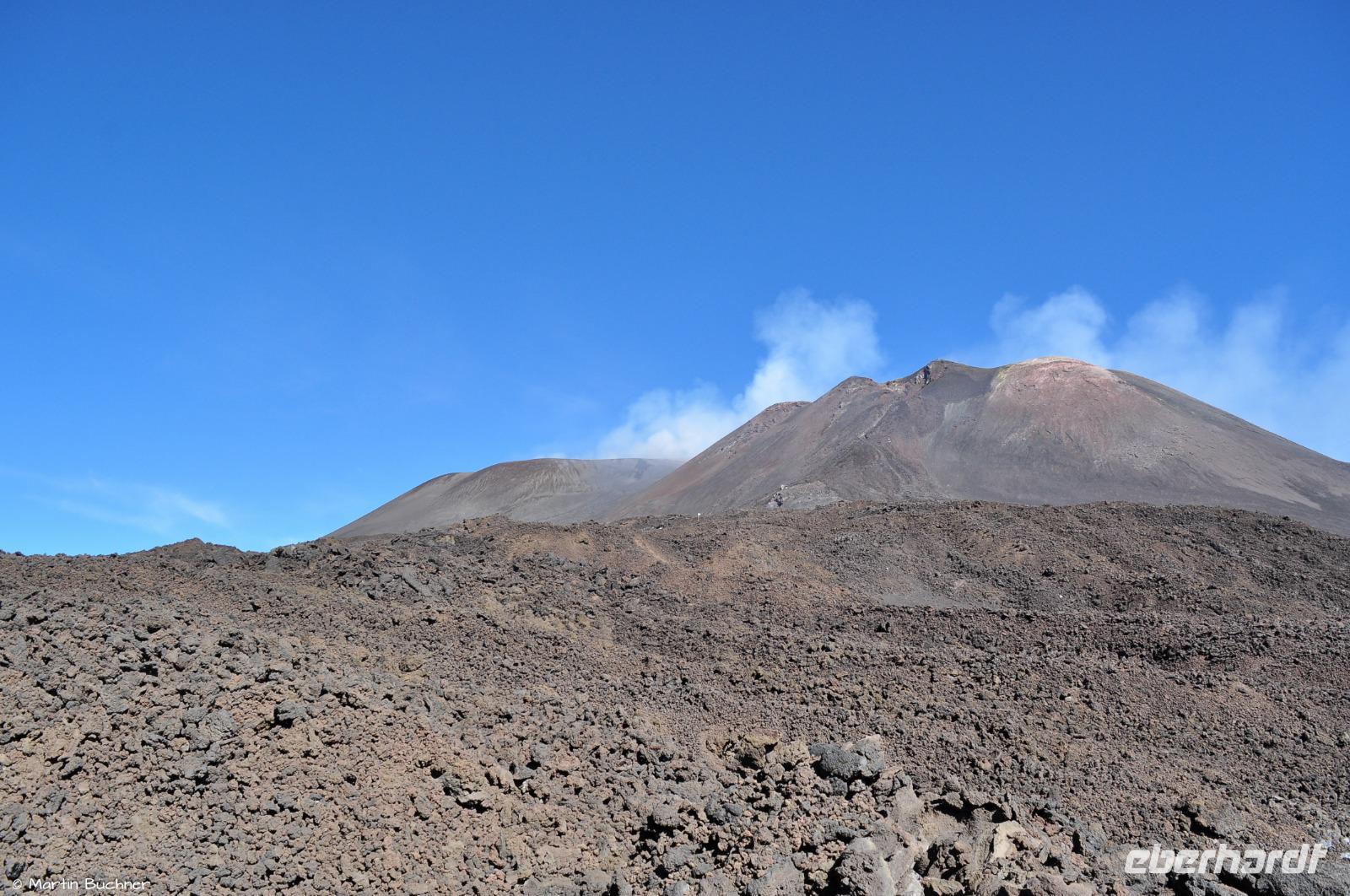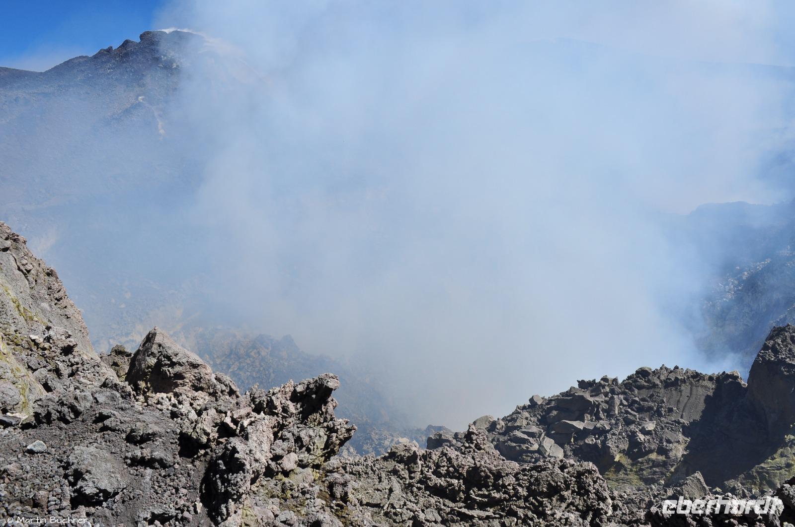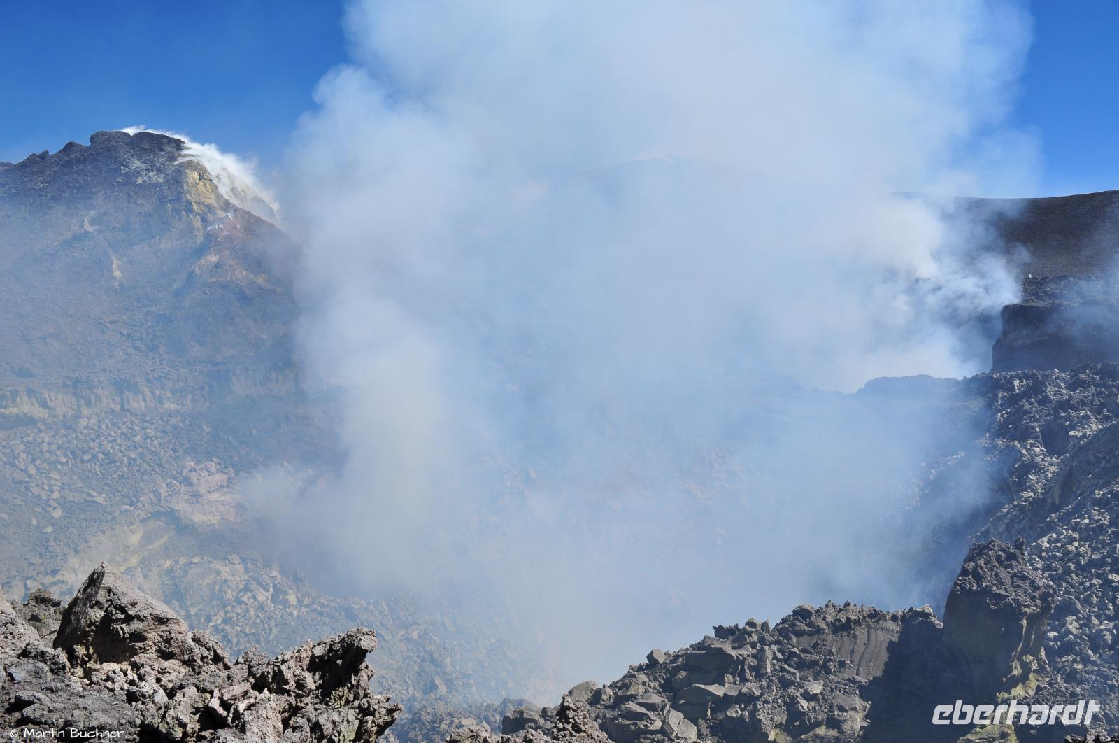 Wie bereits erwähnt gibt es heute an mehreren Hauptkratern starke Ausgasung, man versteht sofort, dass ist ein aktiver Vulkan. Wir haben sogar das Glück von etwas strombolianischer Aktivität, genauer gesagt einer strombolianischen Explosion, bei der etwas Lapilli mit ausgeworfen wird. Aufgrund des Tageslichts nimmt man jedoch nur Lavateile wahr, bei Dunkelheit hätten sie glutrot geleuchtet.