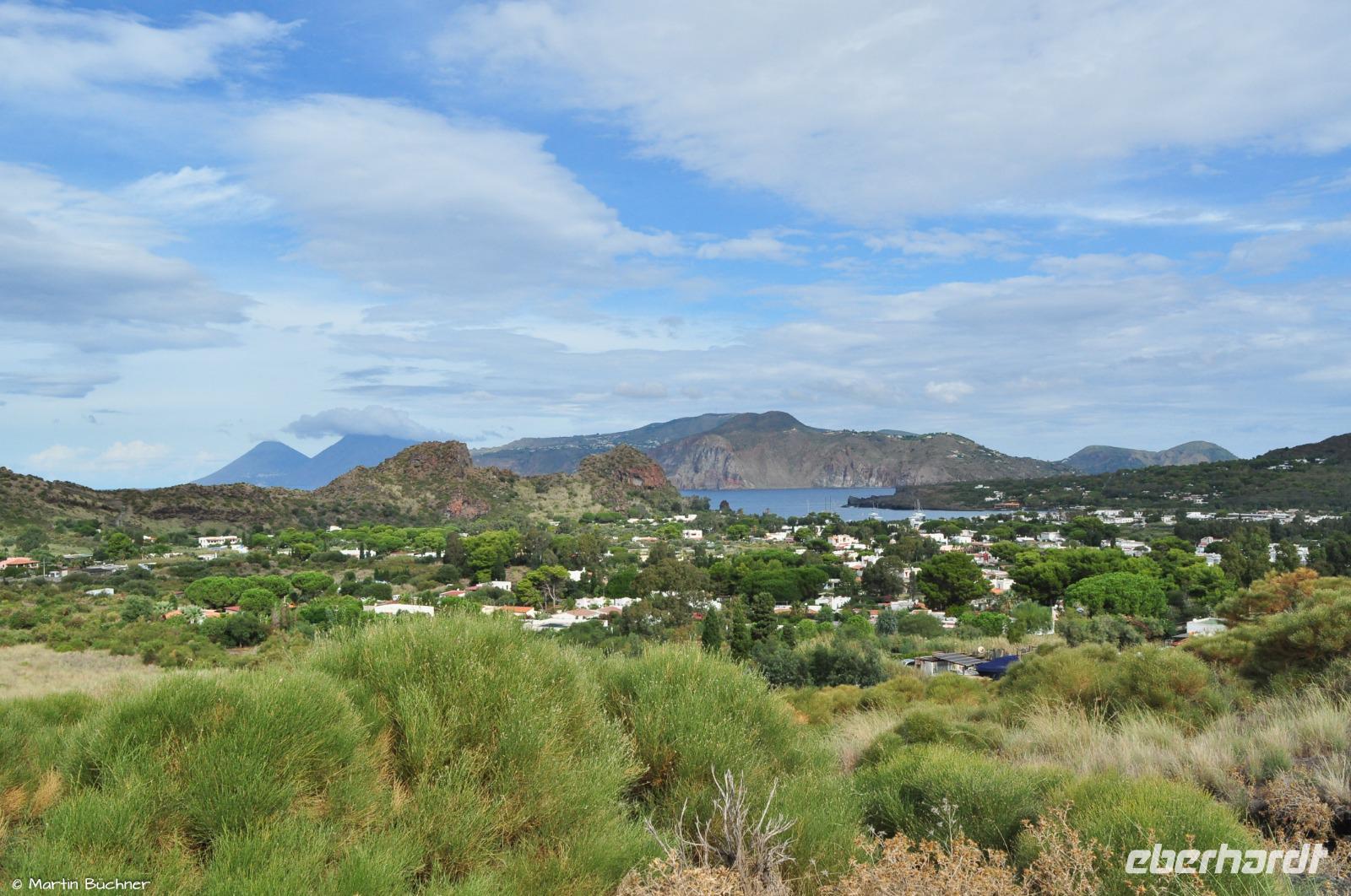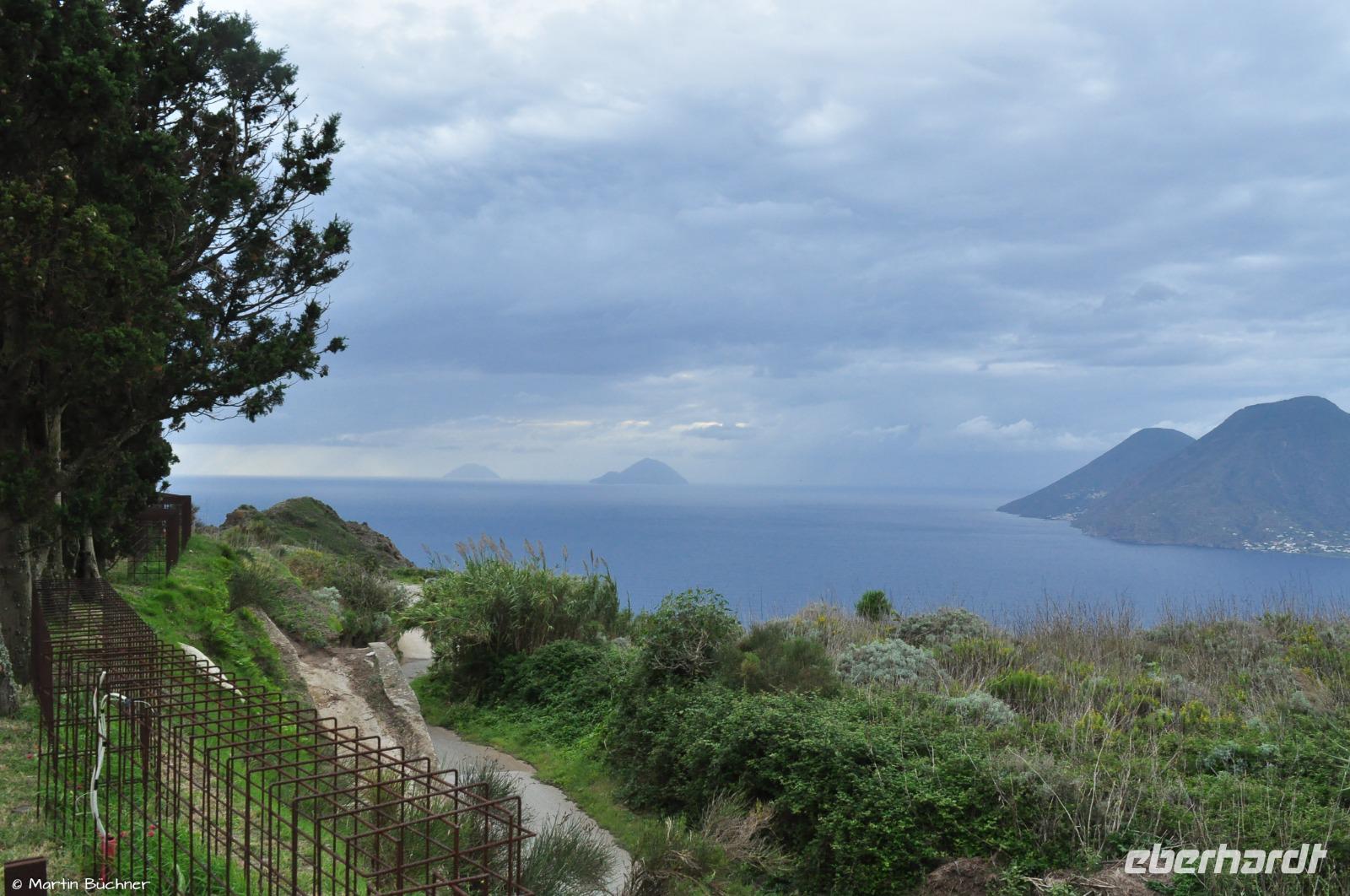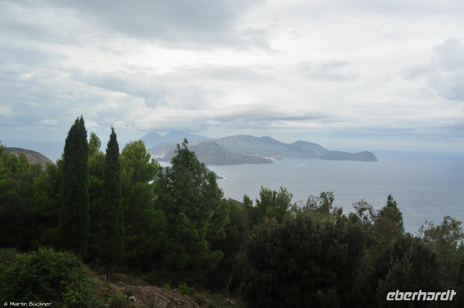 Nach der Weinverkostung mit unterirdischem Weinkeller geht es mit dem Bus weiter zu unserer Inselrundfahrt. Wir besuchen den Aussichtspunkt Quattropani, von hier erkennt man die Inseln Salina, Panarea und den Stromboli.