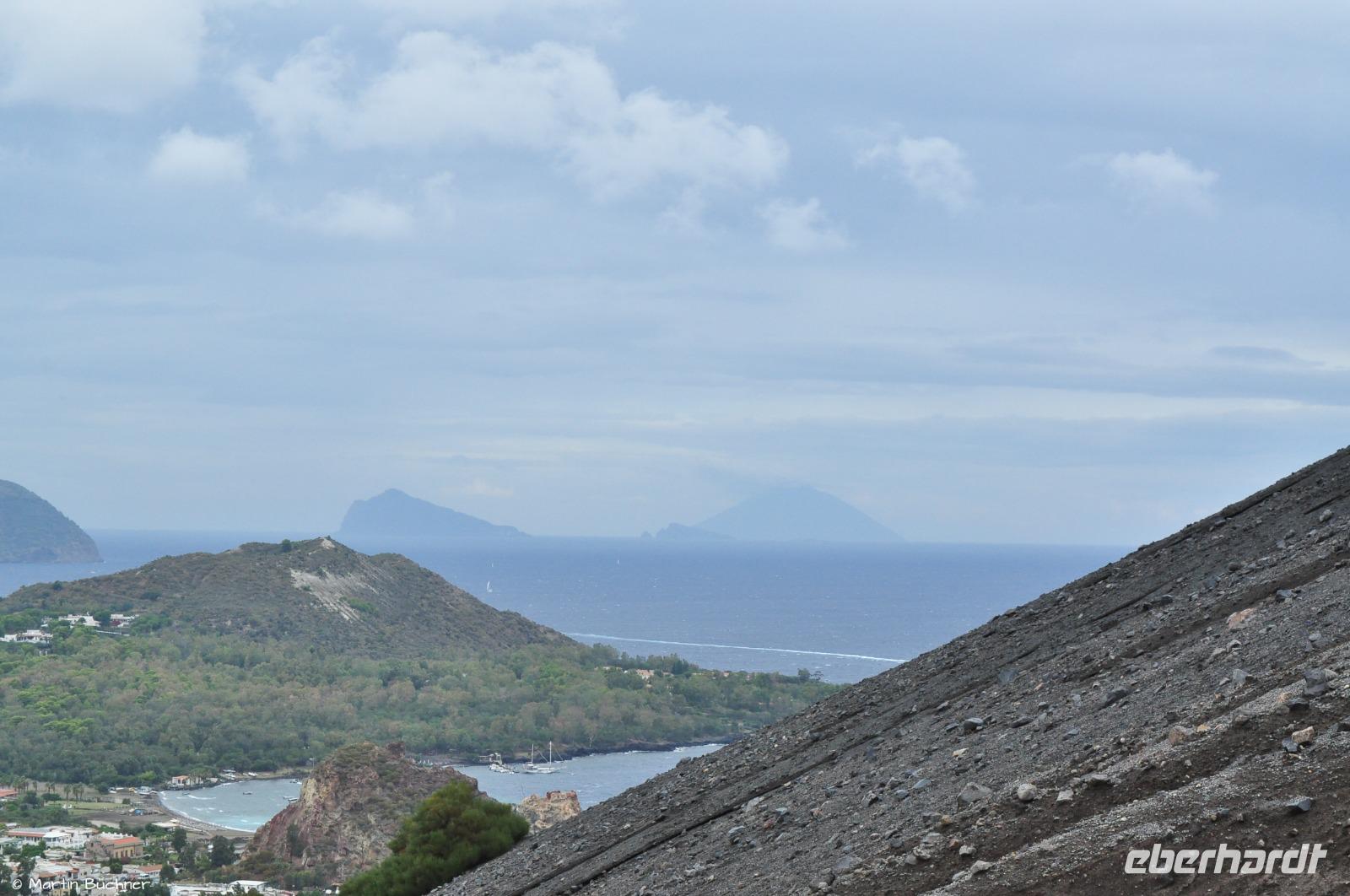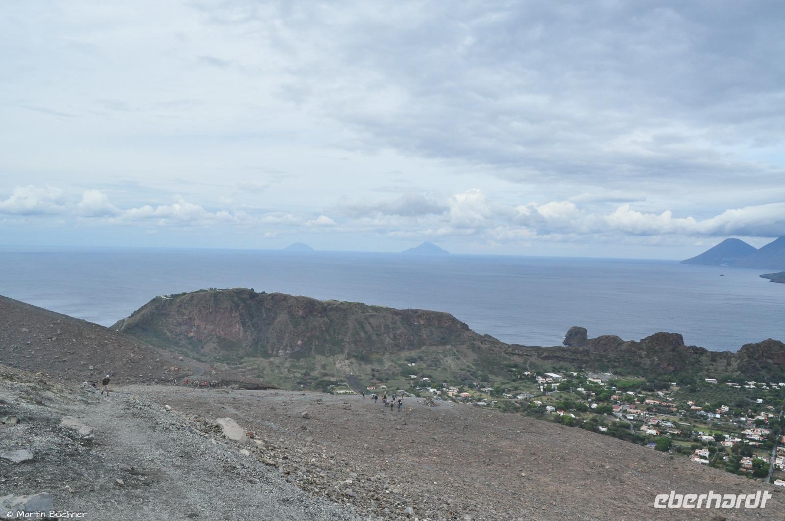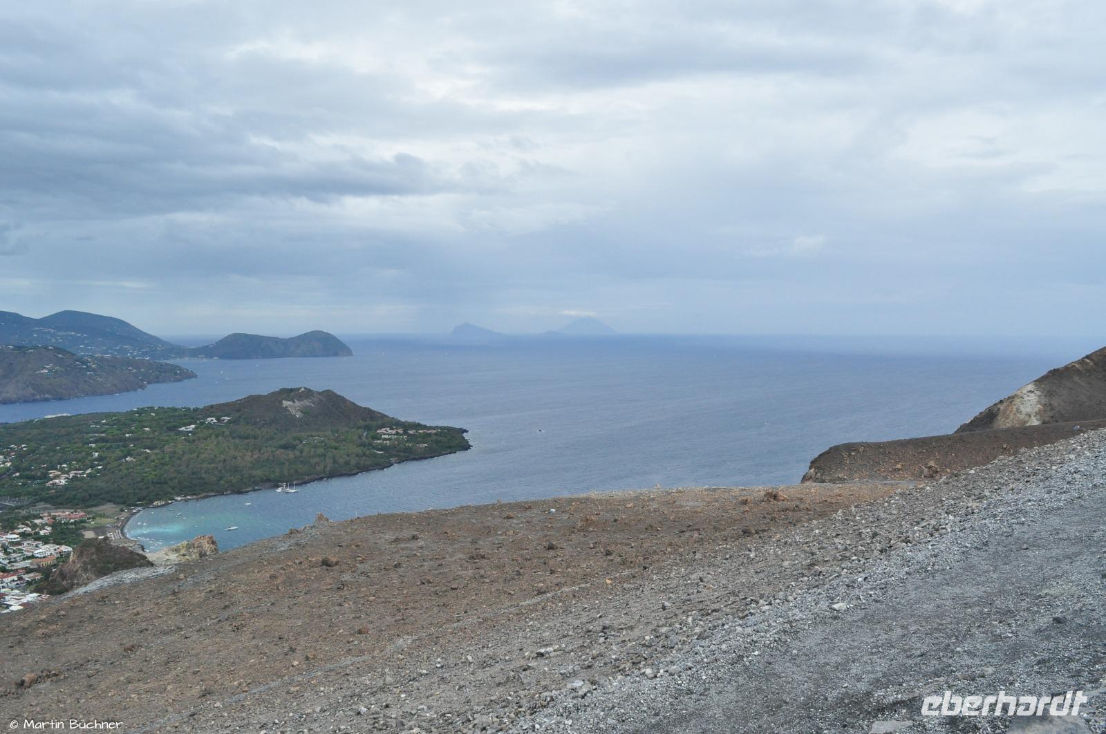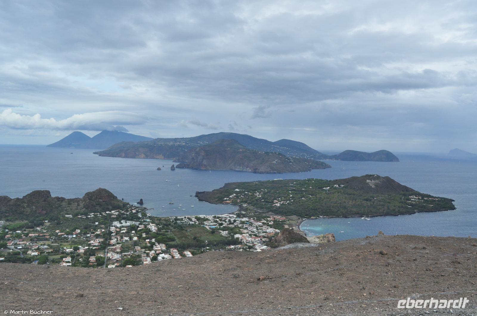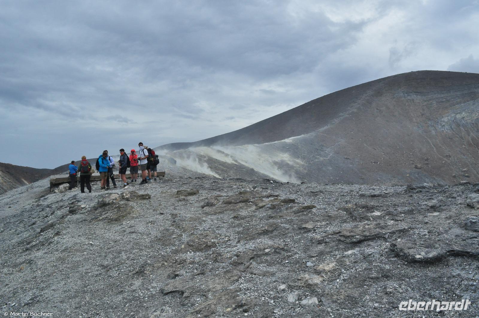 Wir steigen auf bis zum Kraterrand, man nimmt sofort die stark schwefelhaltigen und ätzenden Fumarolen wahr. Es gibt einen fantastischen Blick über alle Inseln des Archipels von links nach rechts: Alicudi, Filicudi, Salina, Lipari, Panarea und Stromboli.