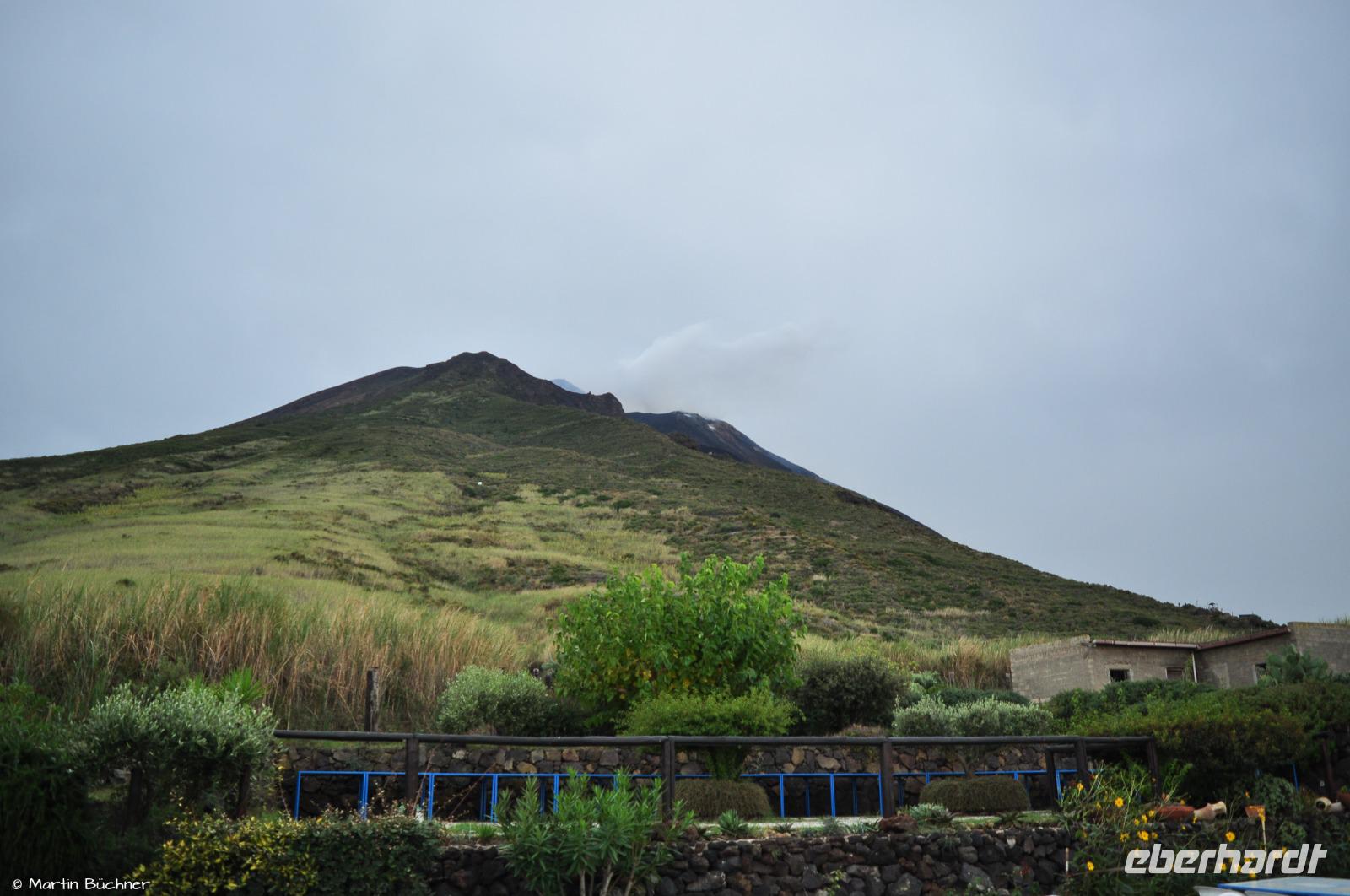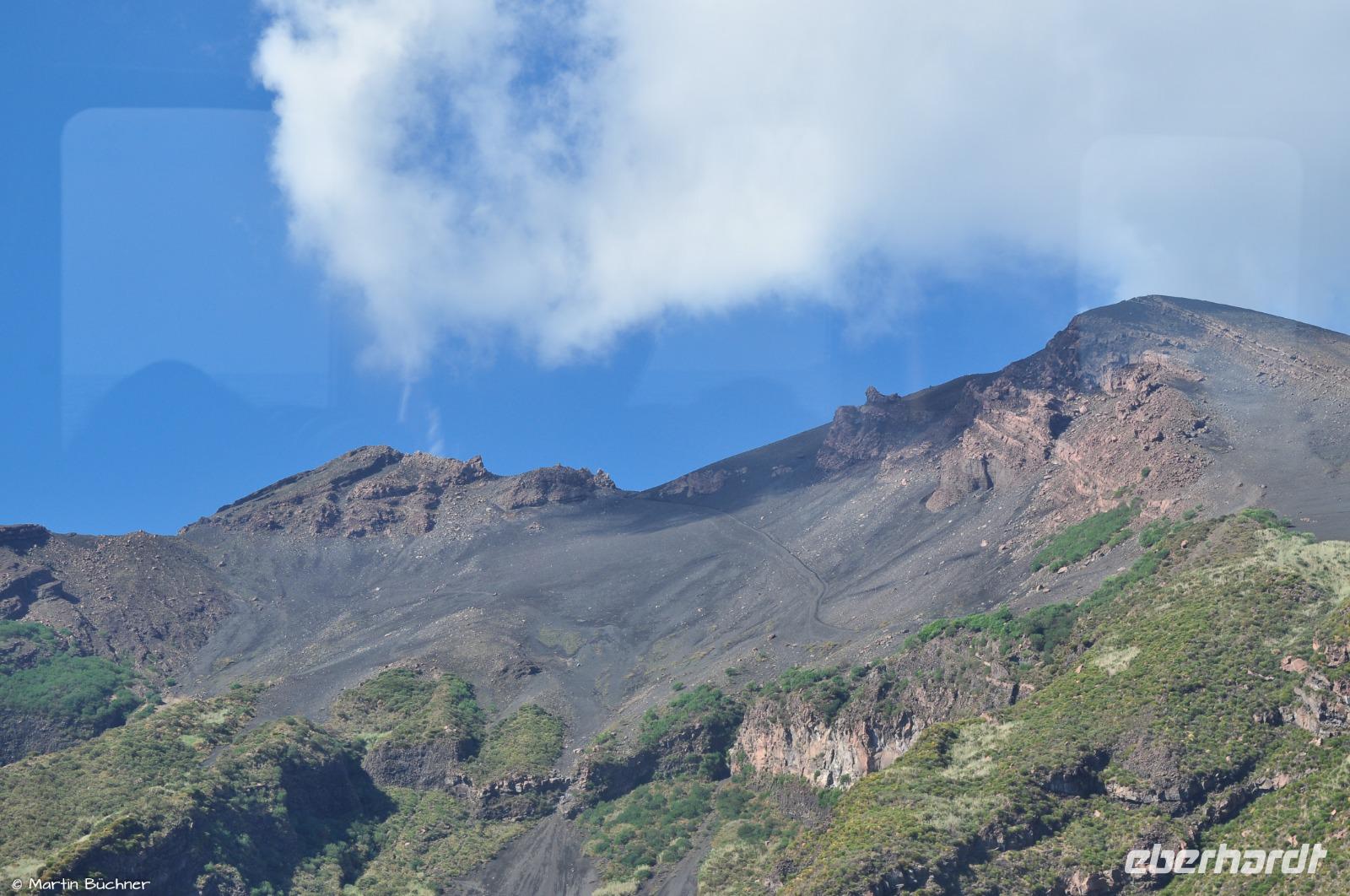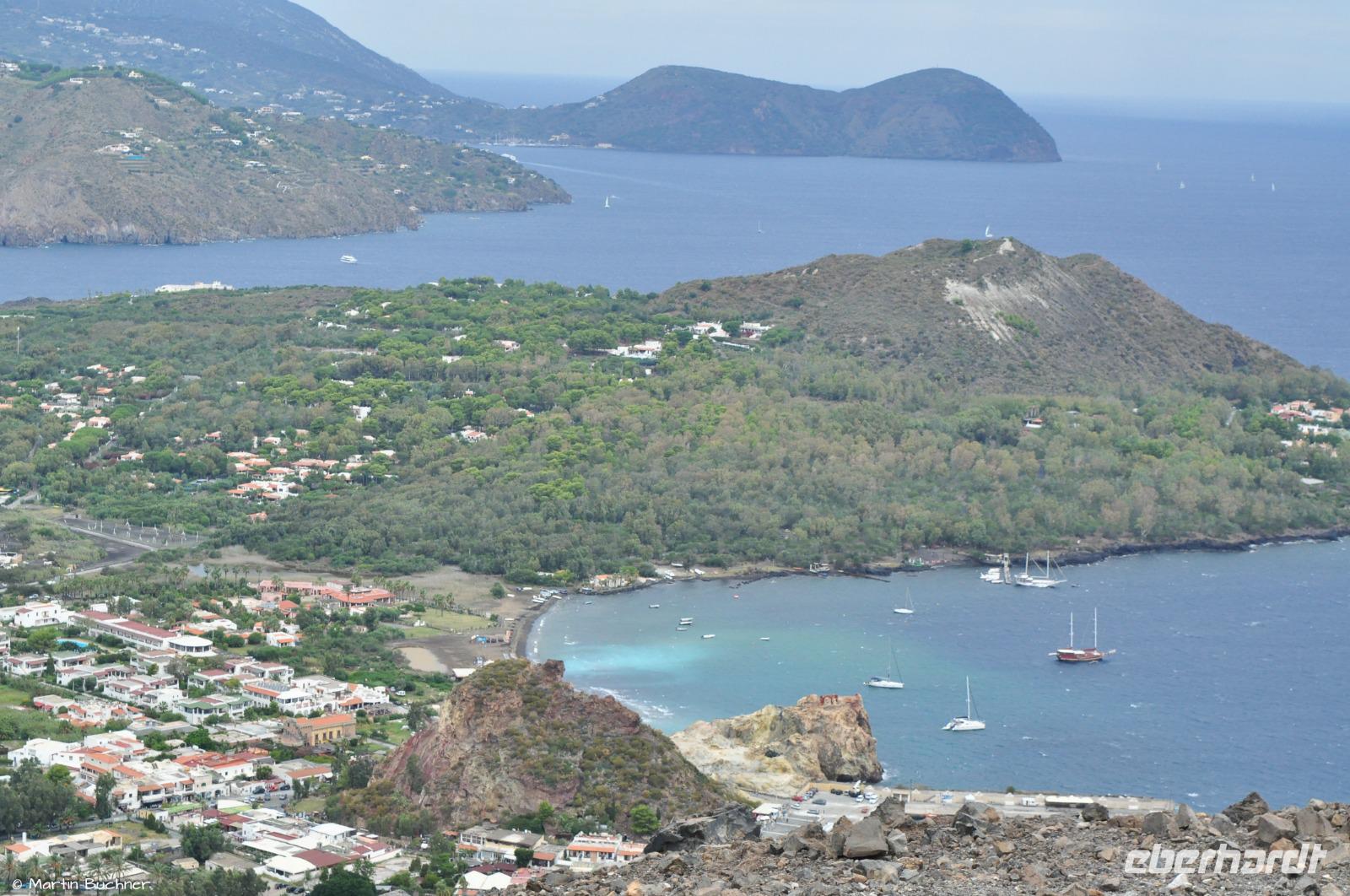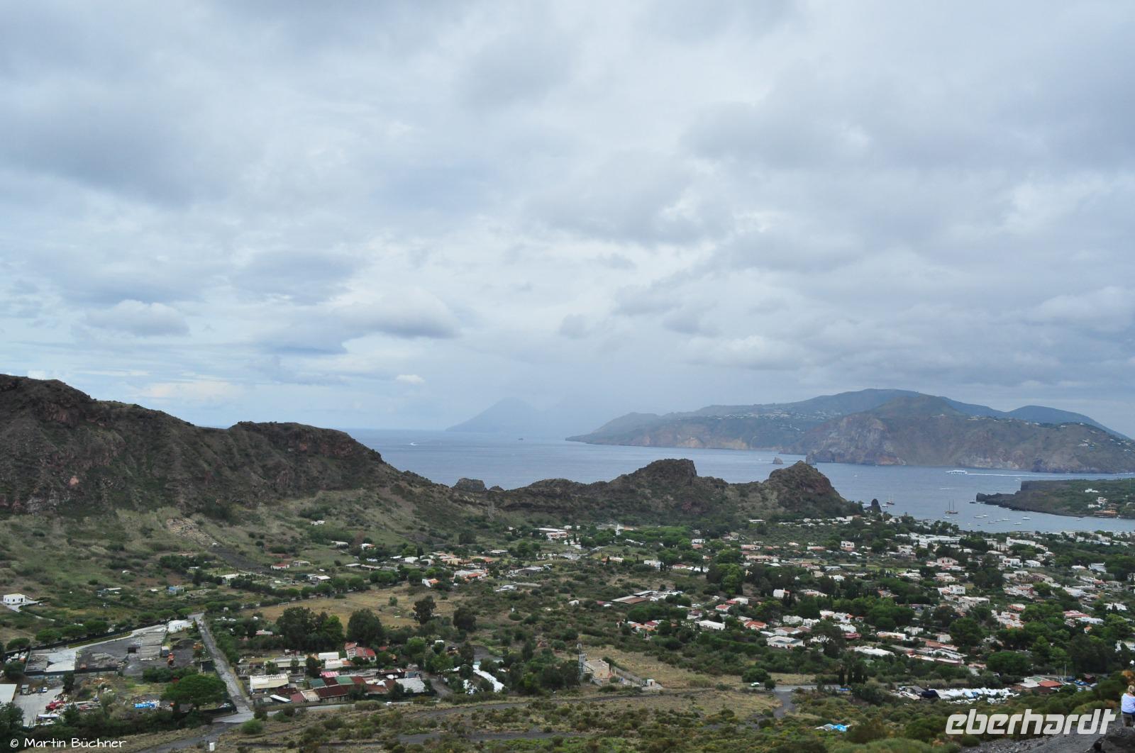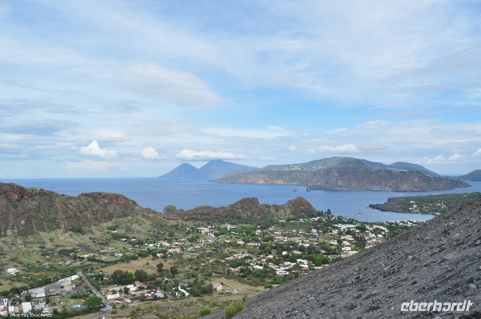 Wir steigen auf bis zum Kraterrand, man nimmt sofort die stark schwefelhaltigen und ätzenden Fumarolen wahr. Es gibt einen fantastischen Blick über alle Inseln des Archipels von links nach rechts: Alicudi, Filicudi, Salina, Lipari, Panarea und Stromboli.
